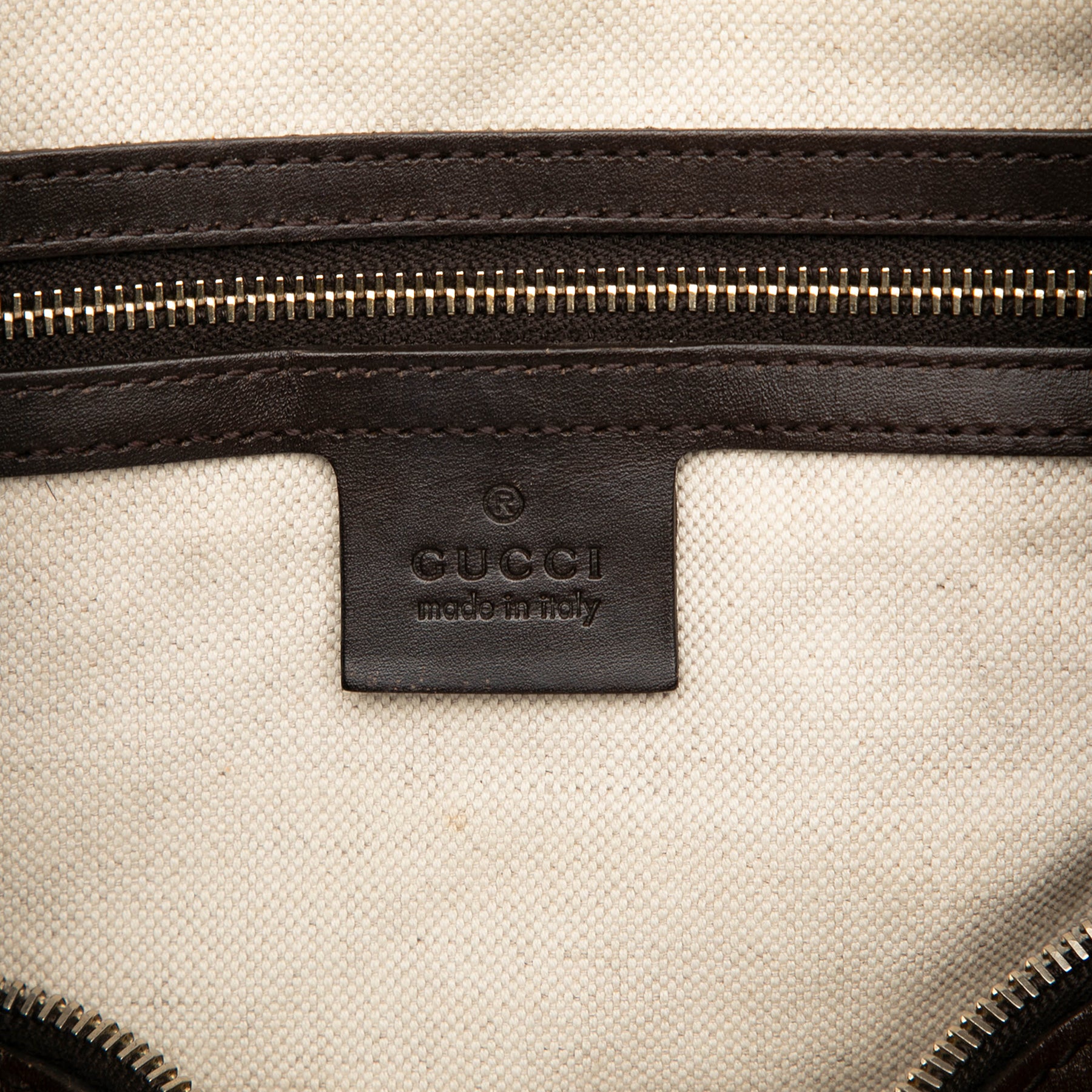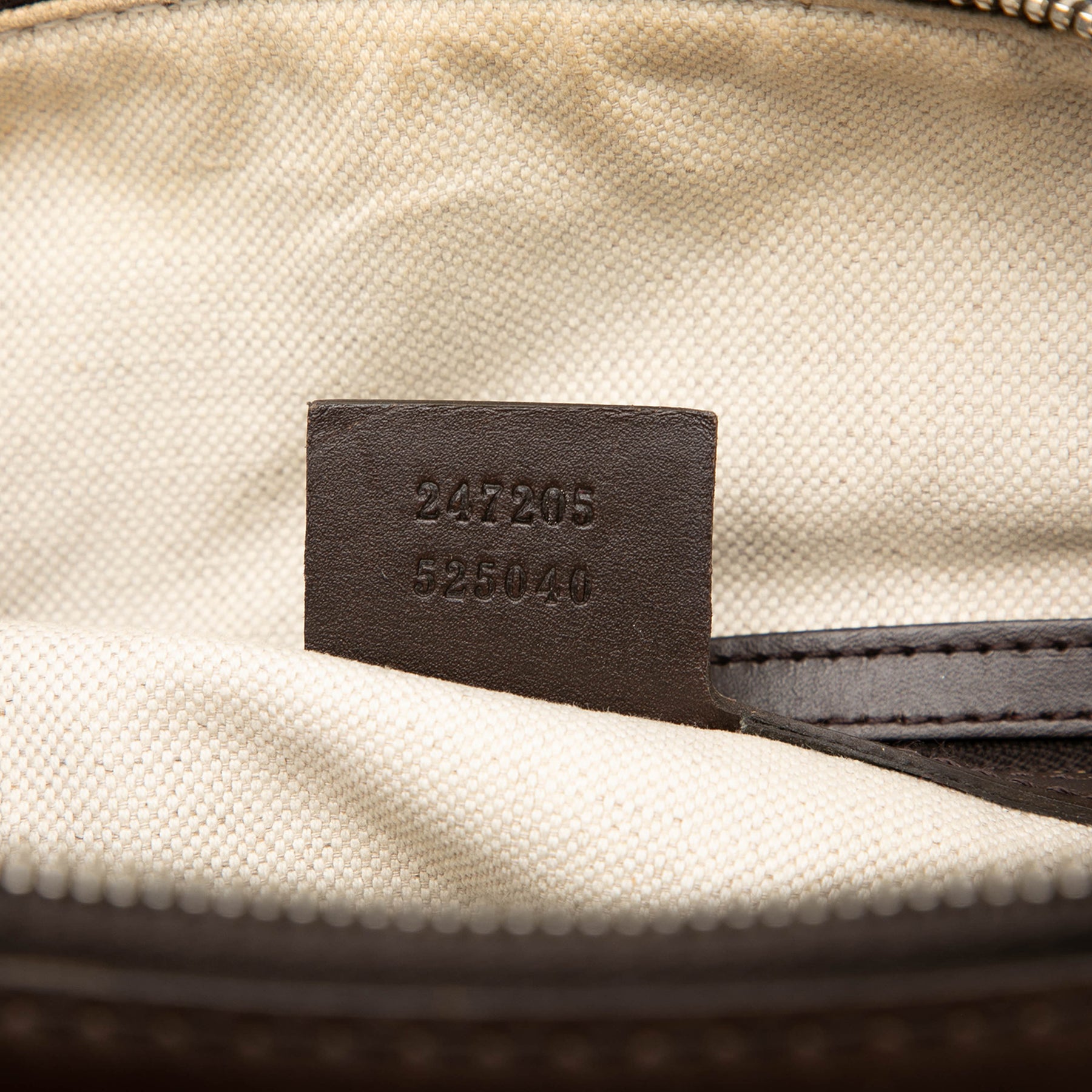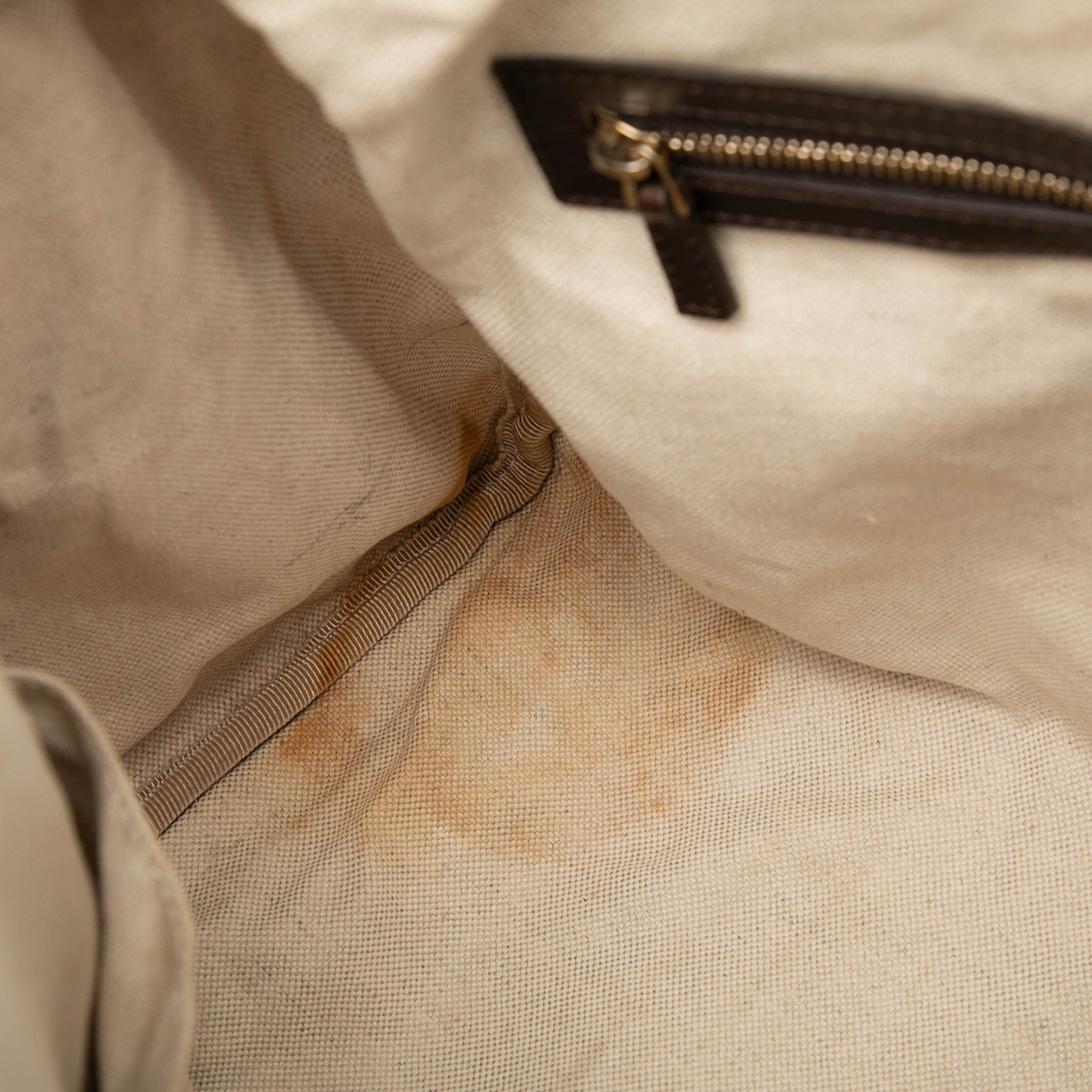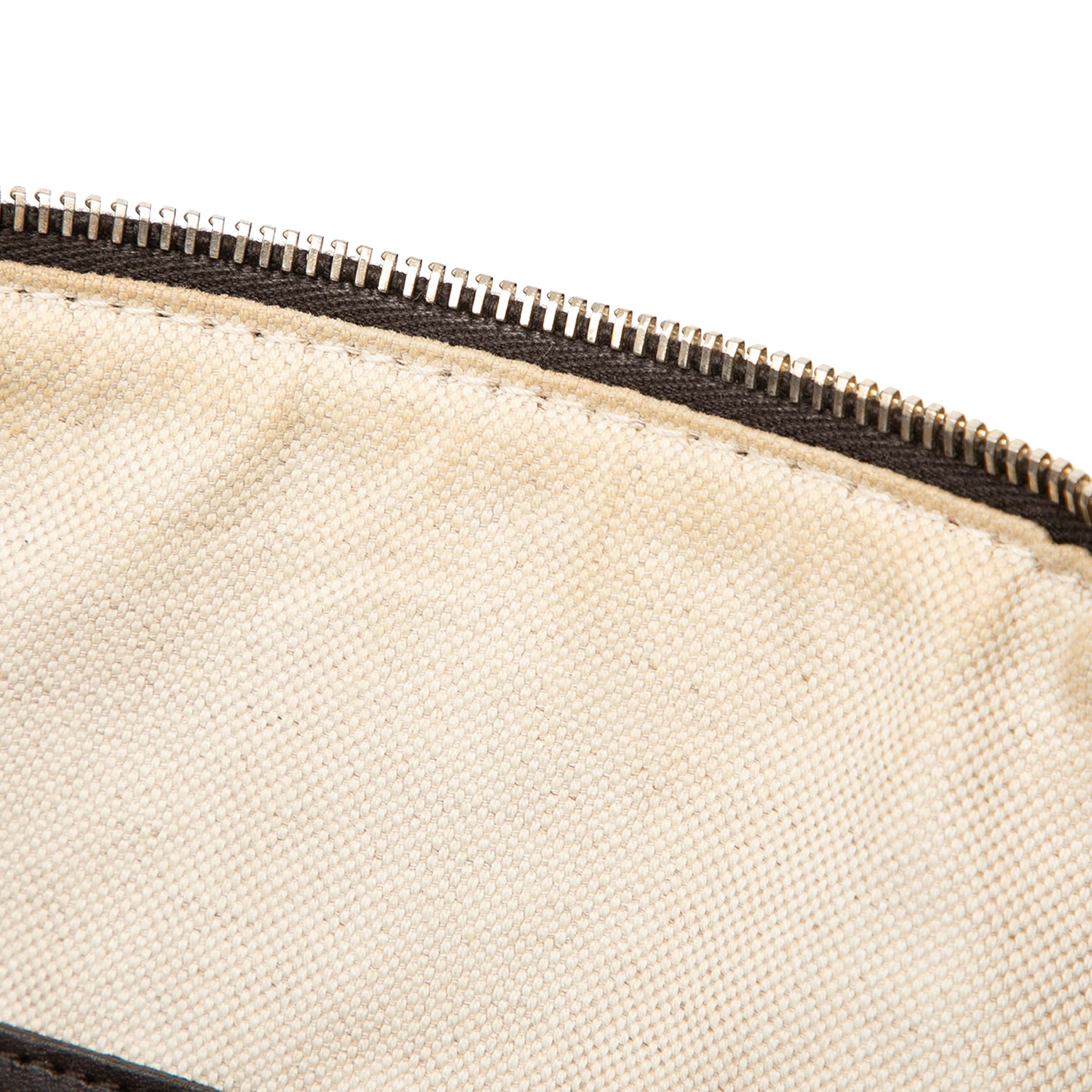 Ce sac à main est en toile avec des finitions en cuir et des détails en toile, des anses roulées en cuir, une bandoulière plate amovible en cuir, une fermeture zippée sur le dessus et des poches intérieures zippées et plaquées. Il est en bon état.