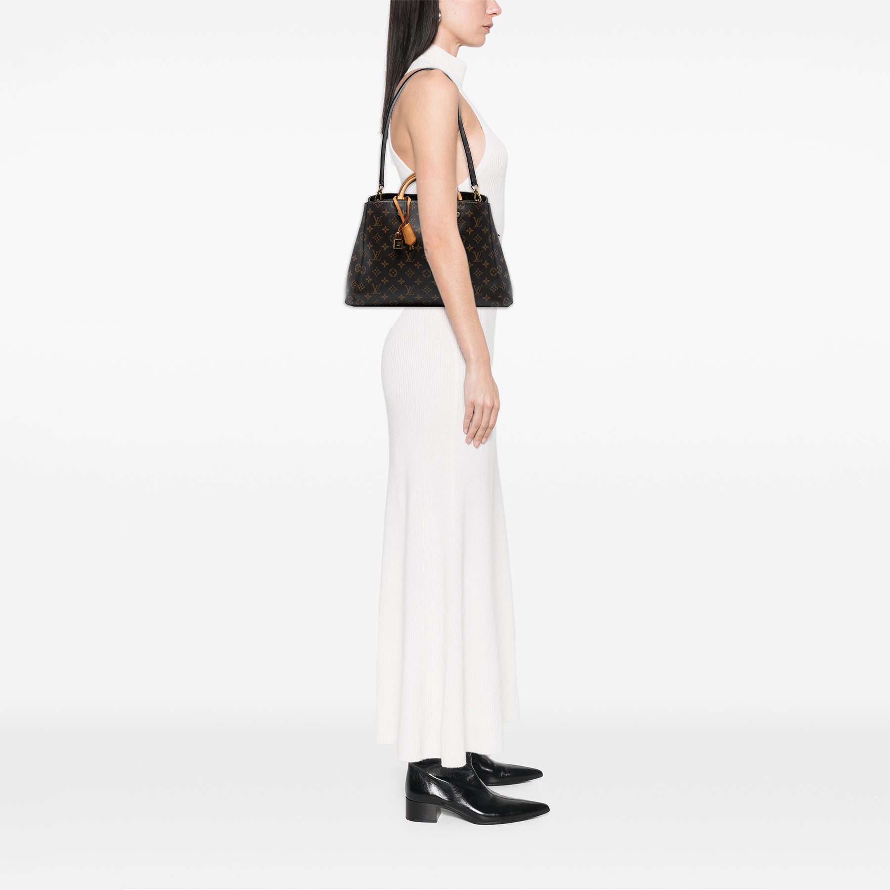 Le sac Montaigne GM est doté d'une toile monogrammée, de poignées roulées en cuir vachetta, d'une bandoulière amovible, d'une ouverture sur le dessus avec fermeture à fermoir, ainsi que de poches intérieures zippées et plaquées. Il est en bon état.