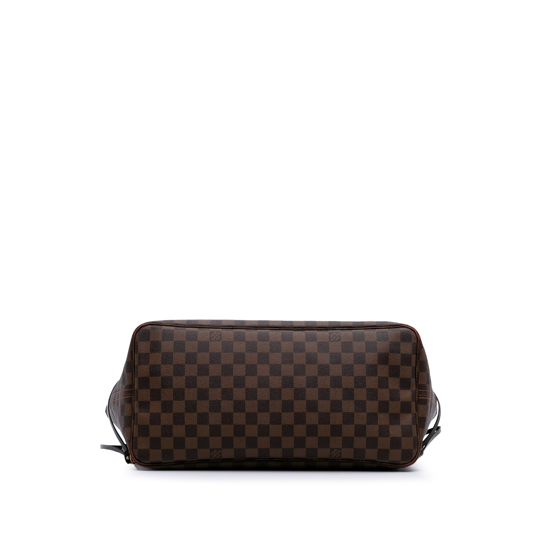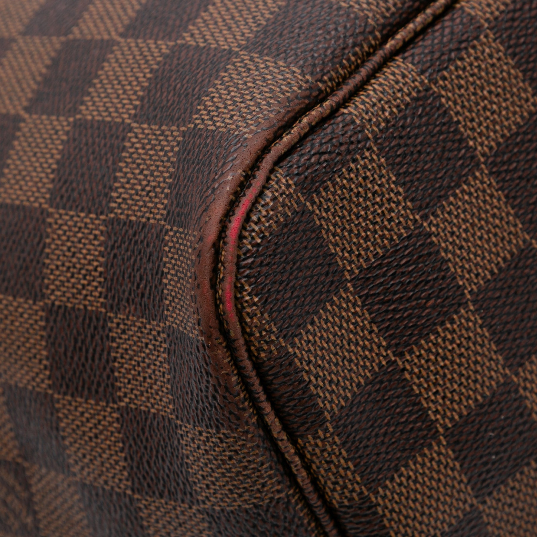 Le sac Neverfull GM est confectionné en toile Damier Ébène avec des finitions en cuir, des bandoulières plates en cuir, une ouverture sur le dessus avec fermeture à mousqueton et une poche intérieure zippée. Il est en bon état.