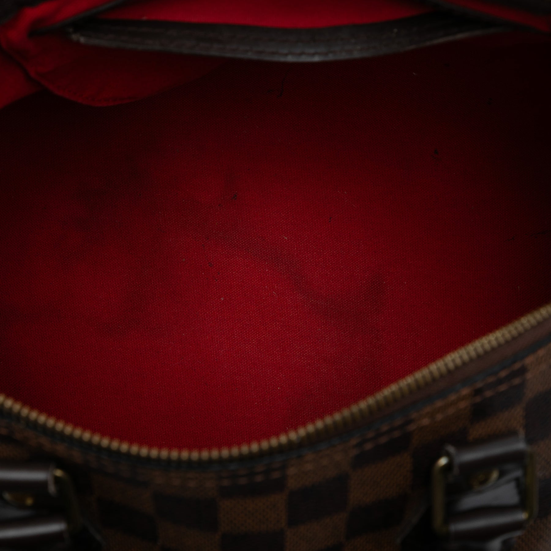 Le Speedy 30 est confectionné en toile Damier Ébène avec des finitions en cuir, des anses roulées en cuir, une fermeture zippée sur le dessus et une poche intérieure plaquée. Il est en bon état.