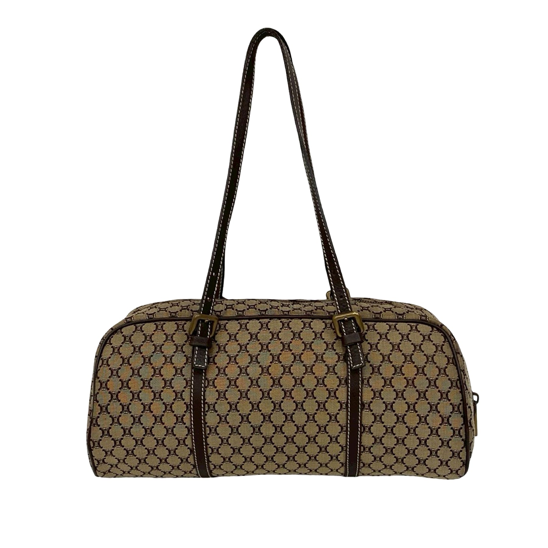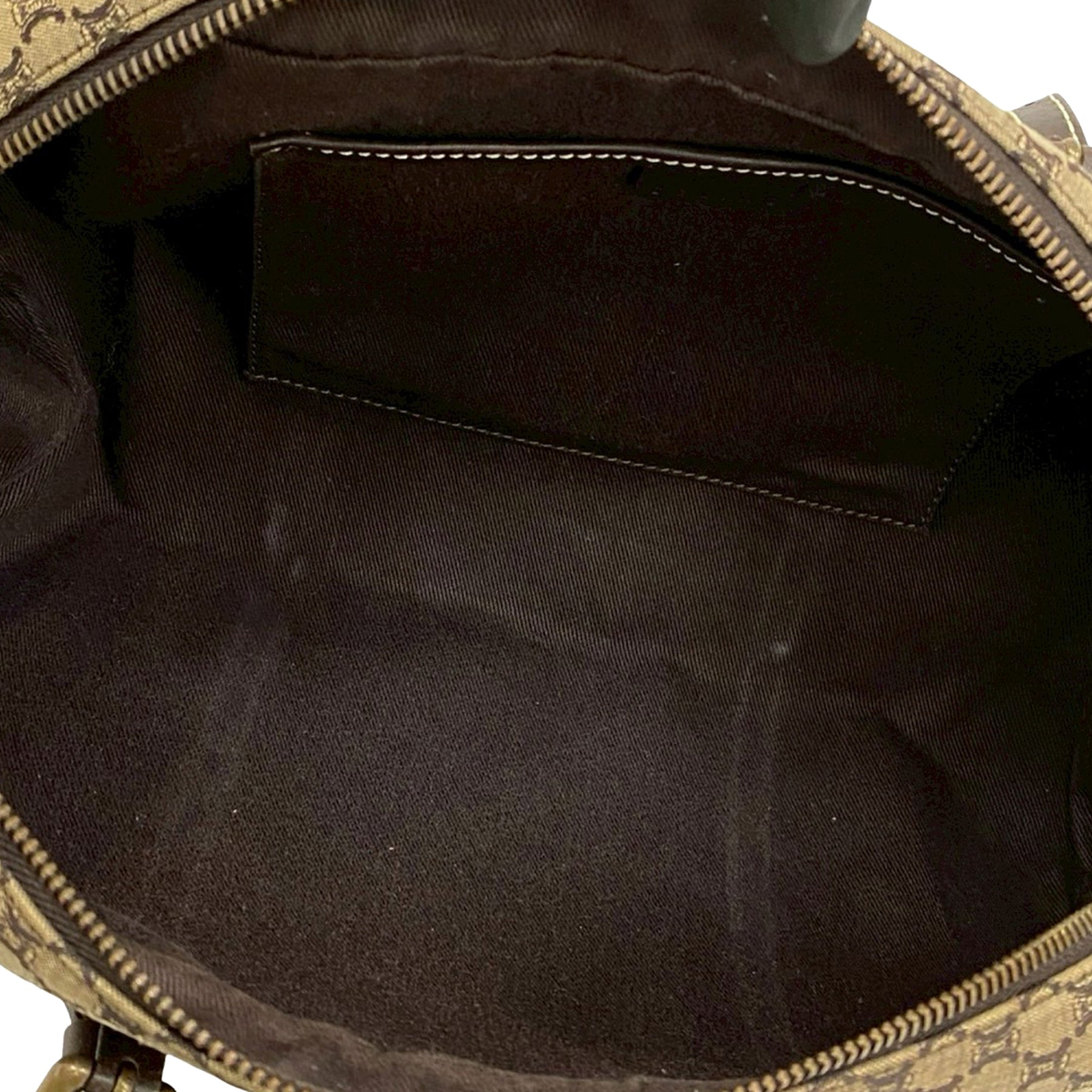 Ce sac bandoulière est en toile avec des finitions en cuir, des anses plates en cuir, une fermeture zippée sur le dessus et une poche intérieure plaquée. Il est en excellent état.