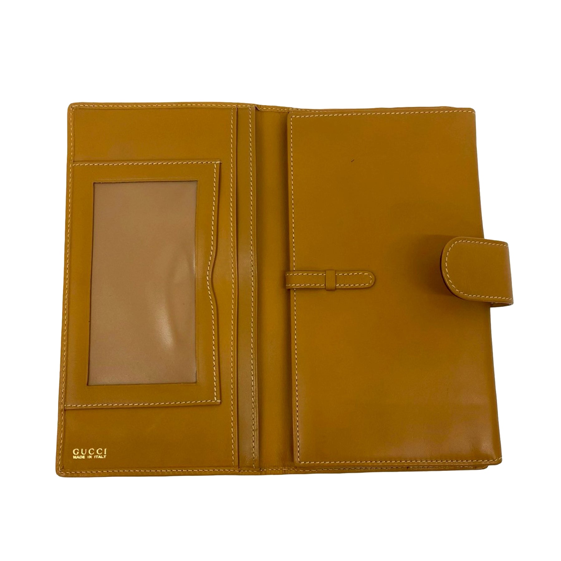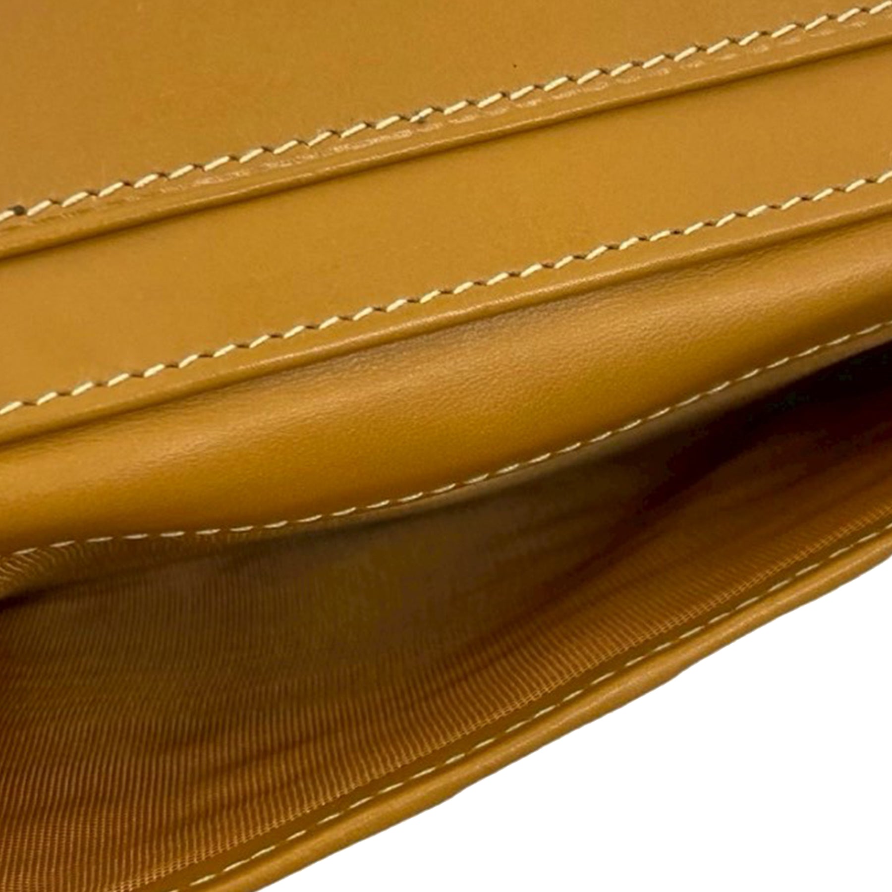 Ce portefeuille en toile et cuir est doté d'un compartiment à fermeture baiser, d'un format portefeuille avec bandoulière et de poches intérieures plaquées. Il est en bon état.