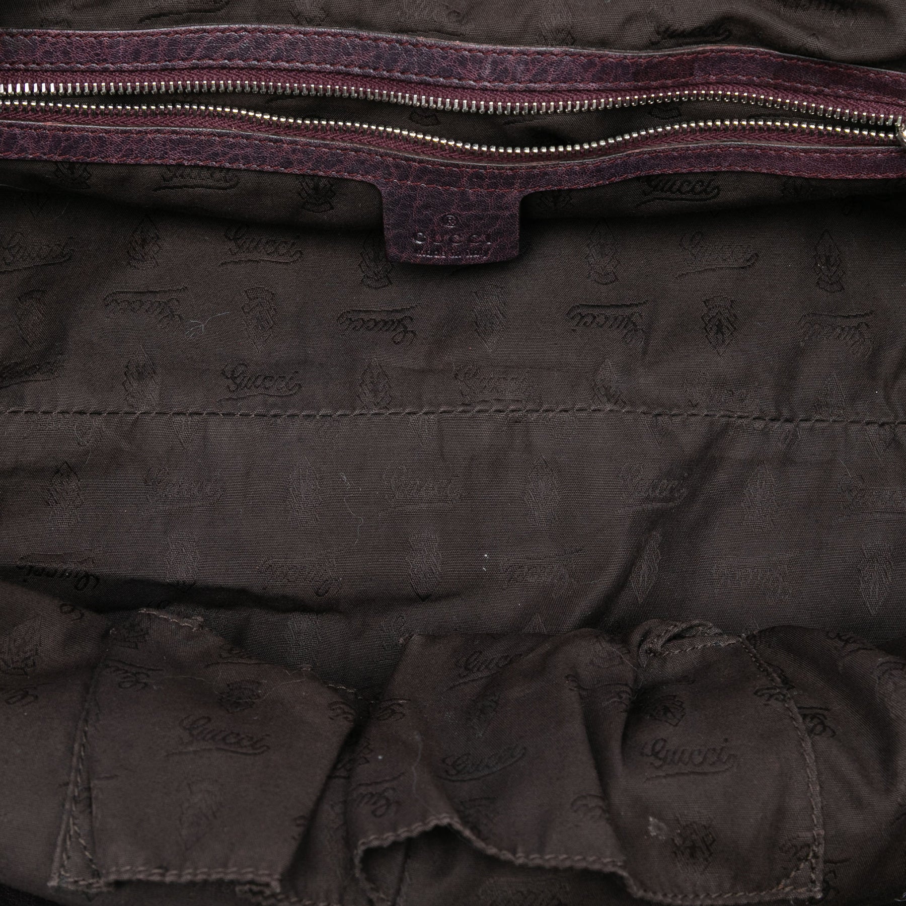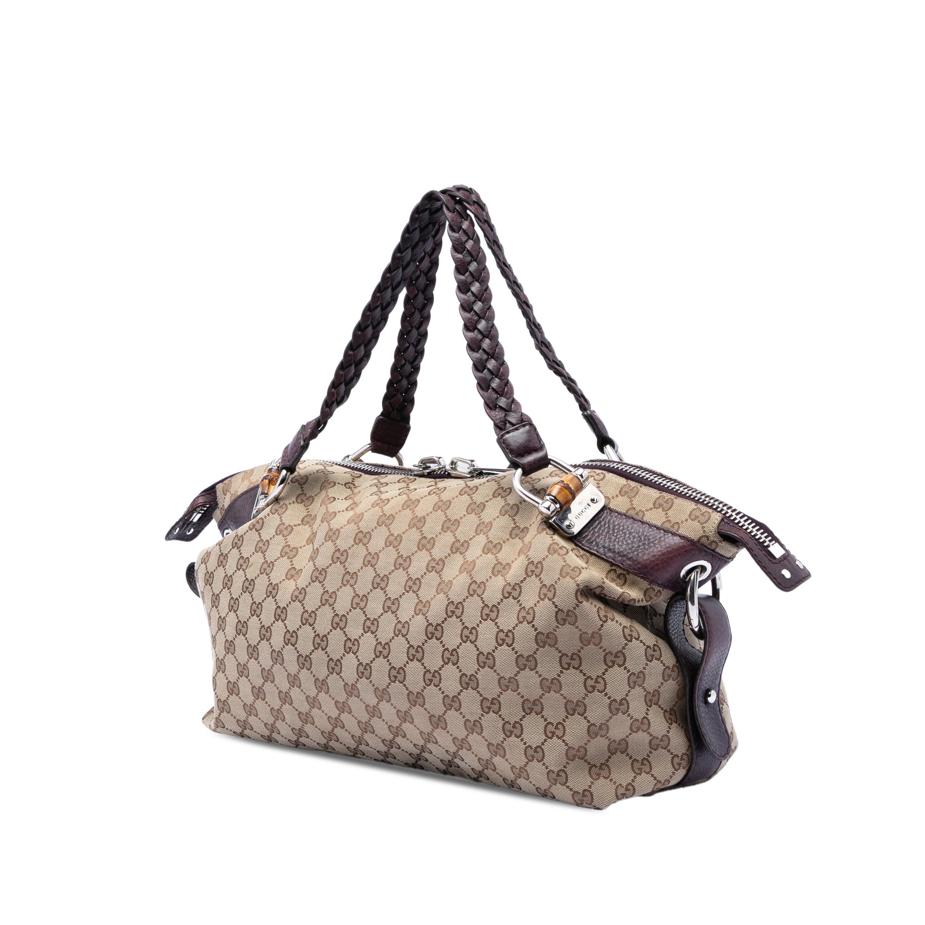 Ce sac cabas est en toile avec des finitions en cuir, des anses en cuir tressé, une fermeture éclair à double sens et des poches intérieures zippées et plaquées. Il est en excellent état.