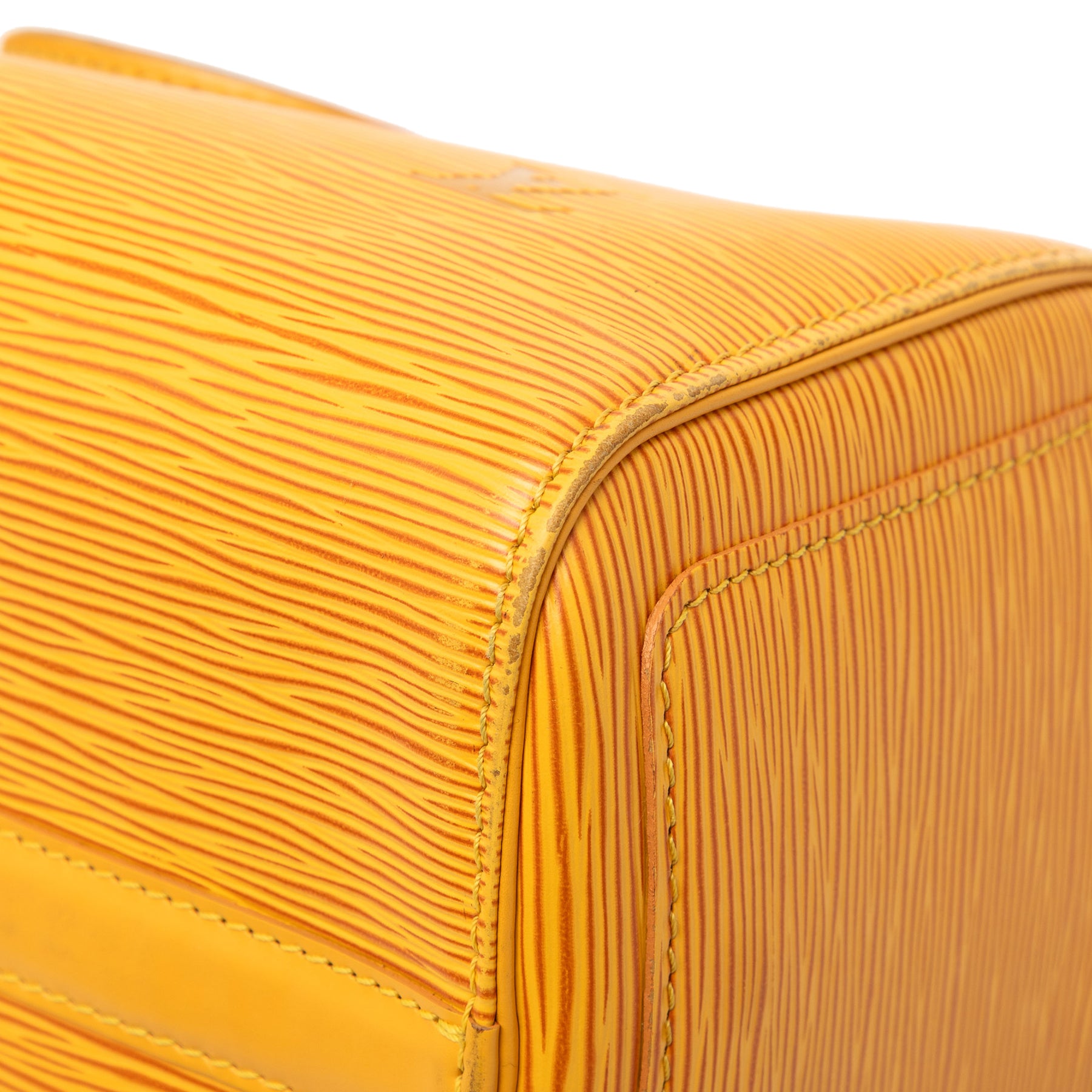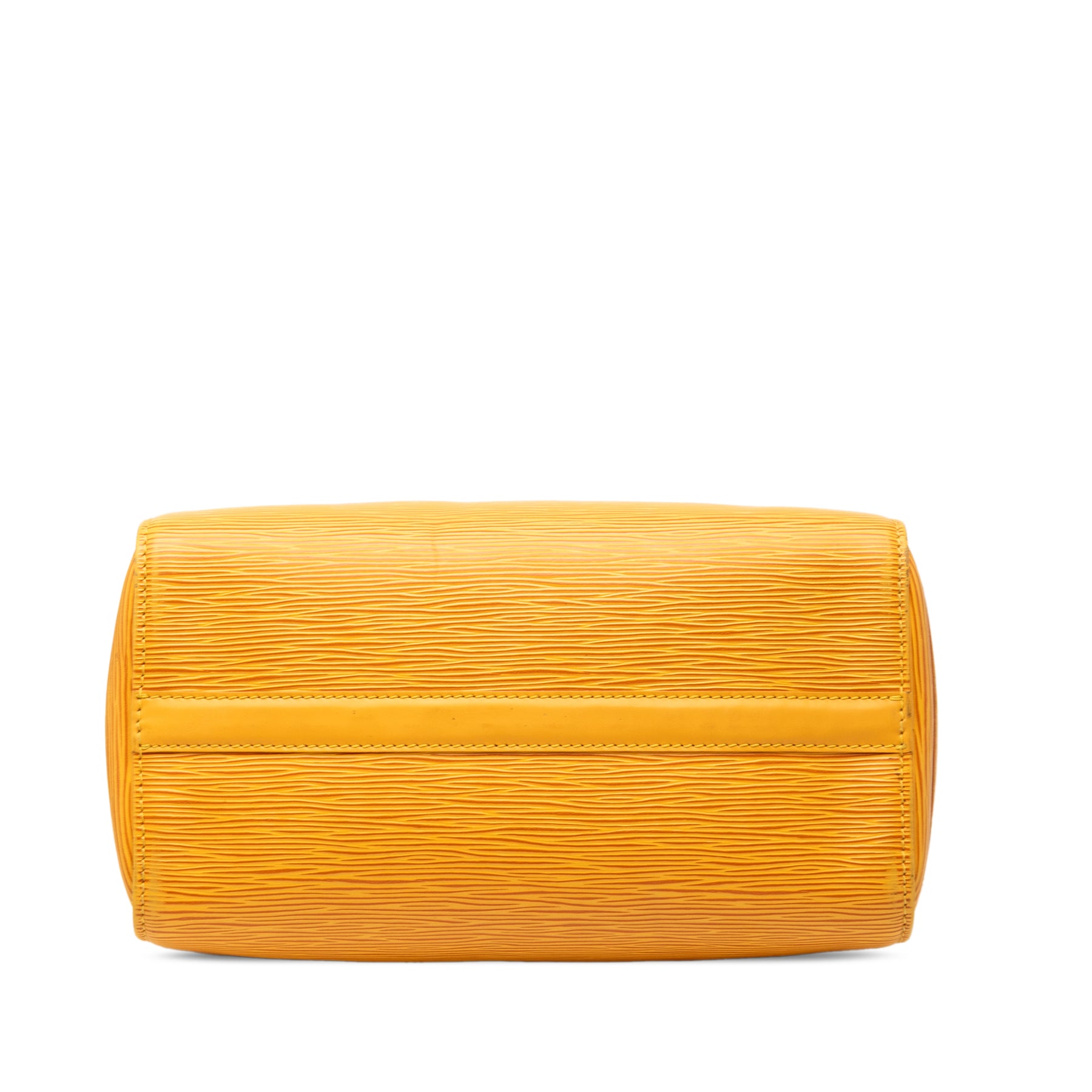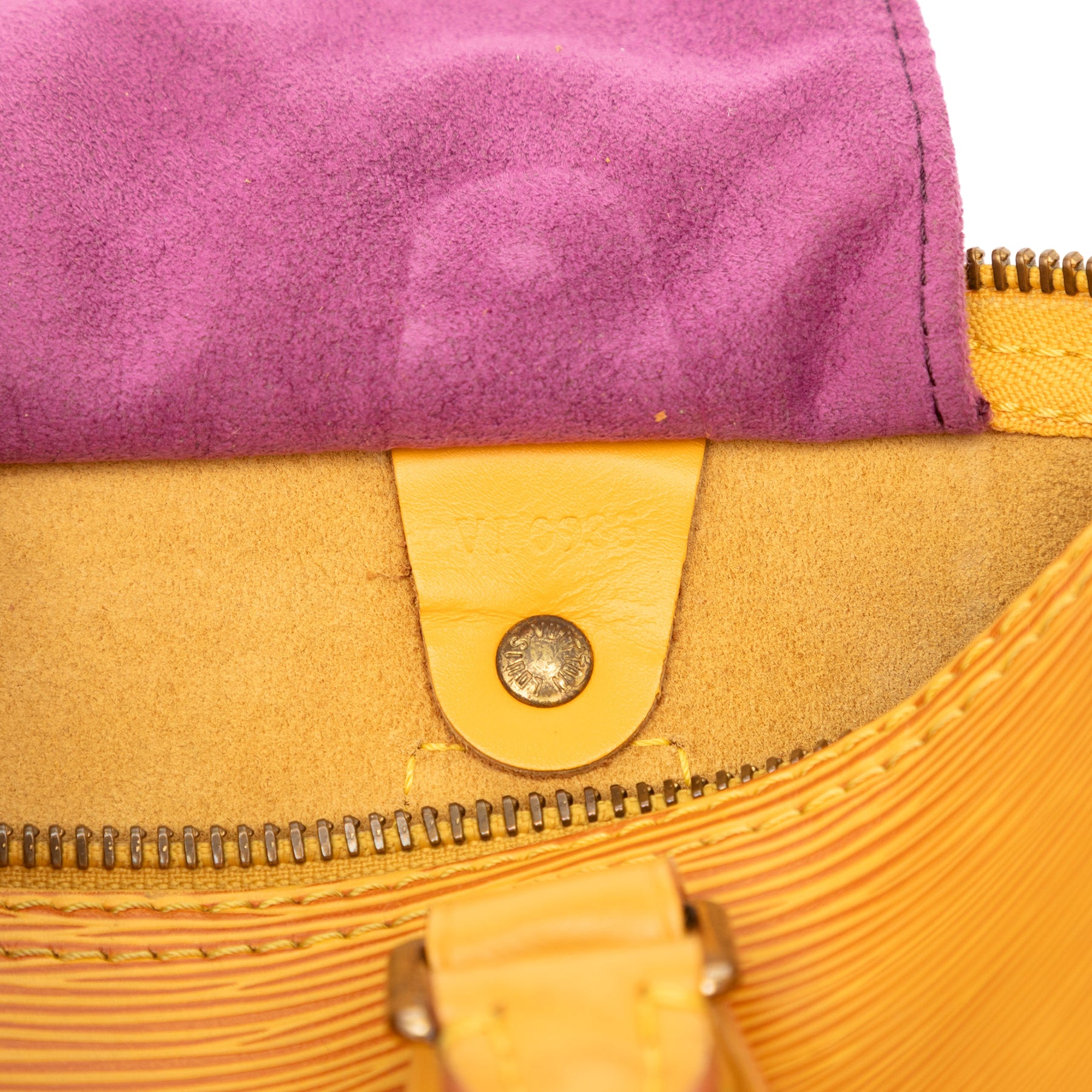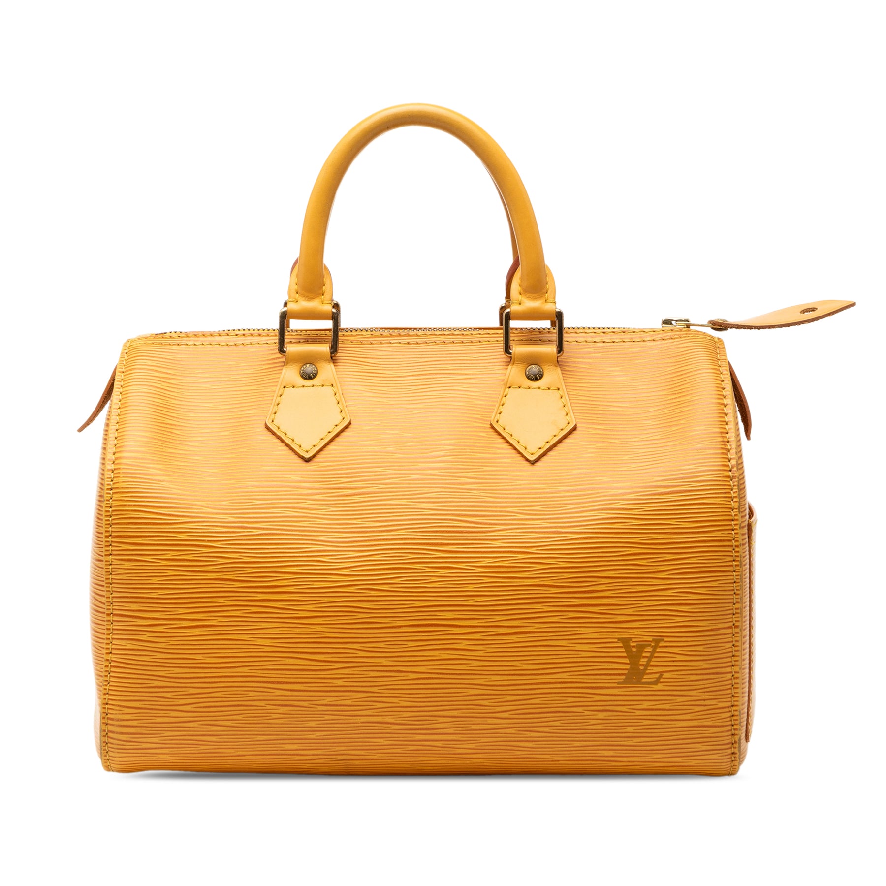 Le Speedy 25 est doté d'un corps en cuir Epi, de poignées roulées, d'une fermeture zippée sur le dessus, d'une poche extérieure plaquée et d'une poche intérieure plaquée. Il est en bon état.