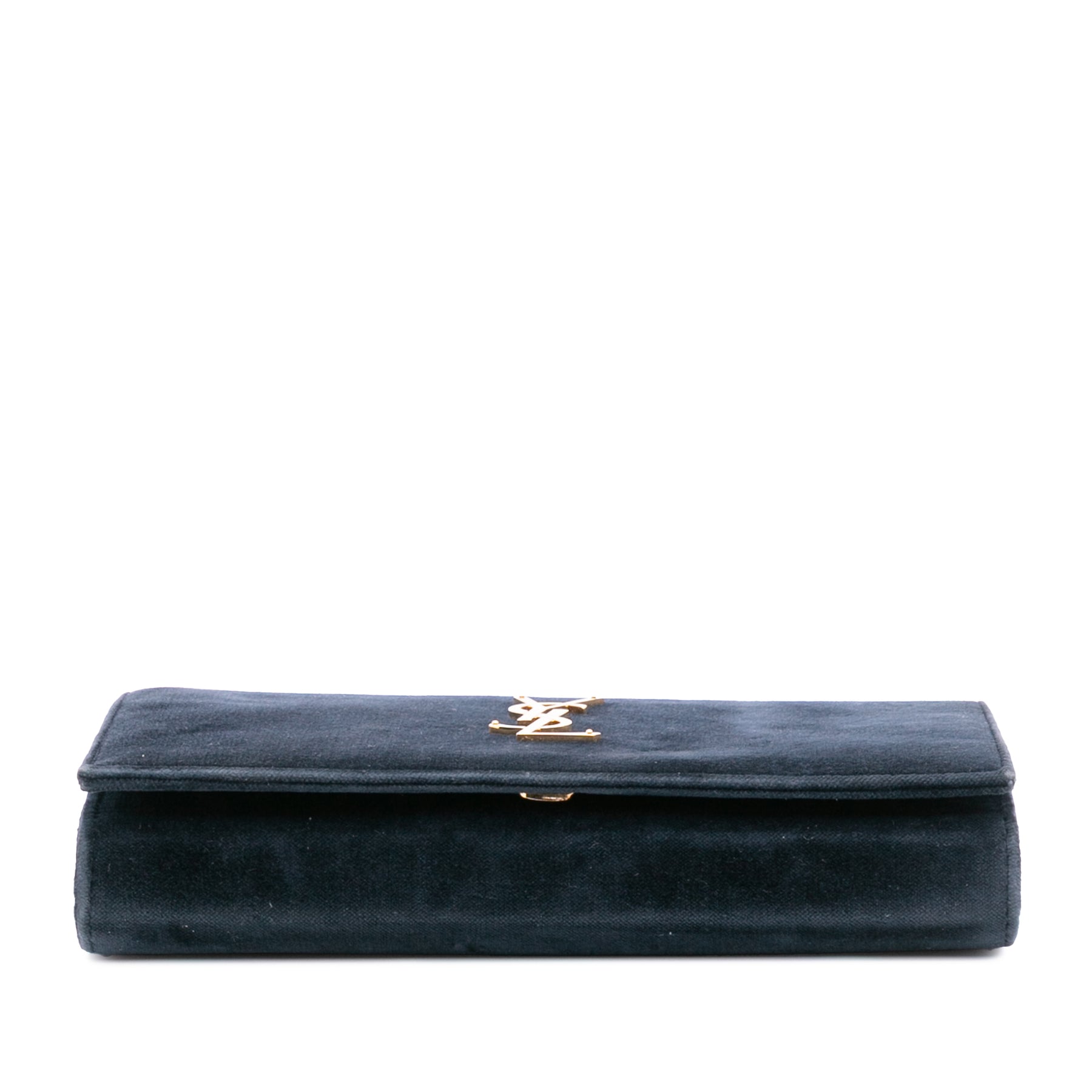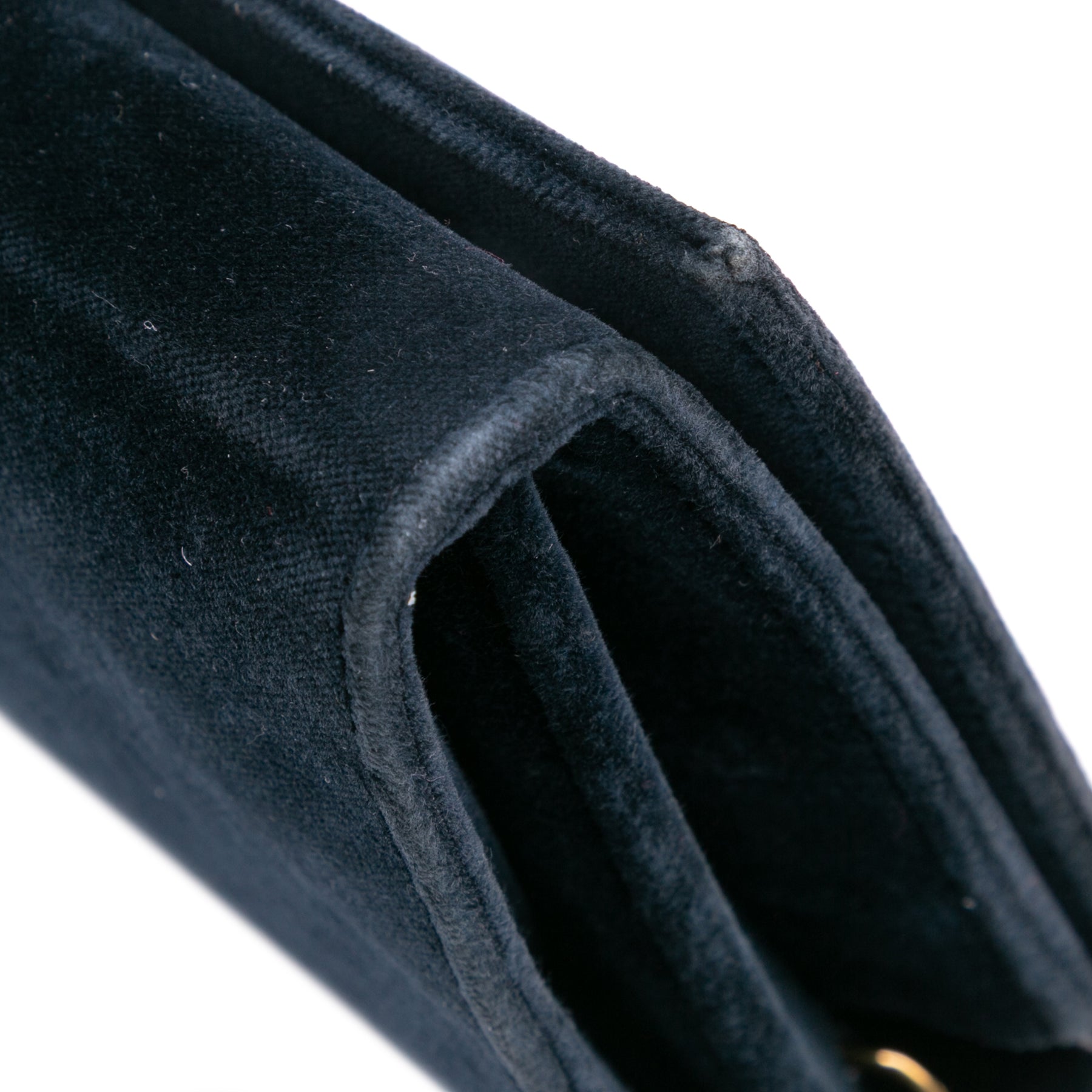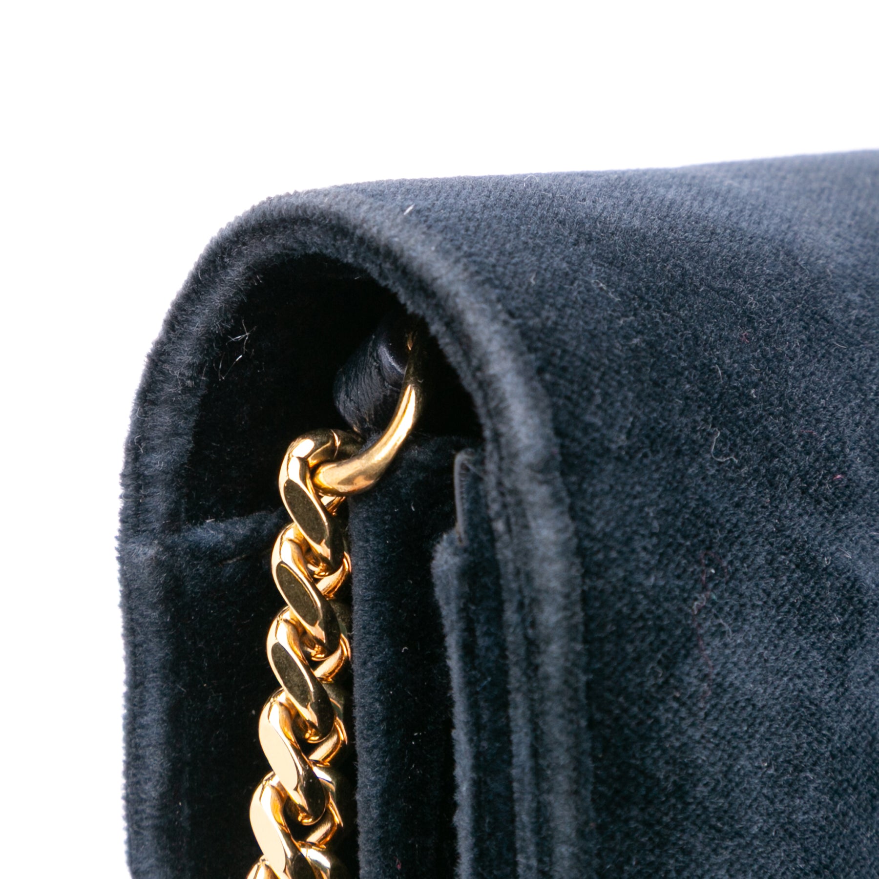 Le portefeuille Kate à chaîne est confectionné en cuir suédé et possède une bandoulière chaîne, un rabat avant à fermeture magnétique, ainsi que des poches intérieures zippées et plaquées. Il est en bon état.