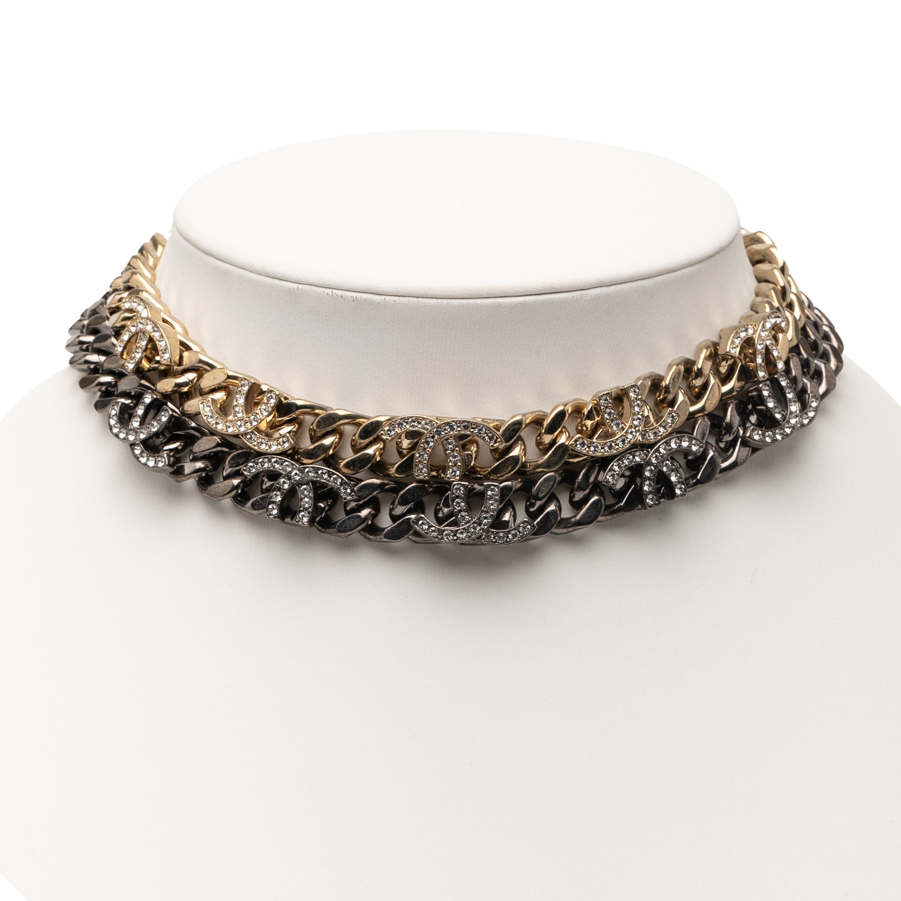 Chanel plaqué et Ruthenium plaqué CC Cristal Split Double Chain Choker Necklace