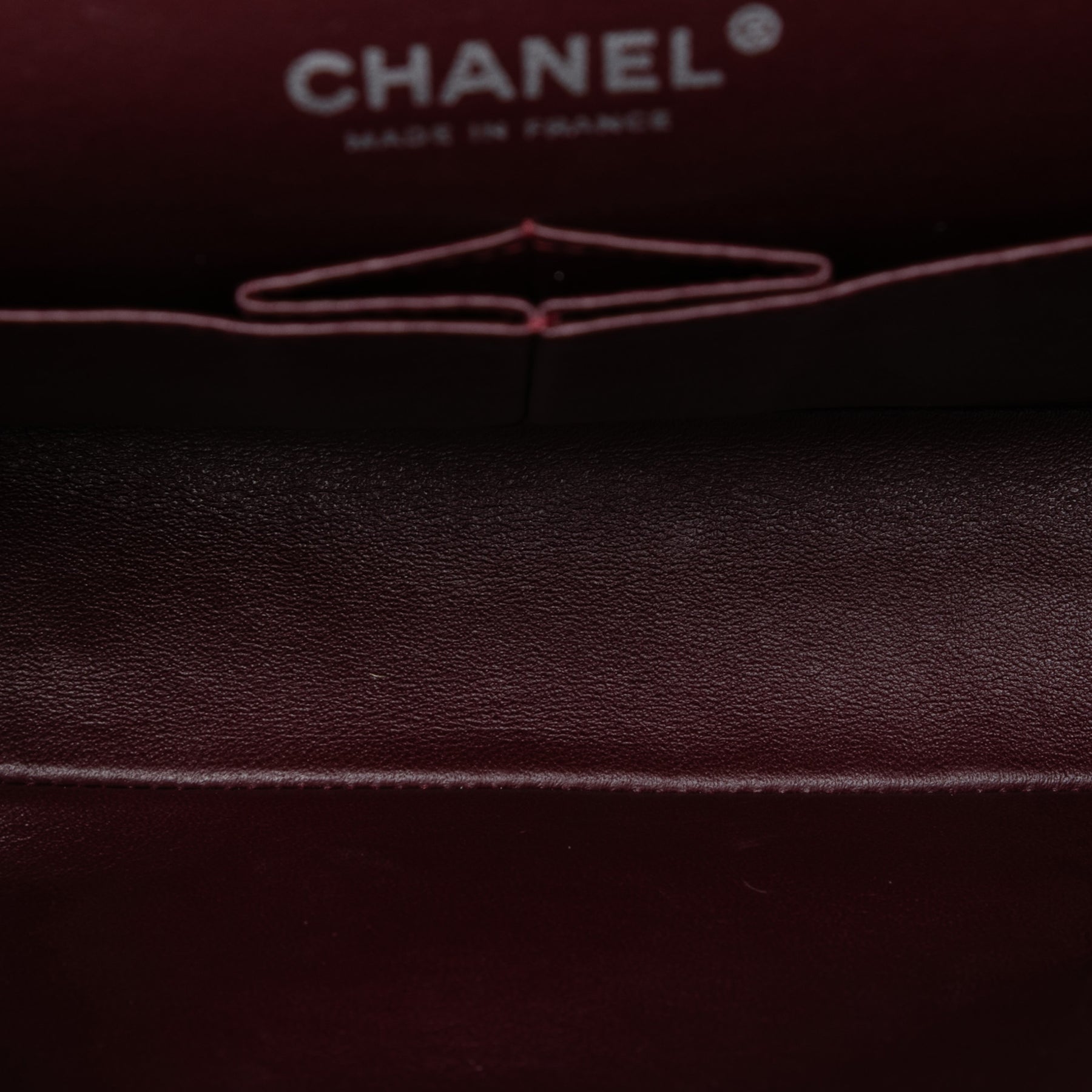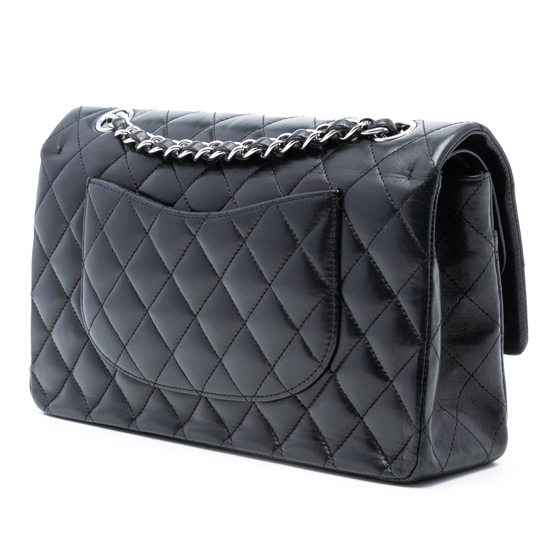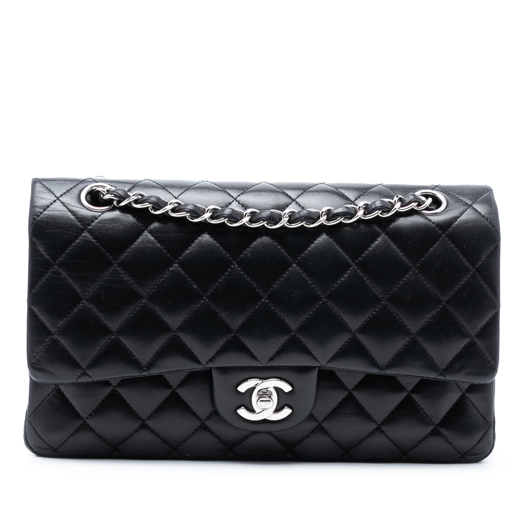 Ce sac bandoulière est confectionné en cuir d'agneau matelassé et présente une poche plaquée extérieure au dos, des bandoulières en chaîne tressée de cuir, un double rabat avant orné du double C entrelacé et d'une fermeture à tourniquet, ainsi que des poches plaquées intérieures. Il est en bon état.