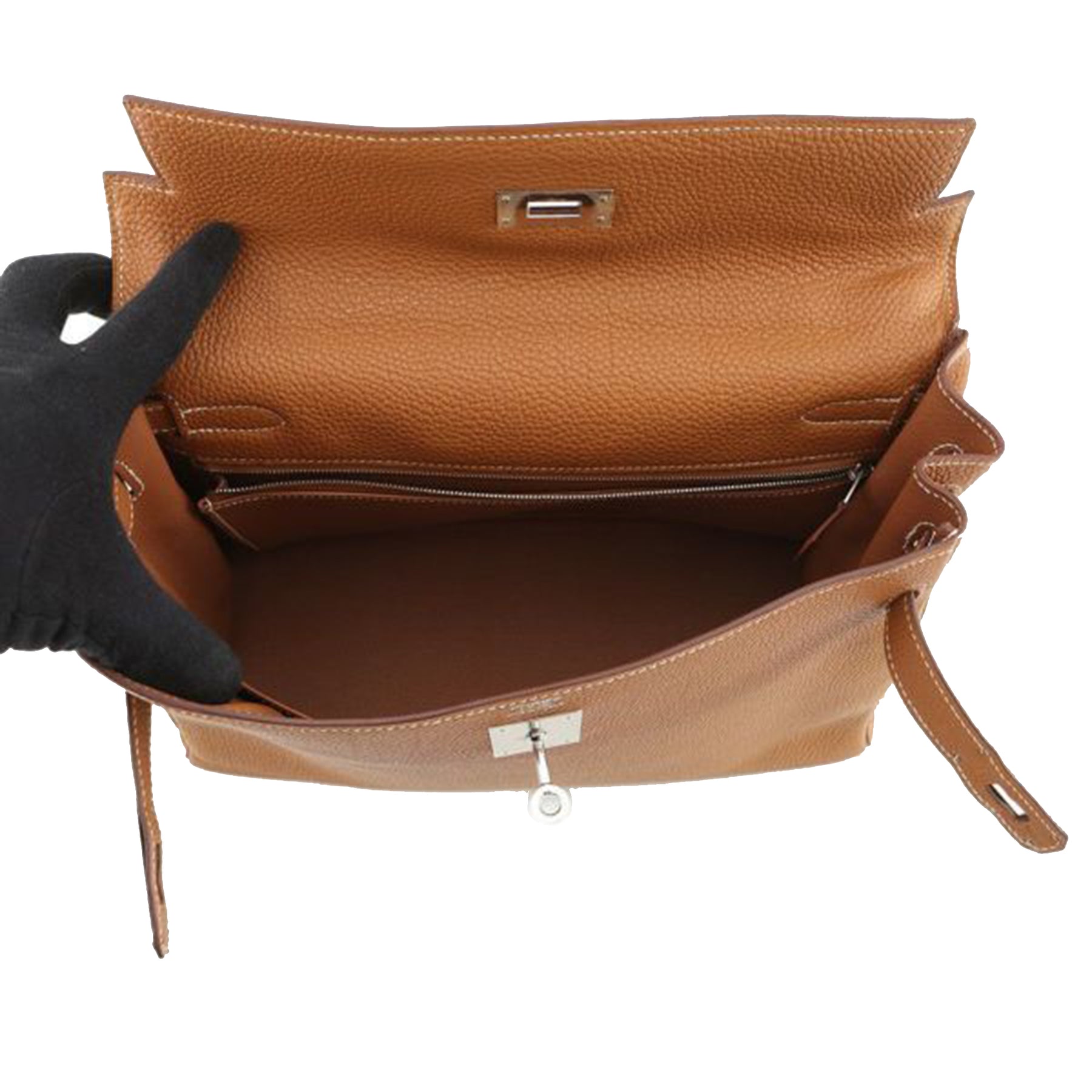 Ce sac Kelly Retourne 32 est confectionné en cuir Togo doré et possède une poignée supérieure roulée en cuir, une bandoulière amovible, un rabat avant avec fermeture à fermoir métallique, ainsi que des poches intérieures zippées et plaquées. Il est en excellent état.