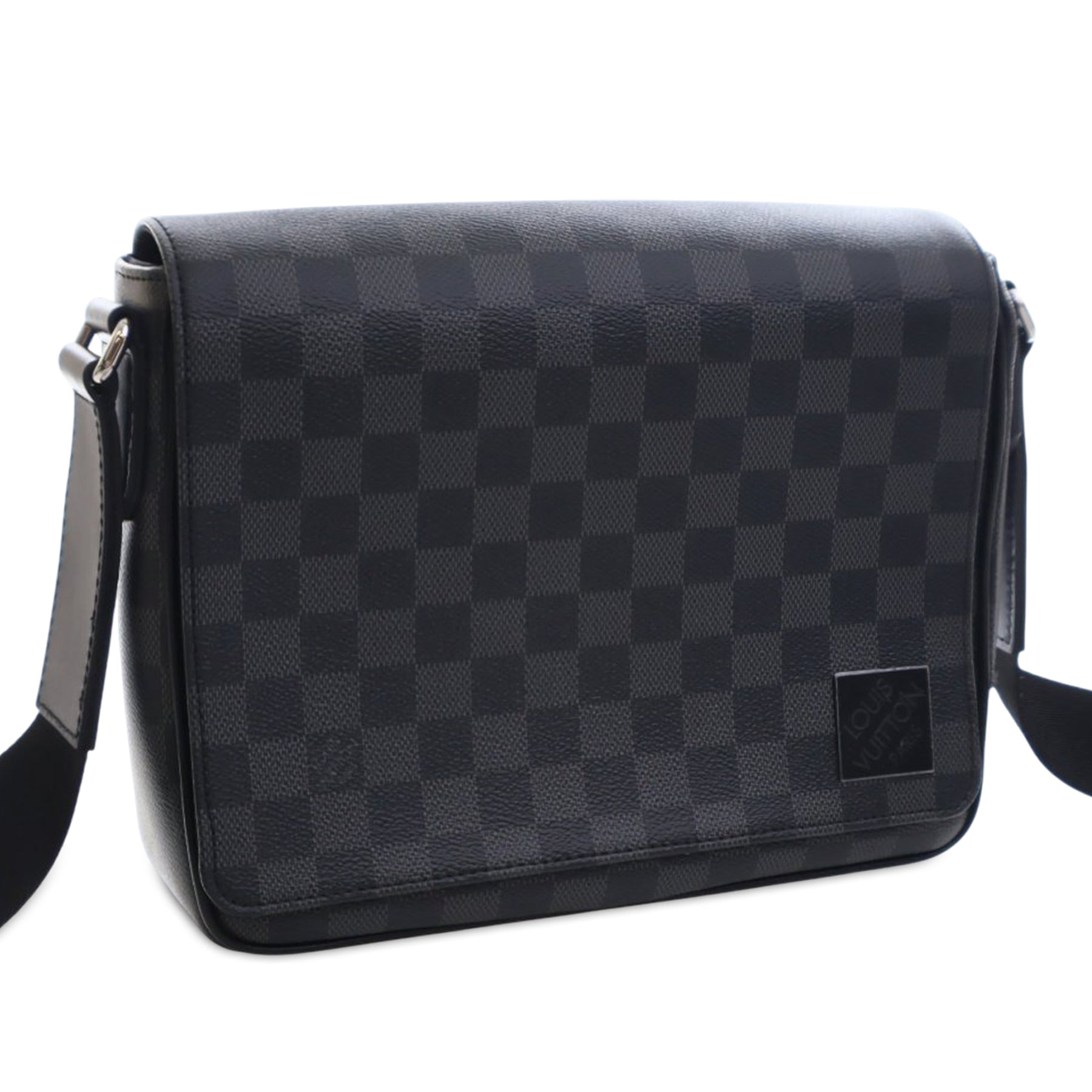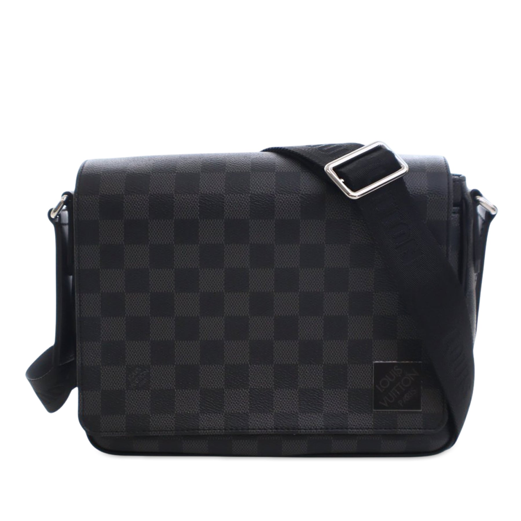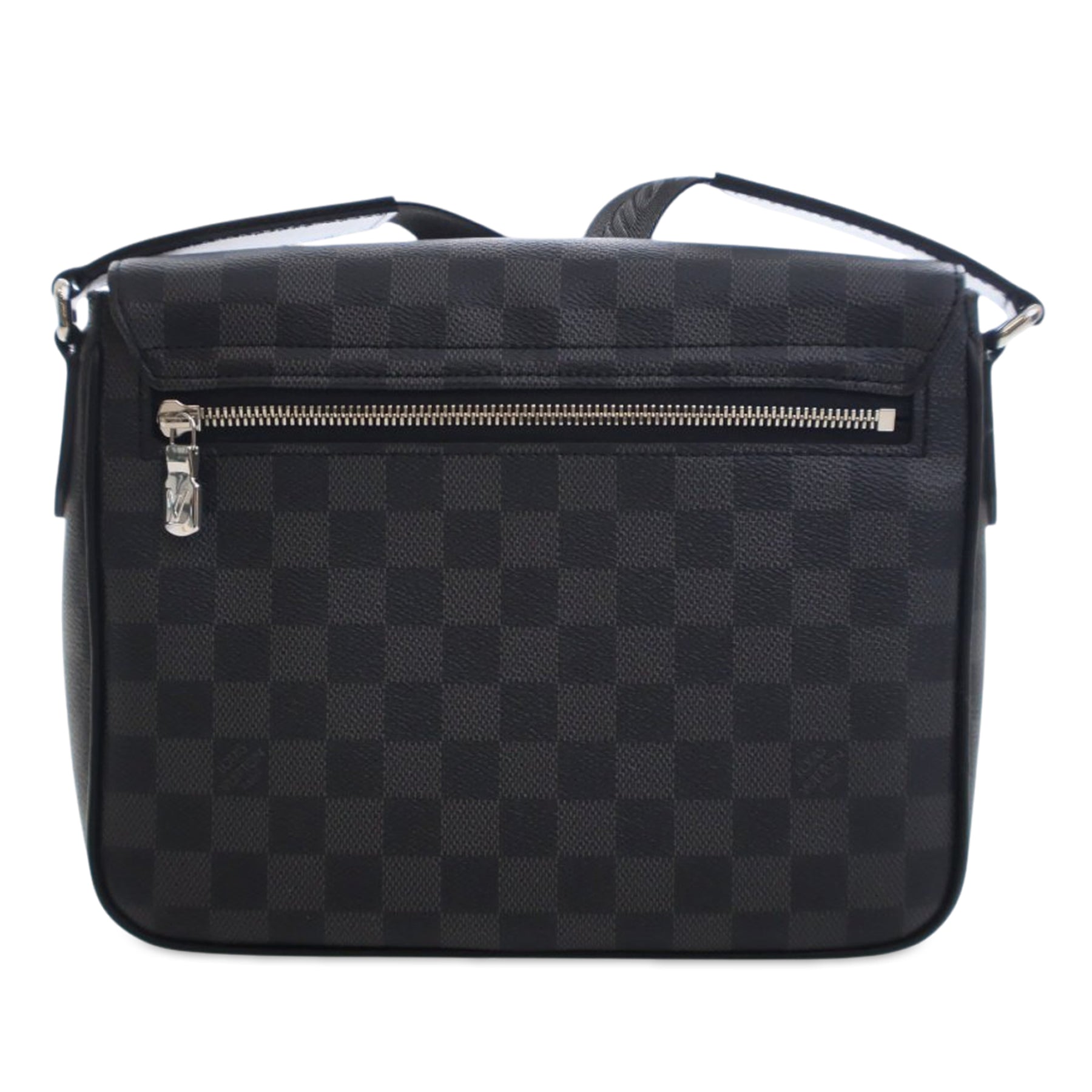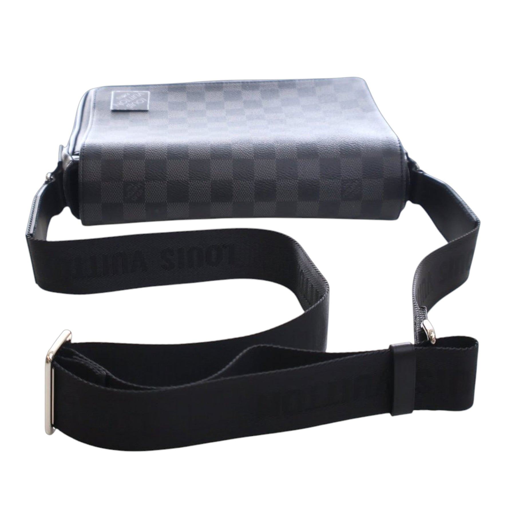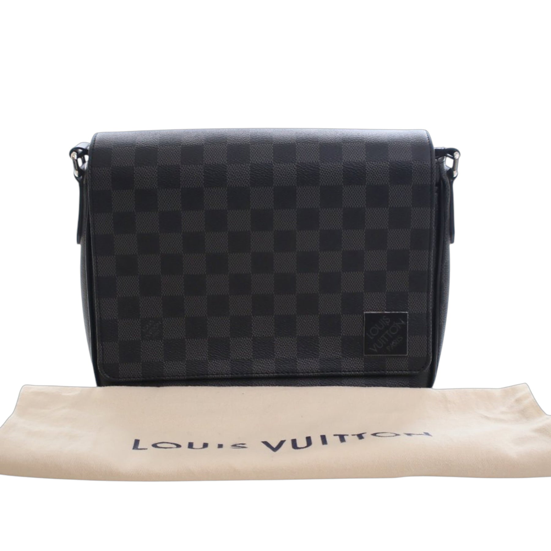 Le sac District PM est confectionné en toile Damier Graphite avec des finitions en cuir, une bandoulière plate réglable, un rabat avant à fermeture magnétique, une poche extérieure zippée au dos et des poches intérieures plaquées. Il est en excellent état.