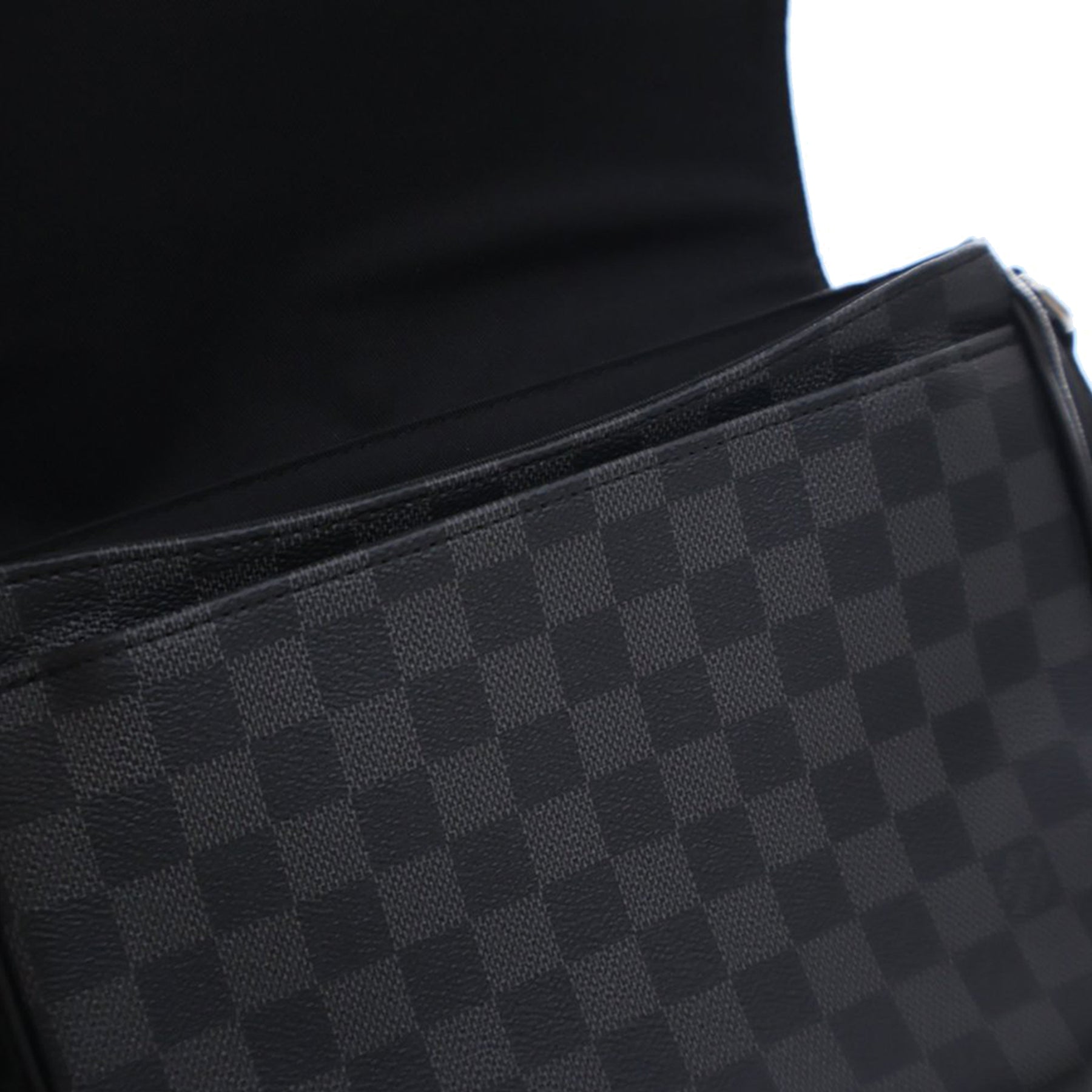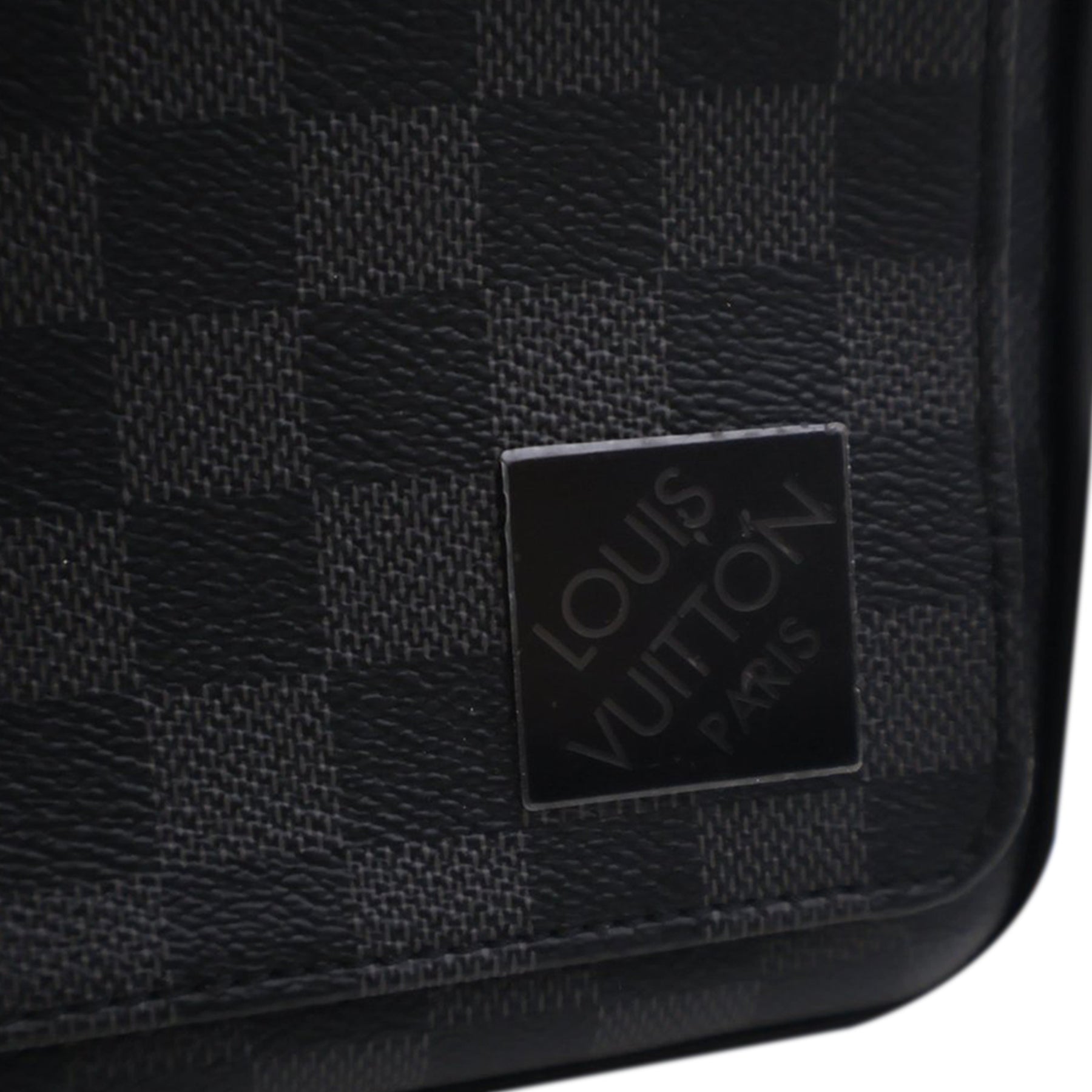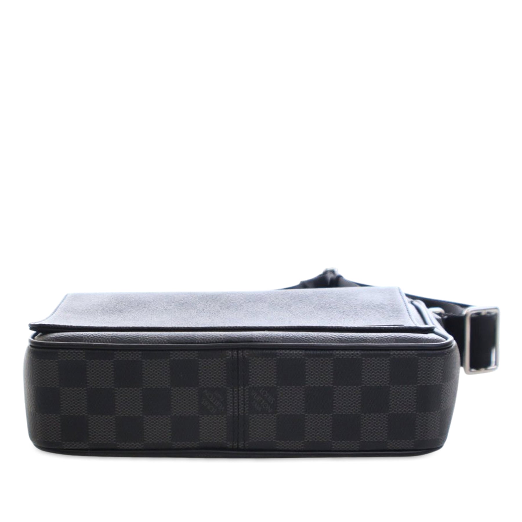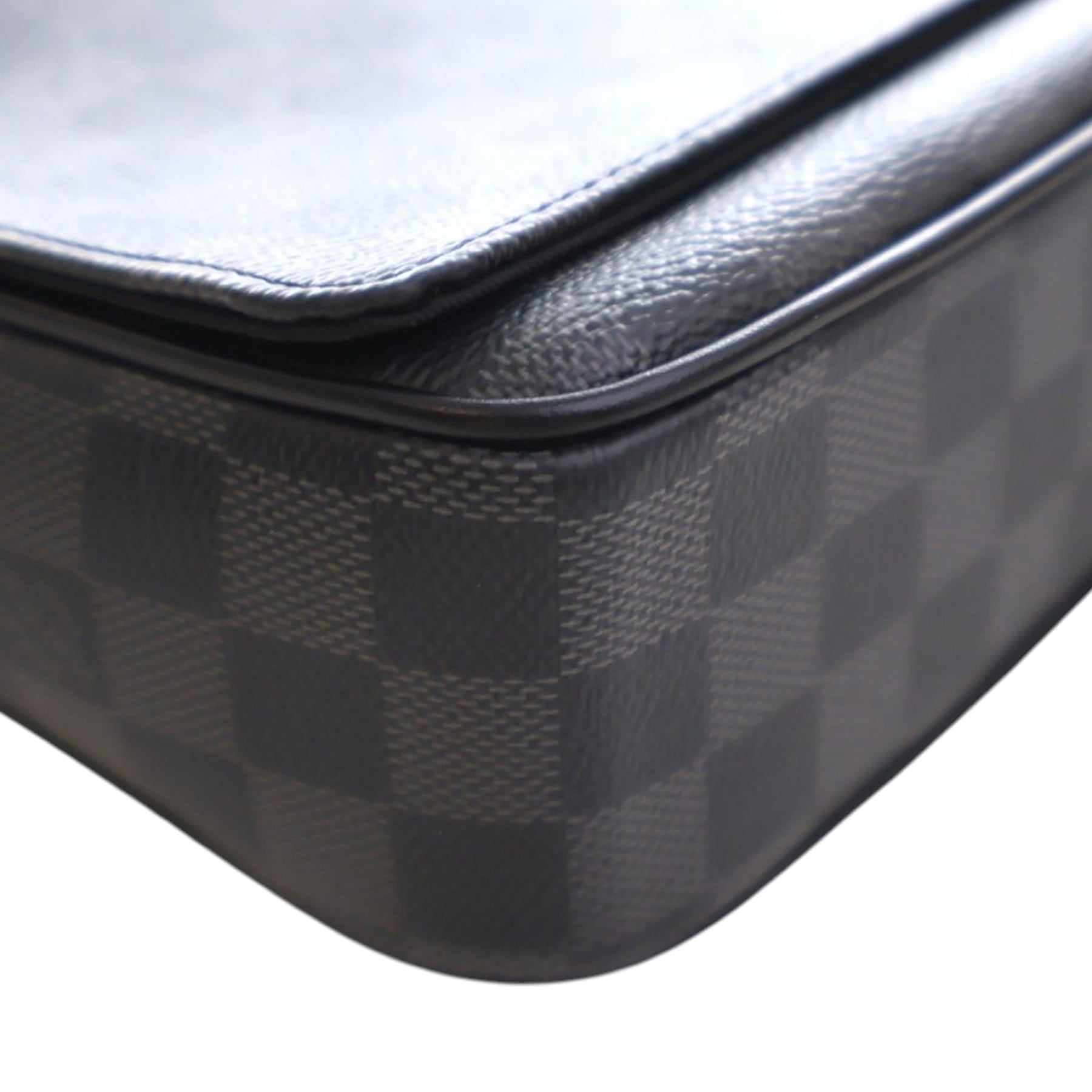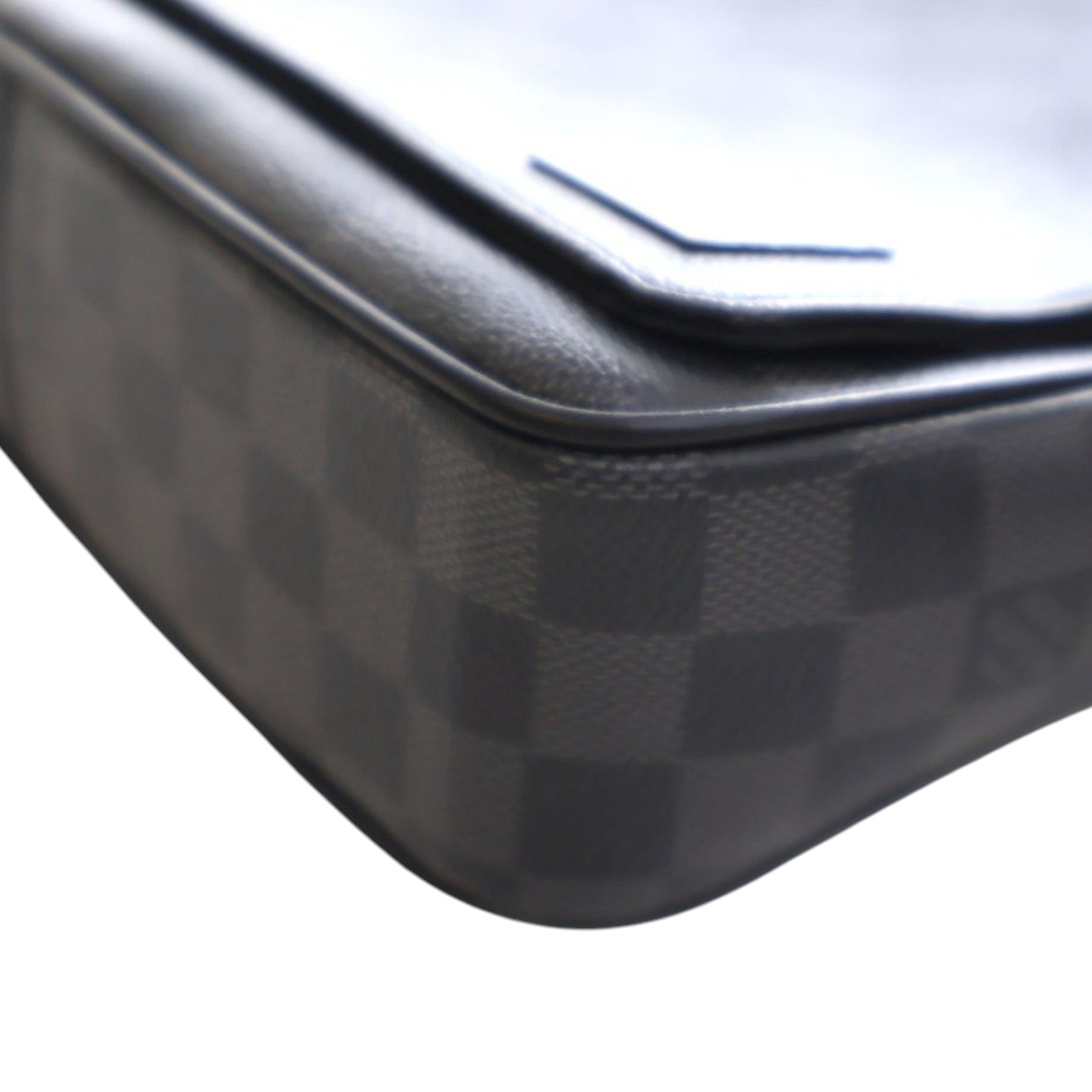 Le sac District PM est confectionné en toile Damier Graphite avec des finitions en cuir, une bandoulière plate réglable, un rabat avant à fermeture magnétique, une poche extérieure zippée au dos et des poches intérieures plaquées. Il est en excellent état.