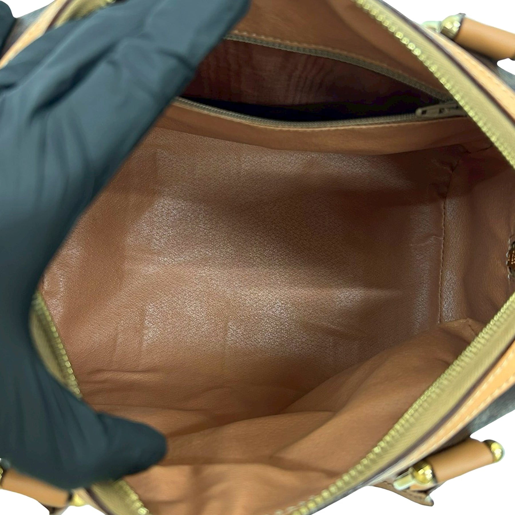 Ce sac à main est en toile enduite avec des finitions en cuir, des poignées roulées en cuir, une bandoulière plate amovible en cuir, une fermeture zippée sur le dessus et une poche intérieure zippée. Il est en bon état.