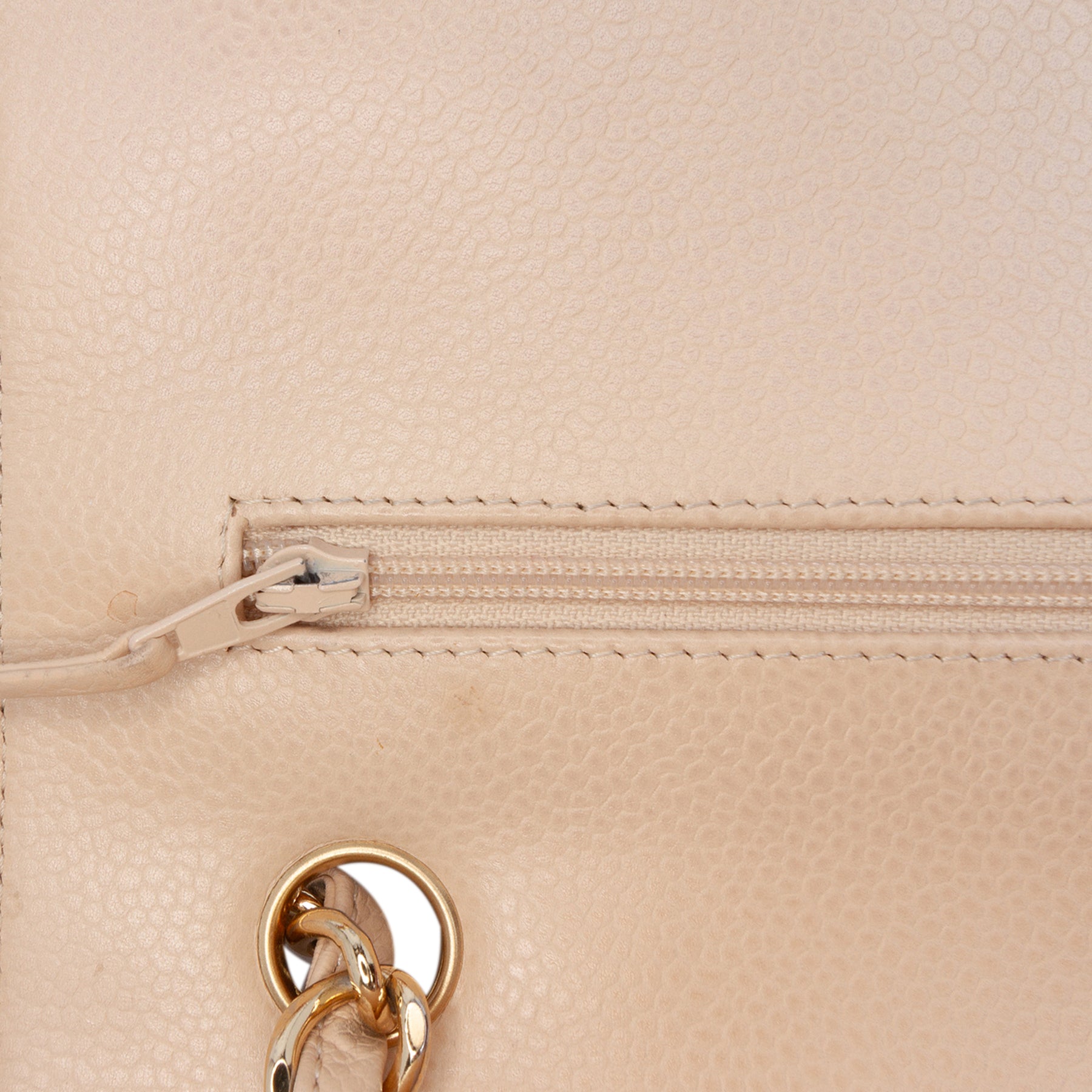Ce sac bandoulière est confectionné en cuir caviar matelassé et possède des bandoulières en chaîne tressée, un double rabat supérieur avec fermoir CC, une poche plaquée extérieure au dos, ainsi que des poches intérieures zippées et plaquées. Il est en bon état.