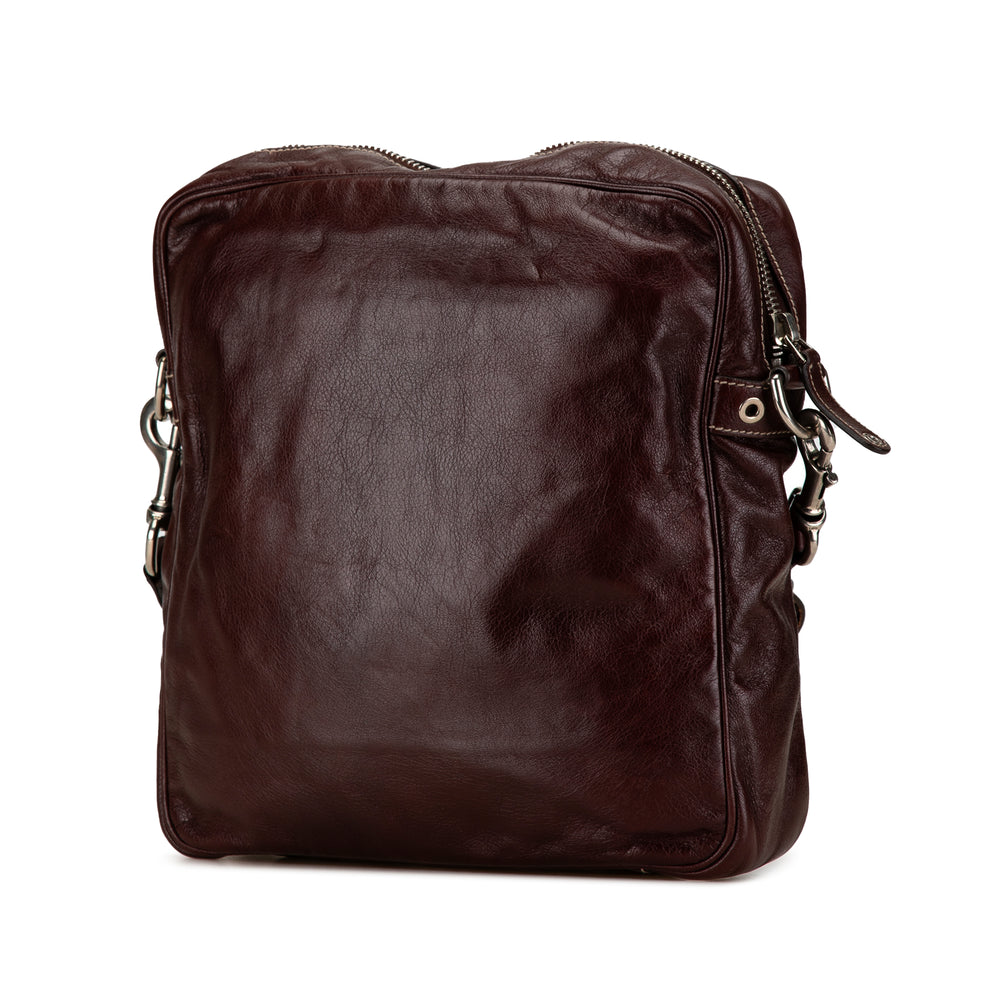 Ce sac bandoulière est doté d'un corps en cuir, d'une bandoulière plate réglable, d'une fermeture zippée sur le dessus, d'une poche extérieure zippée et de poches intérieures zippées et plaquées. Il est en bon état.