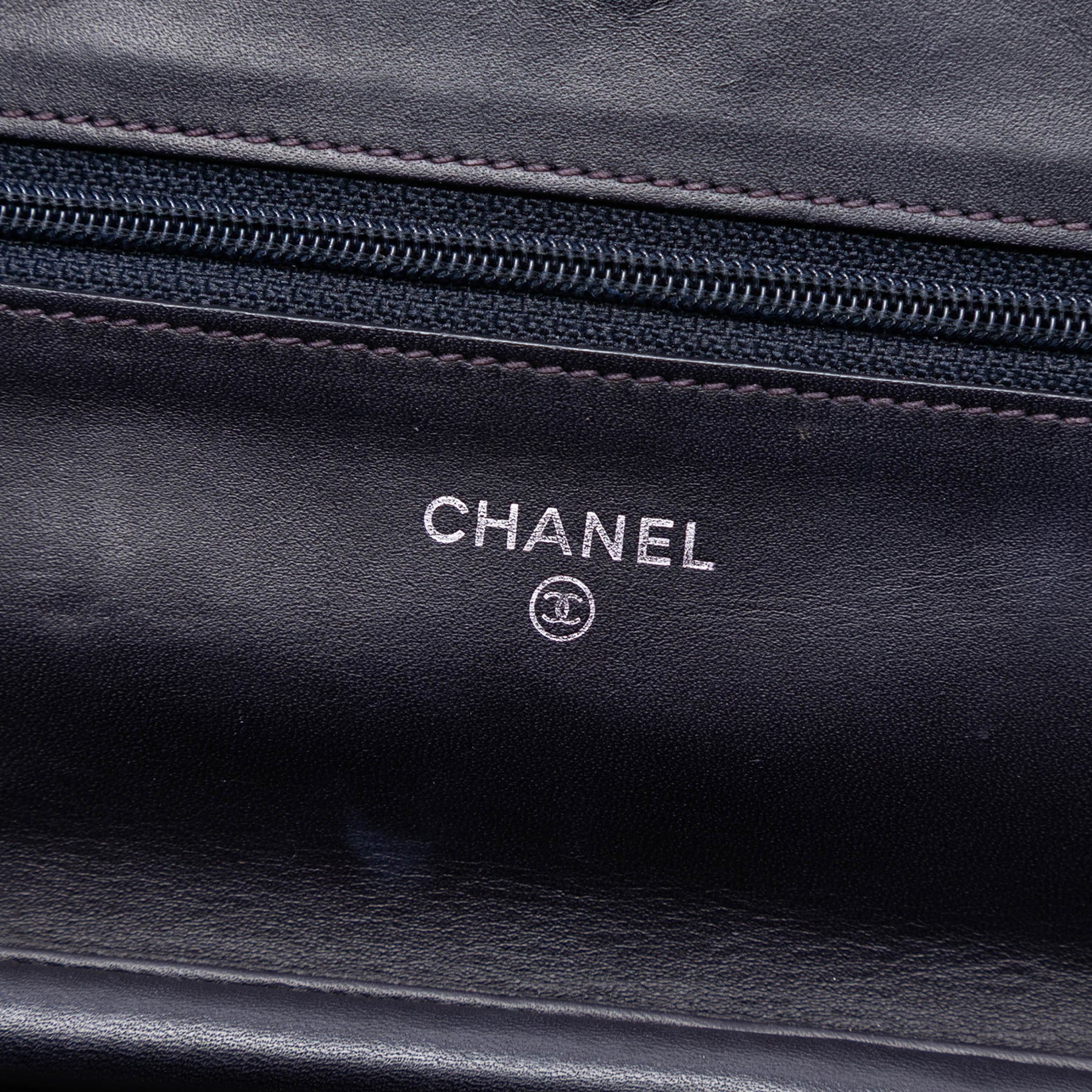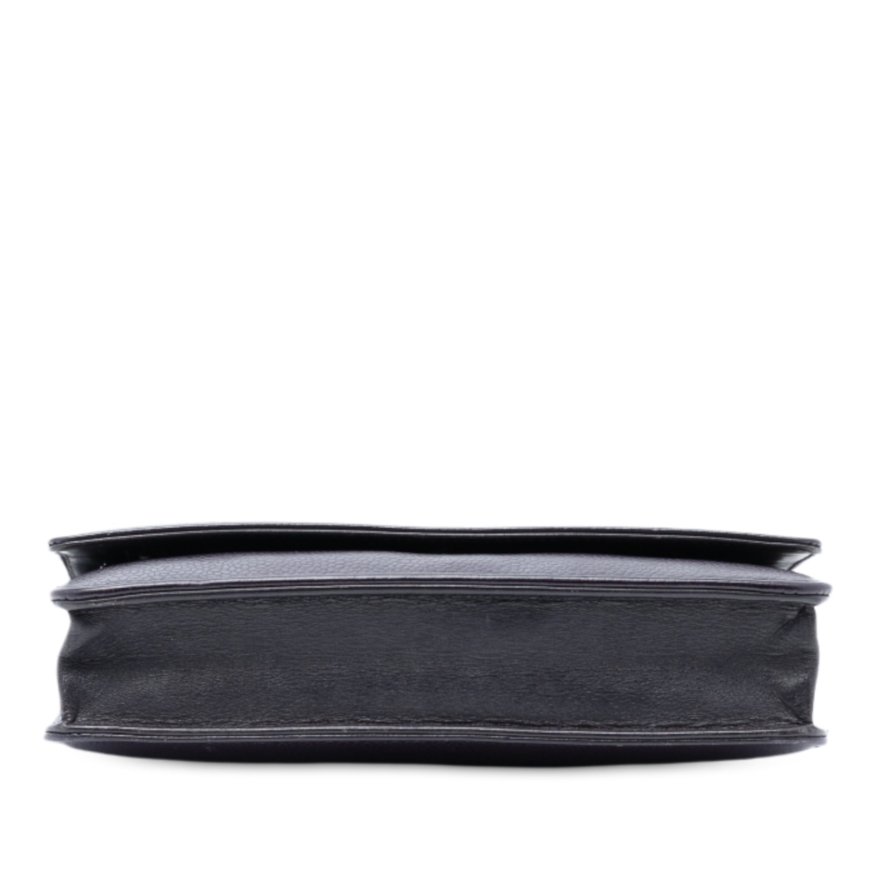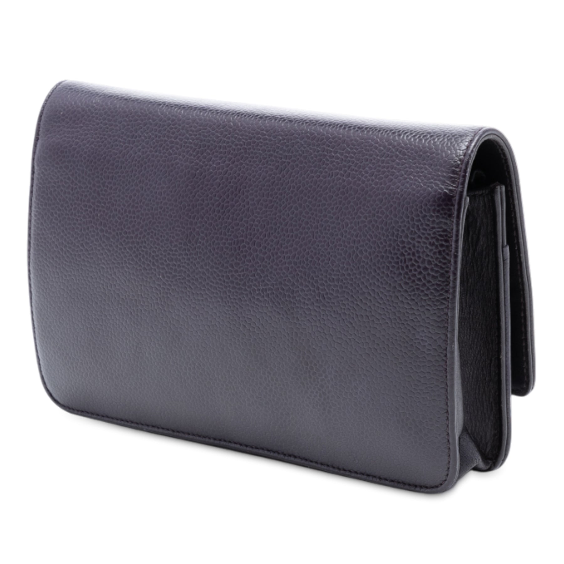 Ce portefeuille à chaîne est confectionné en cuir caviar et possède une bandoulière en chaîne tressée de cuir, un rabat avant avec fermeture à bouton-pression, ainsi que des poches intérieures zippées et plaquées. Il est en bon état.