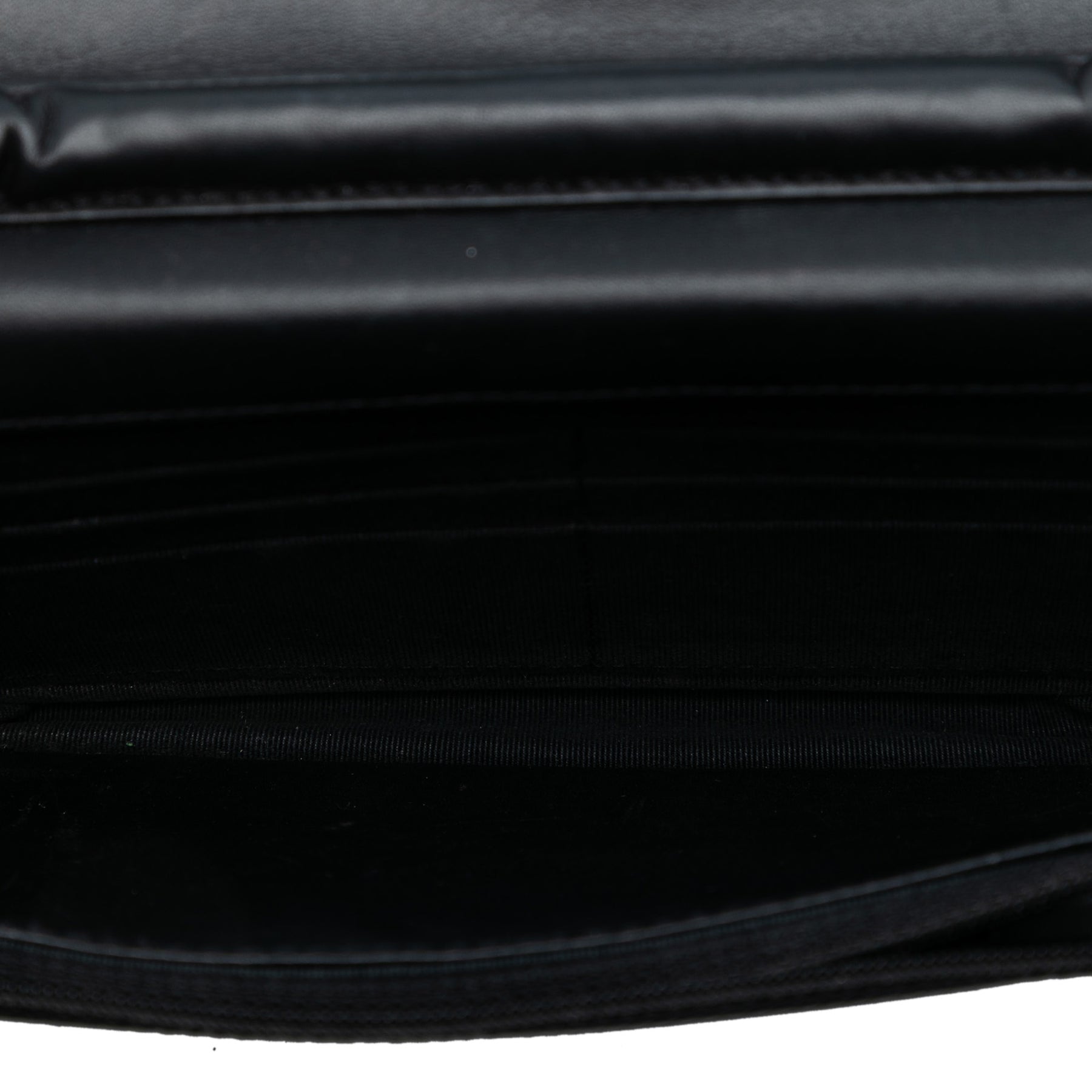 Ce portefeuille à bandoulière est confectionné en cuir verni matelassé et possède une bandoulière en chaîne tressée de cuir, un rabat avant avec fermeture à pression, ainsi que des poches intérieures zippées et plaquées. Il est en bon état.