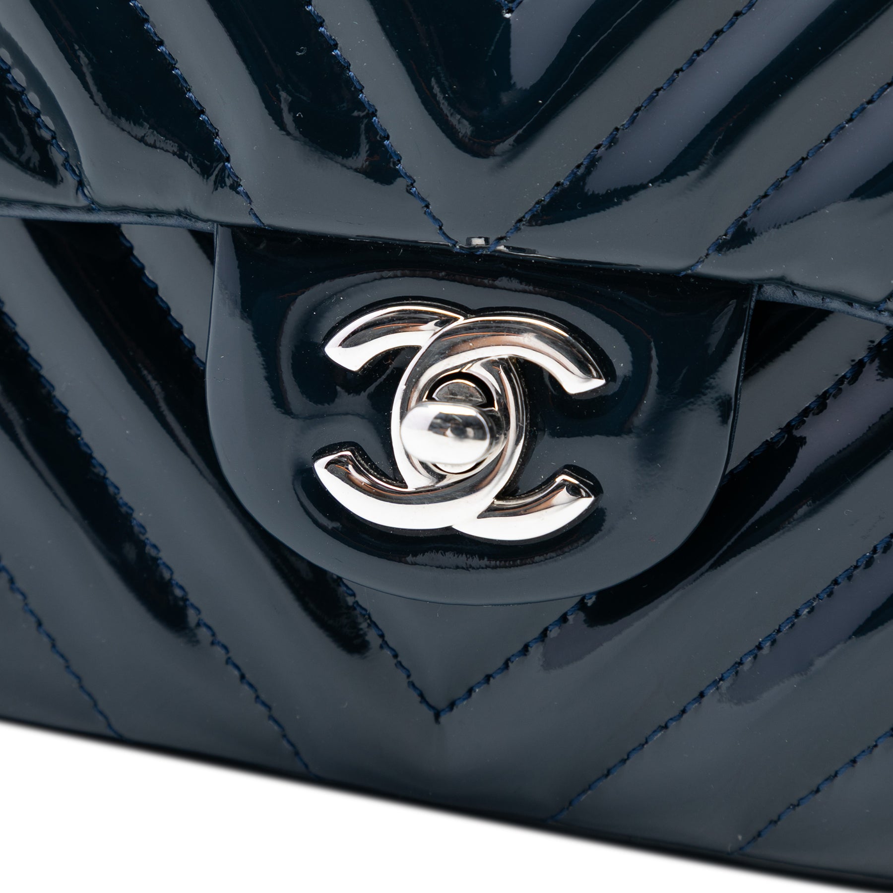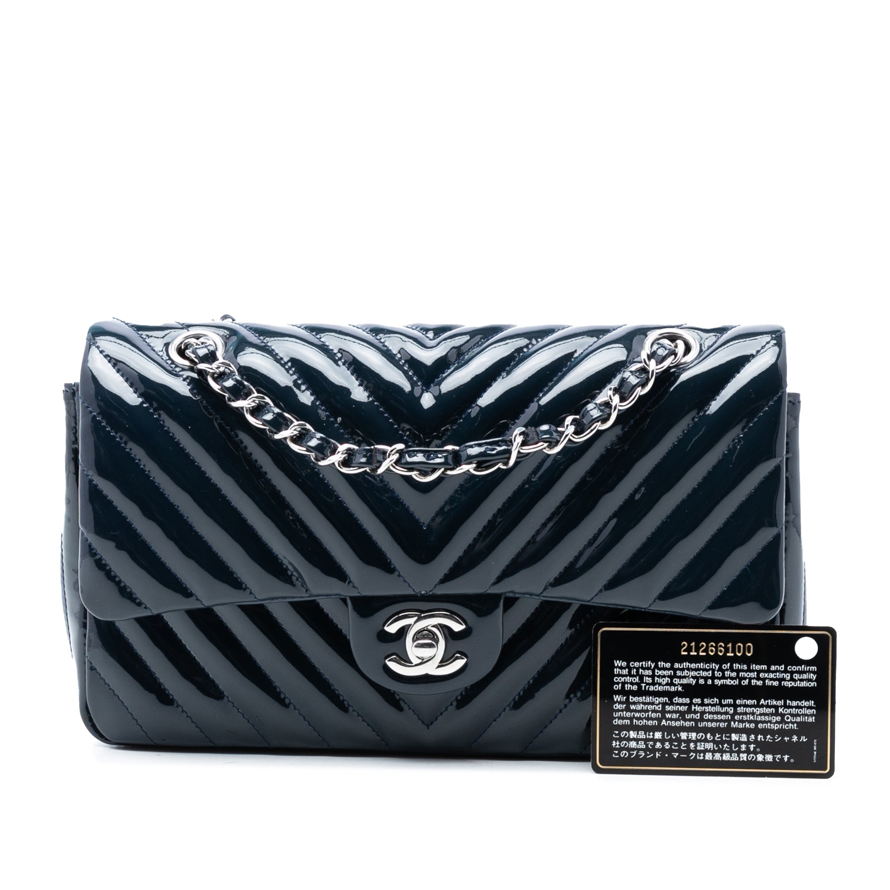 Ce sac bandoulière est confectionné en cuir verni matelassé et possède une bandoulière en chaîne tressée de cuir, un rabat avant orné du double C et d'une fermeture à tourniquet, une poche plaquée extérieure au dos, ainsi que des poches intérieures zippées et plaquées. Il est en excellent état.