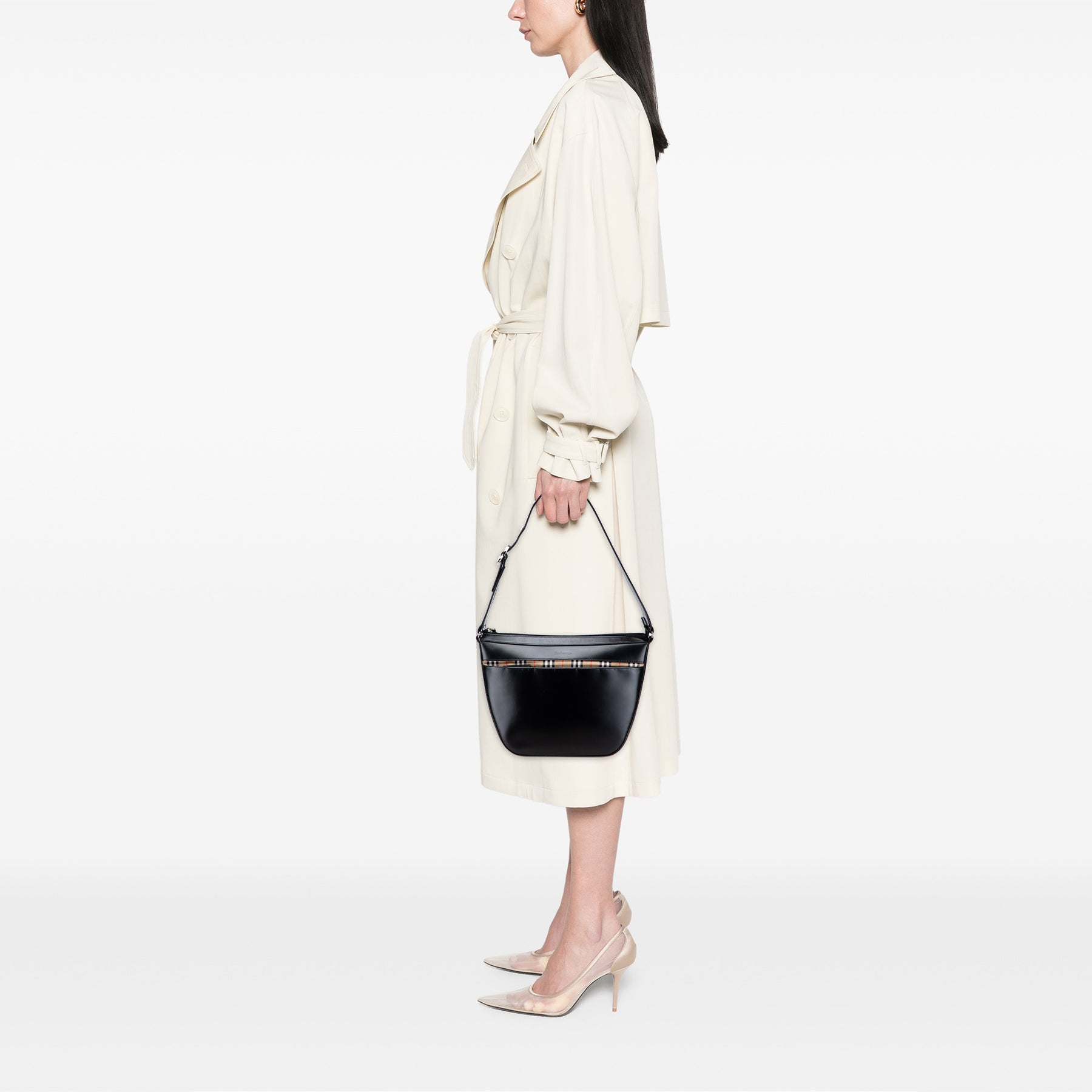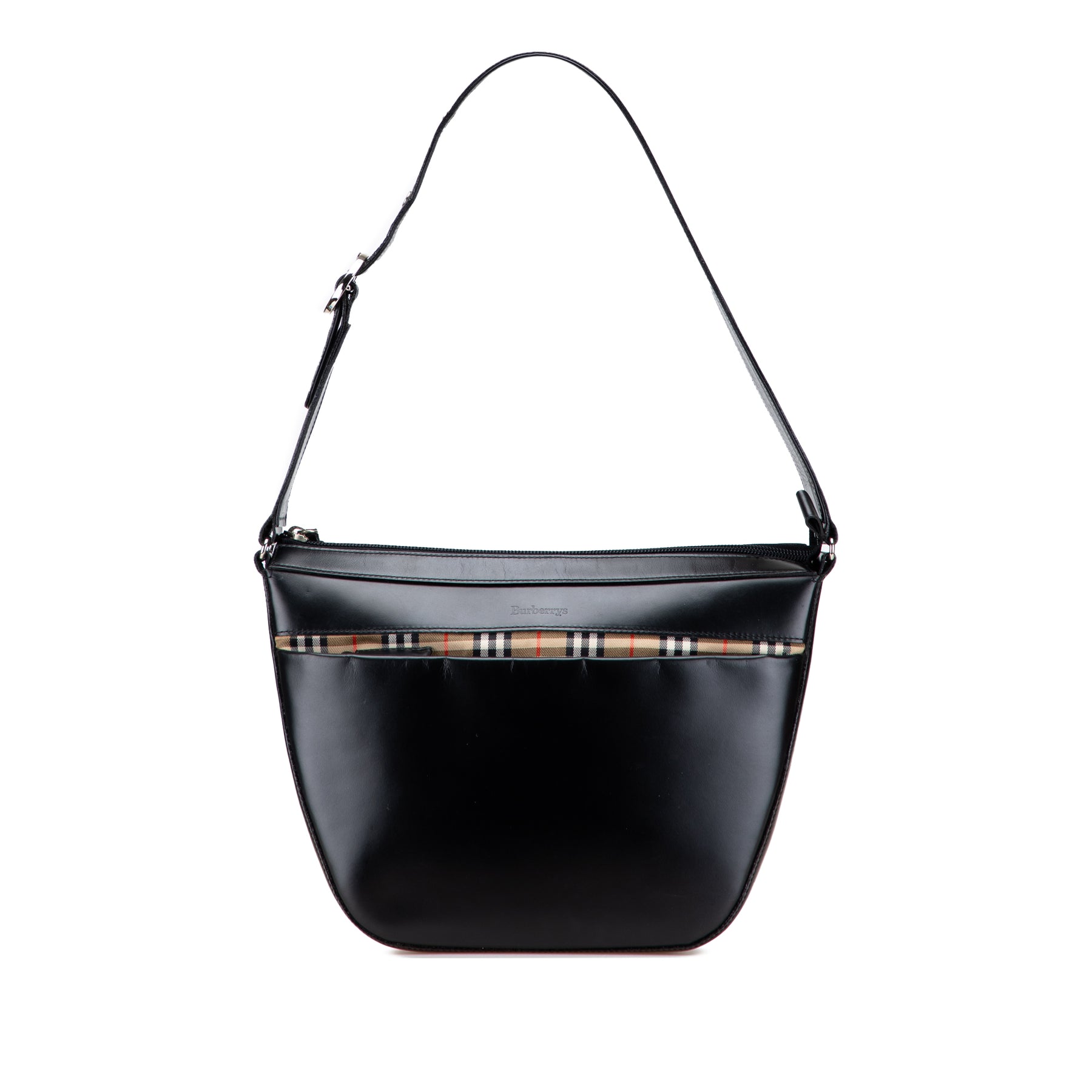 Ce sac bandoulière est en cuir avec des finitions en toile à motif tartan, une bandoulière plate réglable en cuir, une fermeture zippée sur le dessus, une poche extérieure plaquée à l'avant et des poches intérieures zippées et plaquées. Il est en bon état.