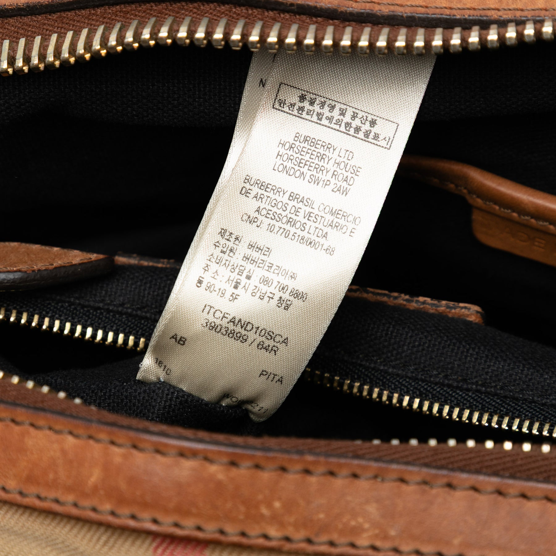 Le sac Bridle Orchard est confectionné en toile à carreaux avec des finitions en cuir, des anses roulées en cuir, une bandoulière plate amovible en cuir, une fermeture zippée sur le dessus et des poches intérieures zippées et plaquées. Il est en bon état.