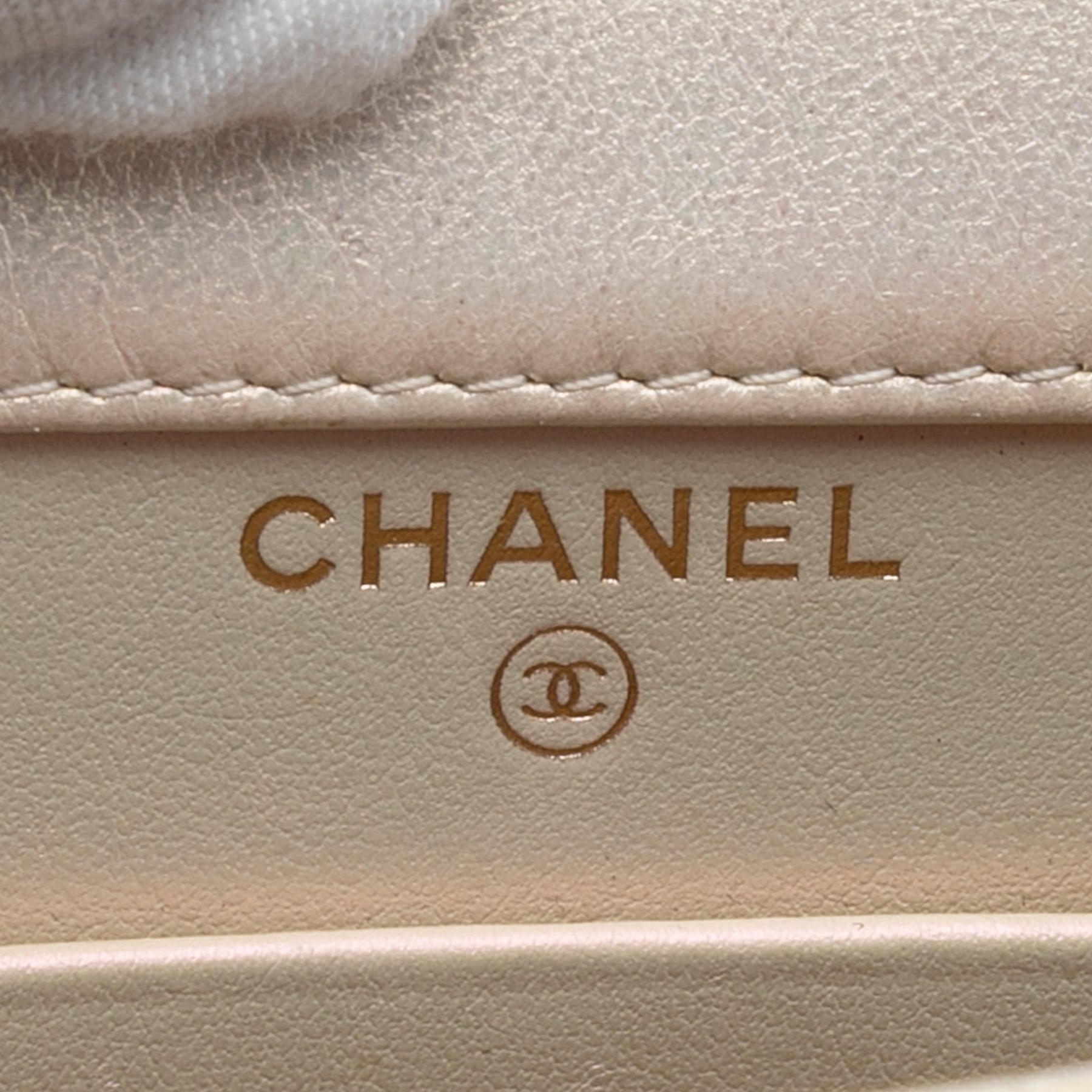Ce sac bandoulière est confectionné en cuir d'agneau irisé, possède une bandoulière en chaîne tressée de cuir, un rabat avant à fermeture pivotante et des poches intérieures plaquées. Il est en excellent état.