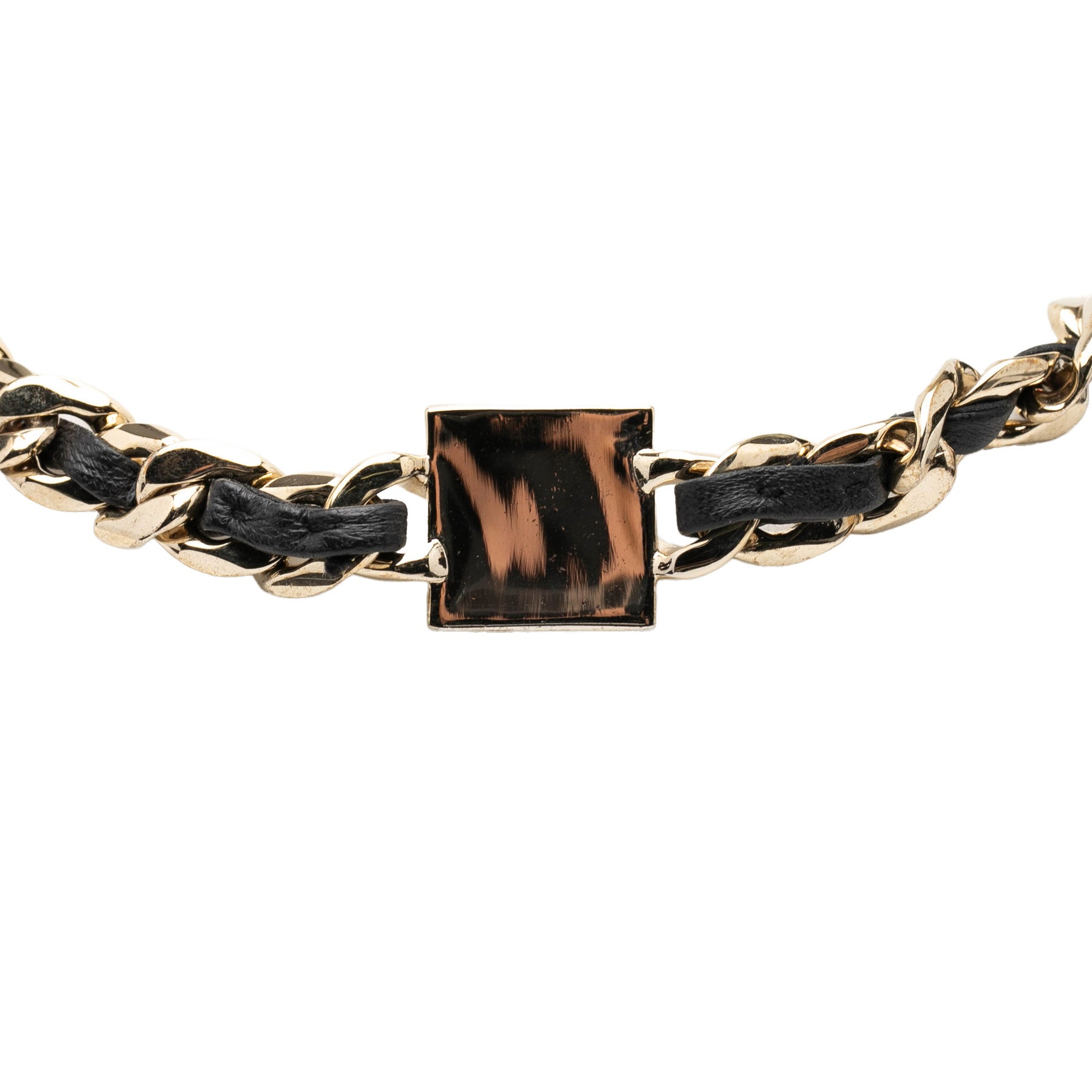 Ce collier est composé d'une chaîne en cuir d'agneau tressé couleur or, d'un pendentif carré orné d'émail et d'un fermoir mousqueton. Il est en bon état.