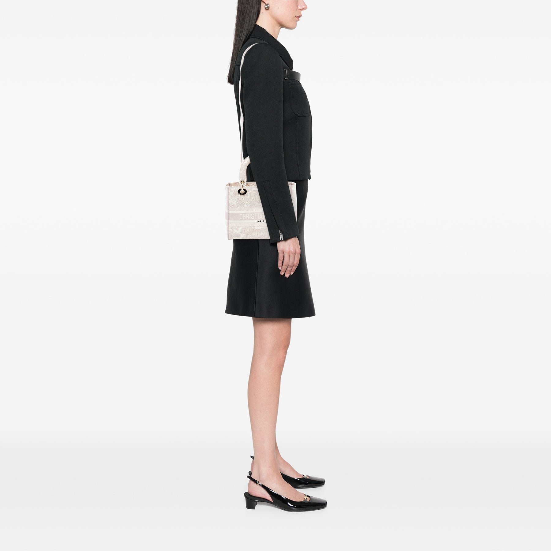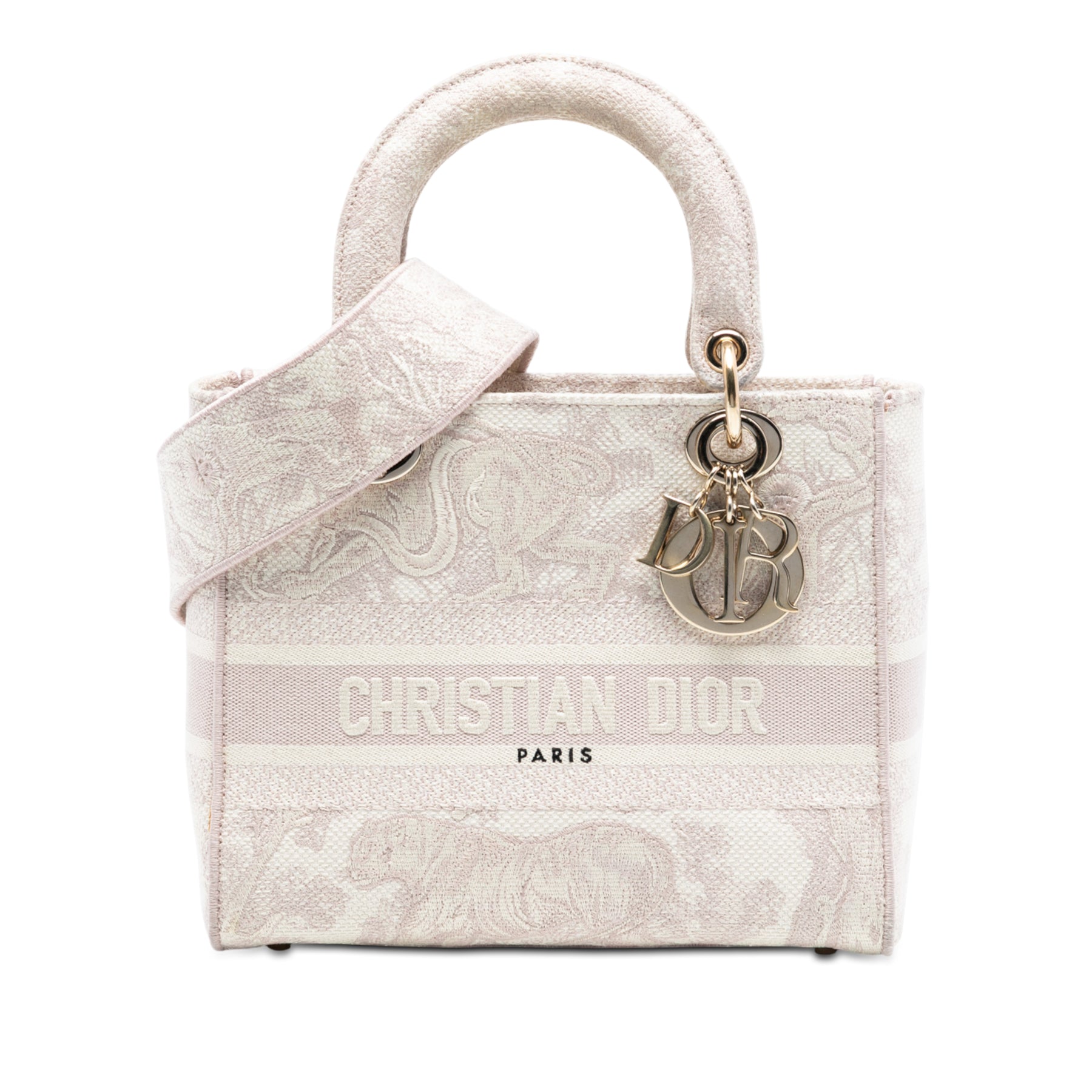 Le sac Lady D-Lite est doté d'un corps en toile brodée, de poignées plates en toile brodée, d'une bandoulière amovible, d'une fermeture à rabat et d'une poche intérieure zippée. Il est en bon état.