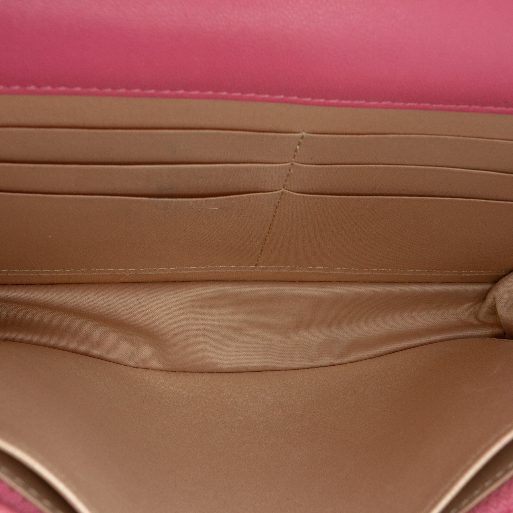Ce portefeuille à chaîne est confectionné en cuir d'agneau embossé et possède une bandoulière en chaîne tressée de cuir, un rabat supérieur à fermeture magnétique, ainsi que des poches intérieures zippées et plaquées. Il est en bon état.