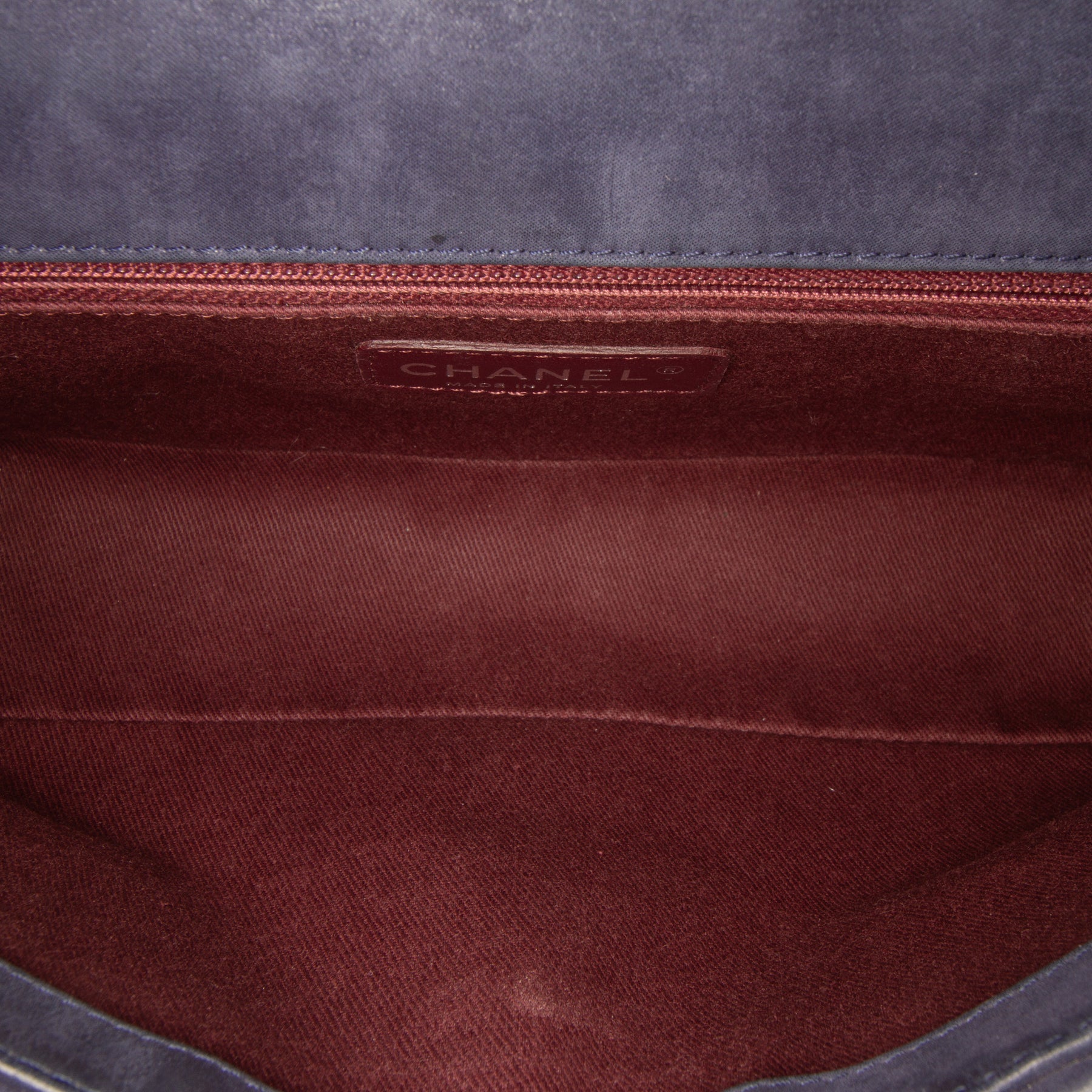 Ce sac à rabat est confectionné en cuir de veau matelassé aux reflets irisés, et présente des anses en chaîne tressée de cuir, un rabat avant avec fermeture à cliquet et une poche intérieure zippée. Il est en bon état.
