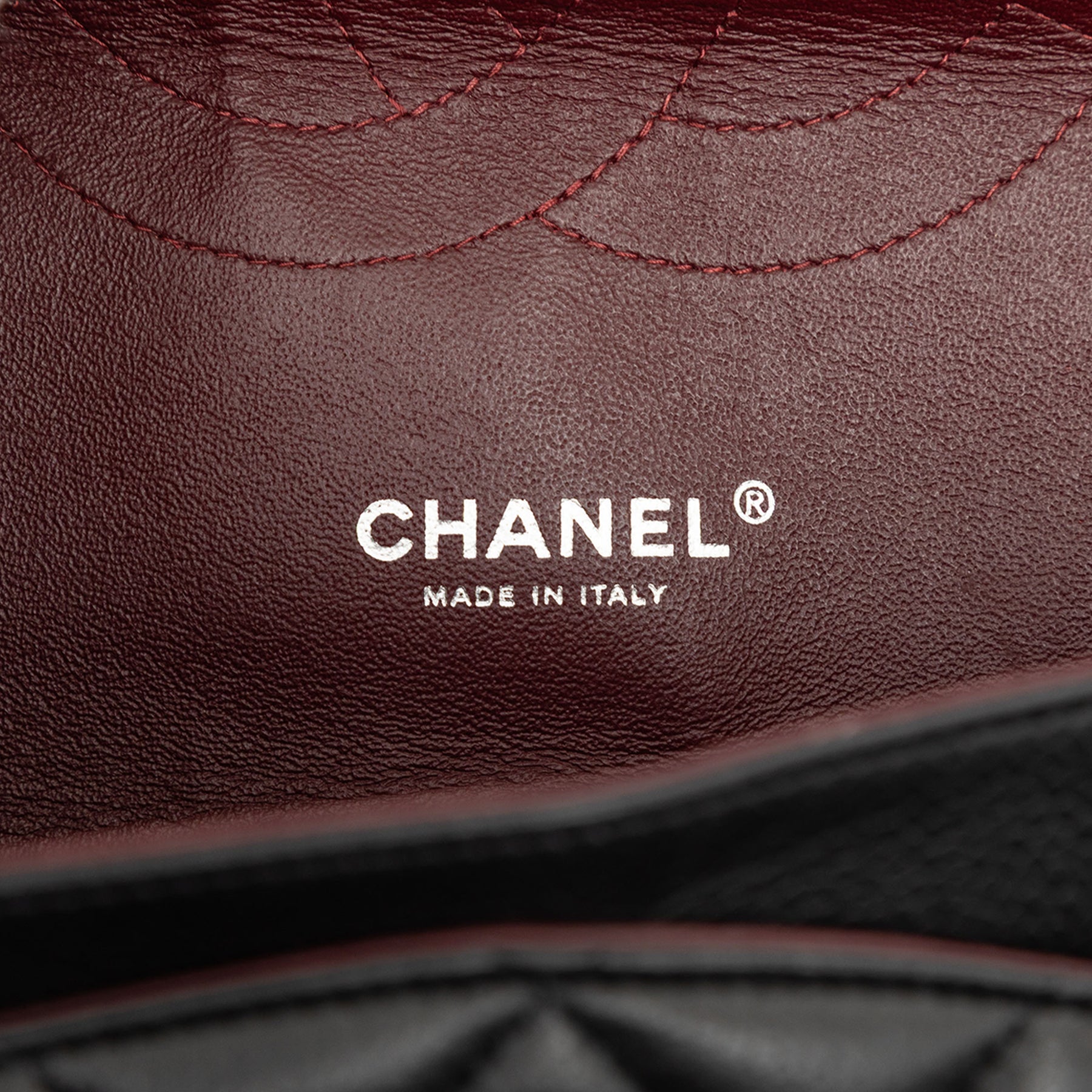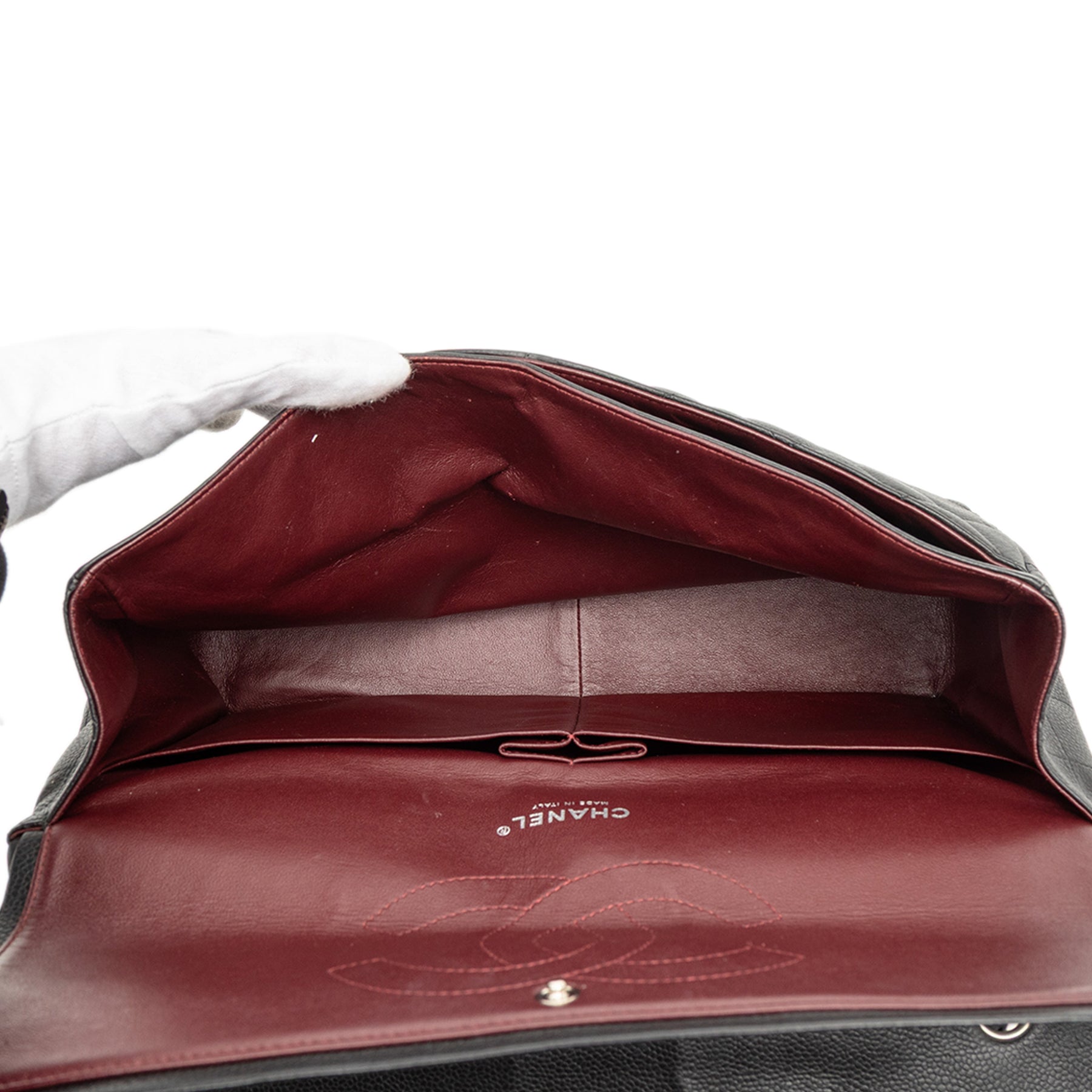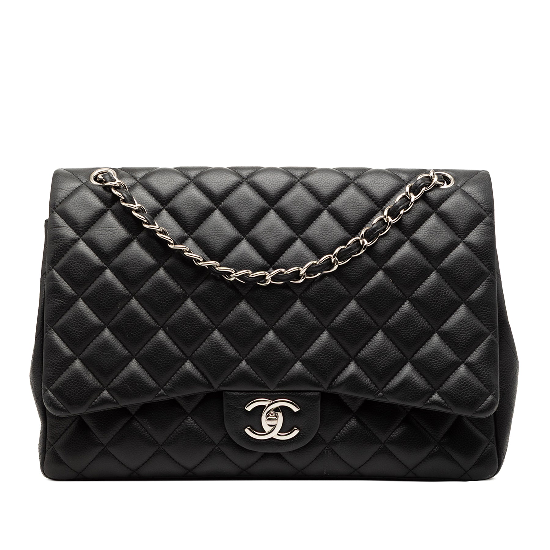 Le sac Classic Maxi est confectionné en cuir caviar matelassé et présente des bandoulières en chaîne tressée de cuir, un double rabat avant orné de C entrelacés et d'une fermeture à tourniquet, une poche plaquée extérieure au dos, ainsi que des poches intérieures zippées et plaquées. Il est en bon état.