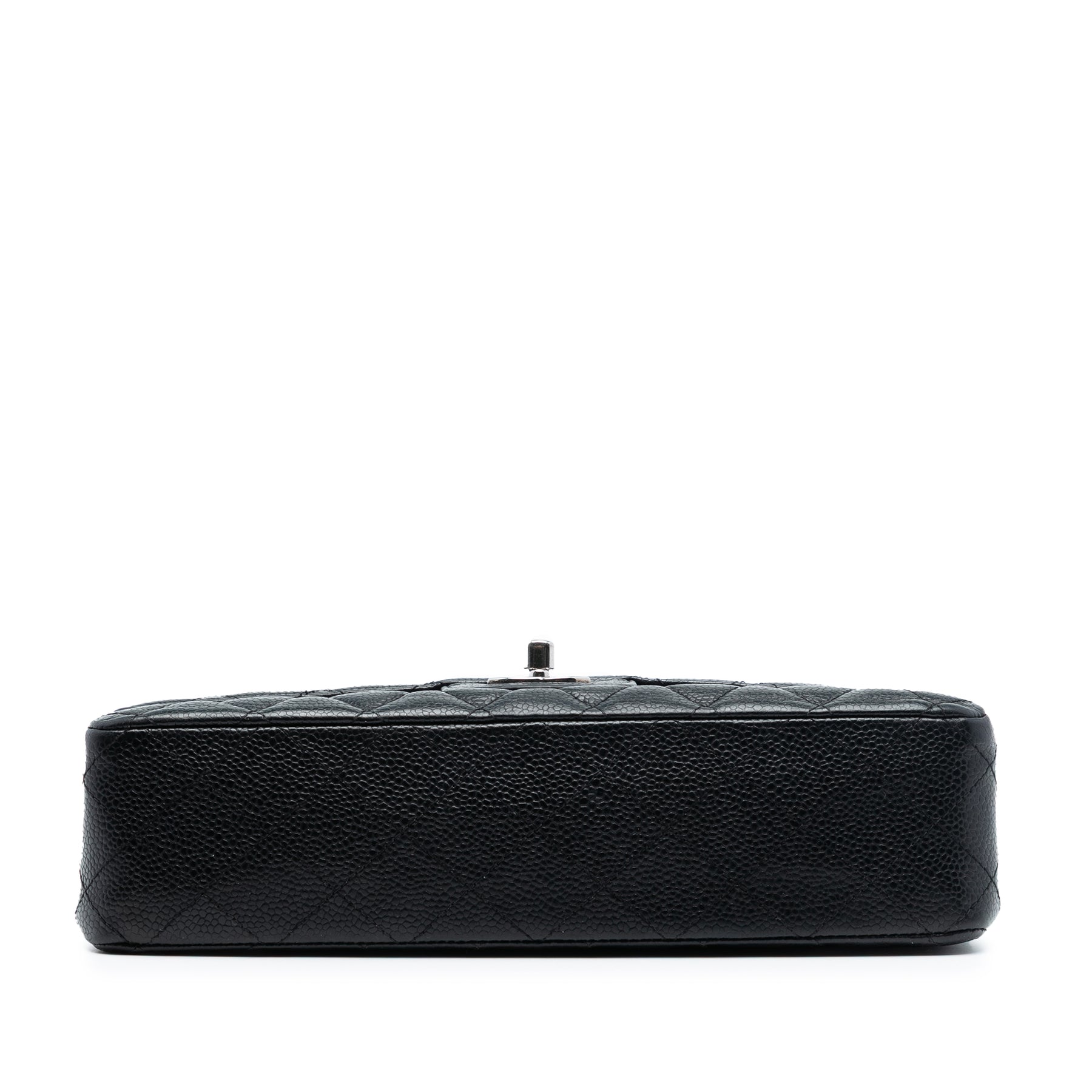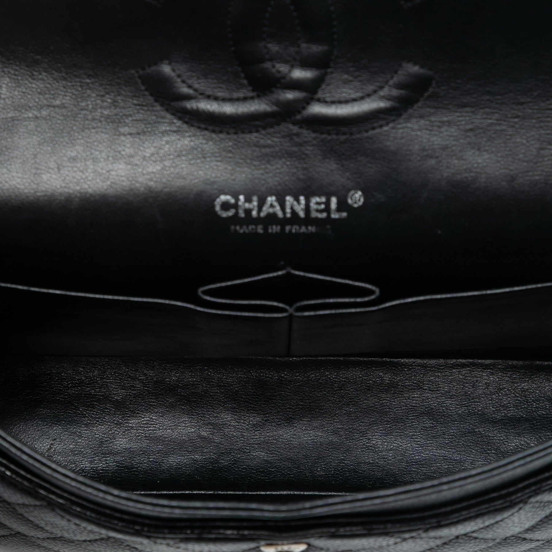 Ce sac bandoulière est confectionné en cuir caviar matelassé et présente une poche plaquée extérieure au dos, des bandoulières en chaîne tressée de cuir, un double rabat avant orné du double C entrelacé et d'une fermeture à tourniquet, ainsi que des poches intérieures zippées et plaquées. Il est en bon état.