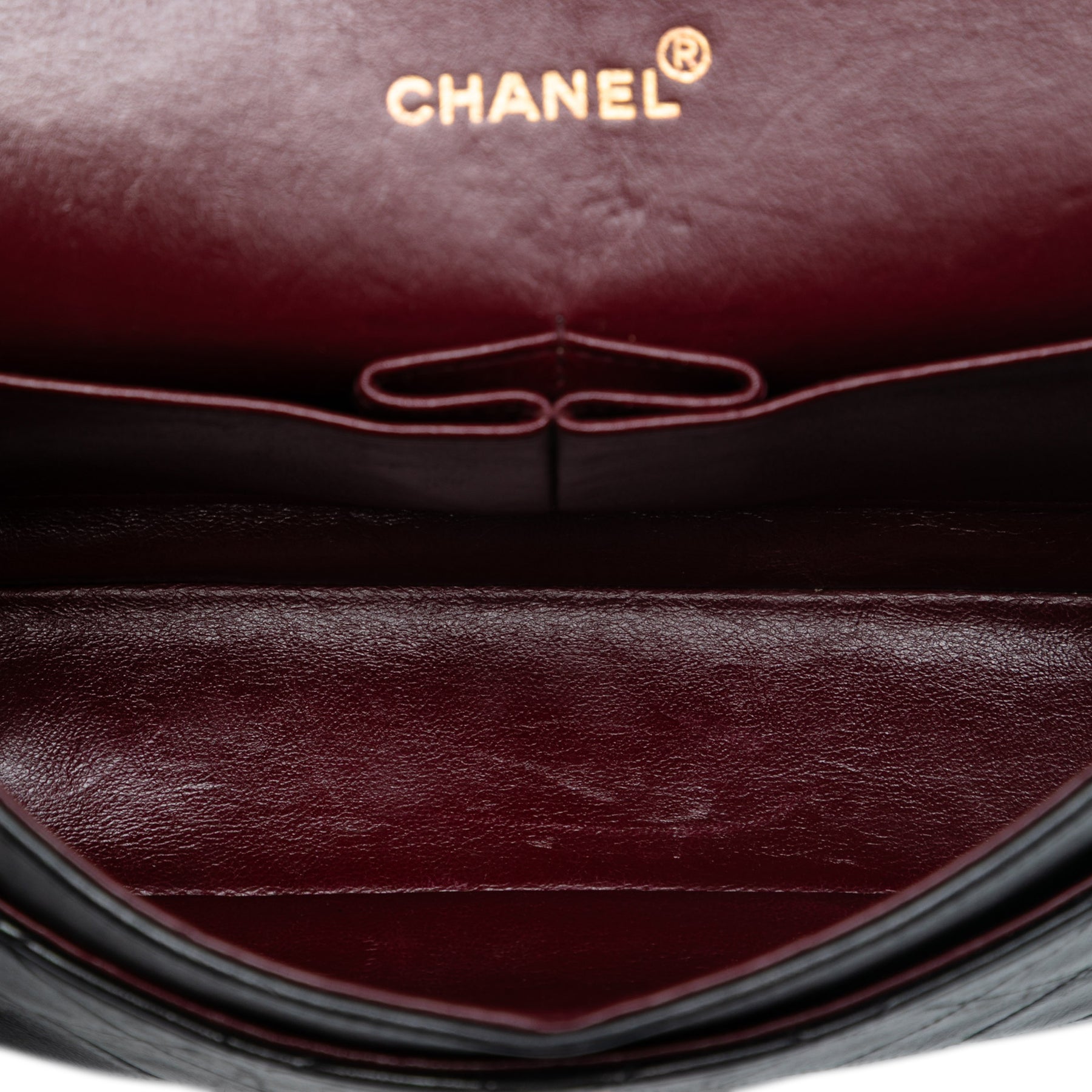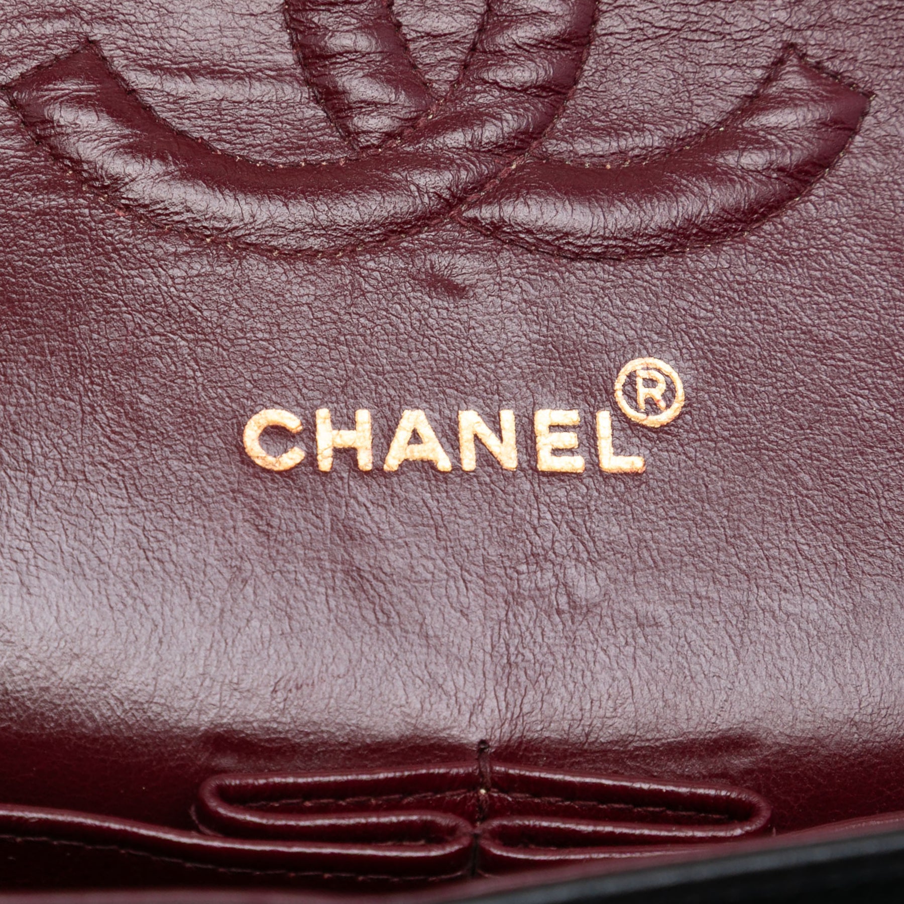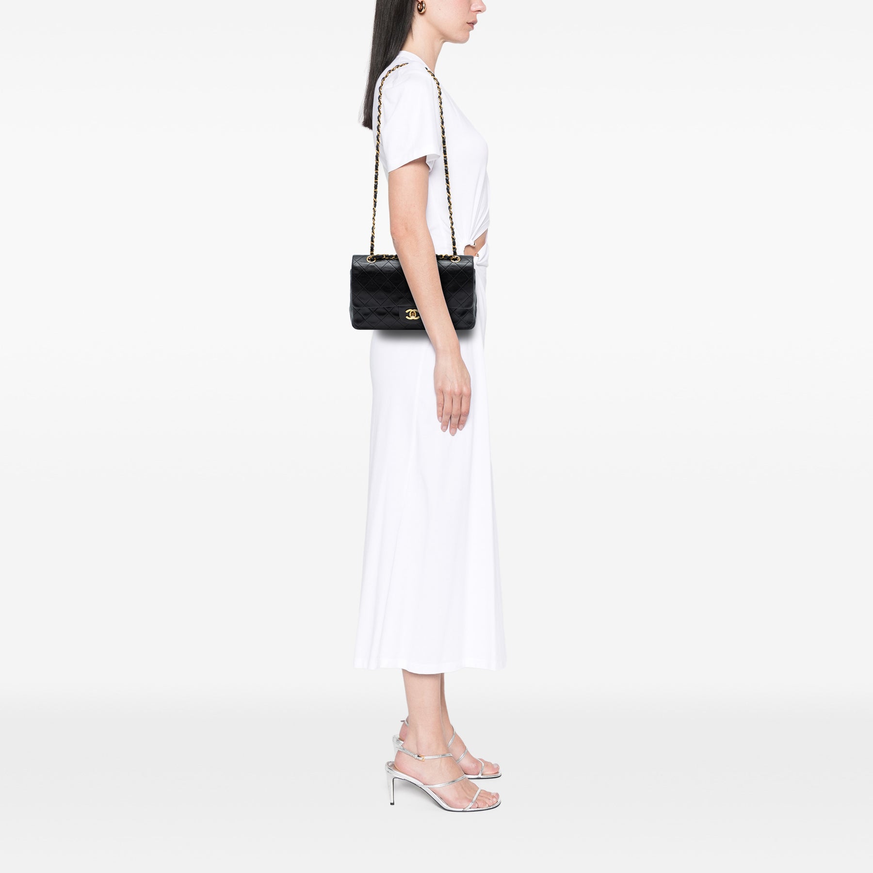 Ce sac bandoulière est confectionné en cuir d'agneau matelassé et présente une poche plaquée extérieure au dos, des bandoulières en chaîne tressée de cuir, un double rabat avant orné du double C entrelacé et d'une fermeture à tourniquet, ainsi que des poches intérieures zippées et plaquées. Il est en bon état.