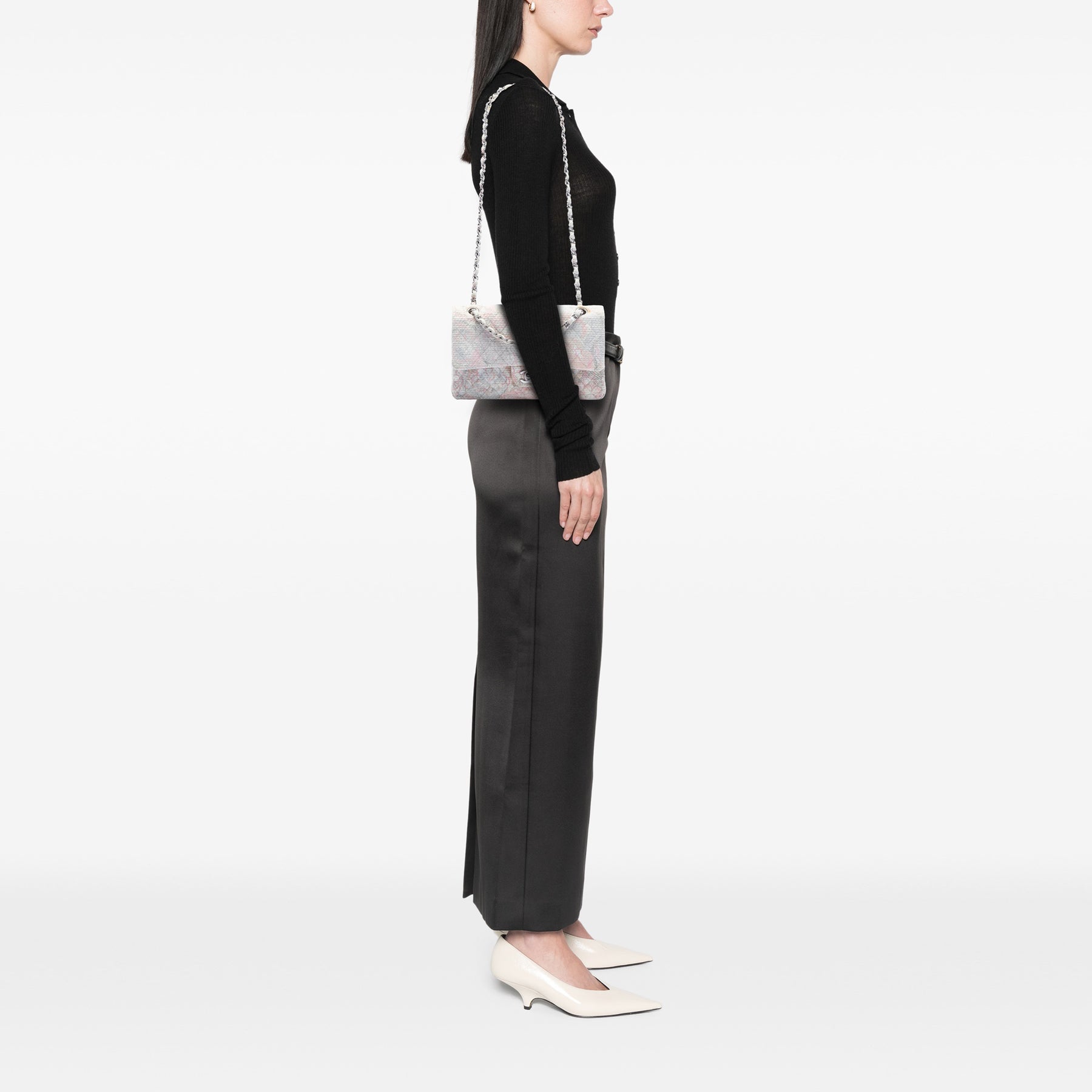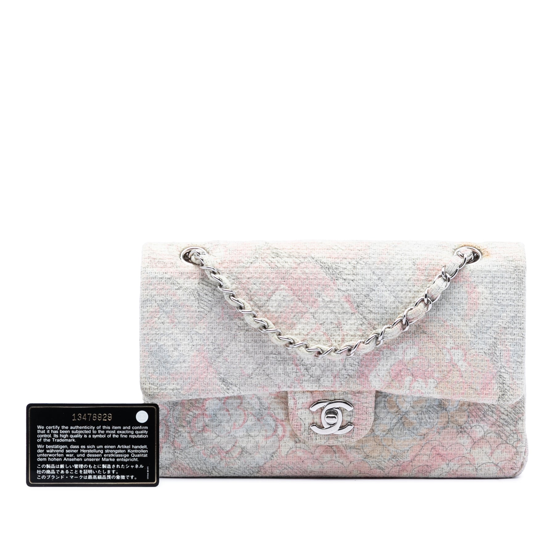 Ce sac à rabat est confectionné en tweed matelassé et présente une bandoulière chaîne en tweed tressé, un double rabat avant orné de C entrelacés et d'une fermeture à tourniquet, une poche plaquée extérieure au dos, ainsi que des poches intérieures zippées et plaquées. Il est en bon état.