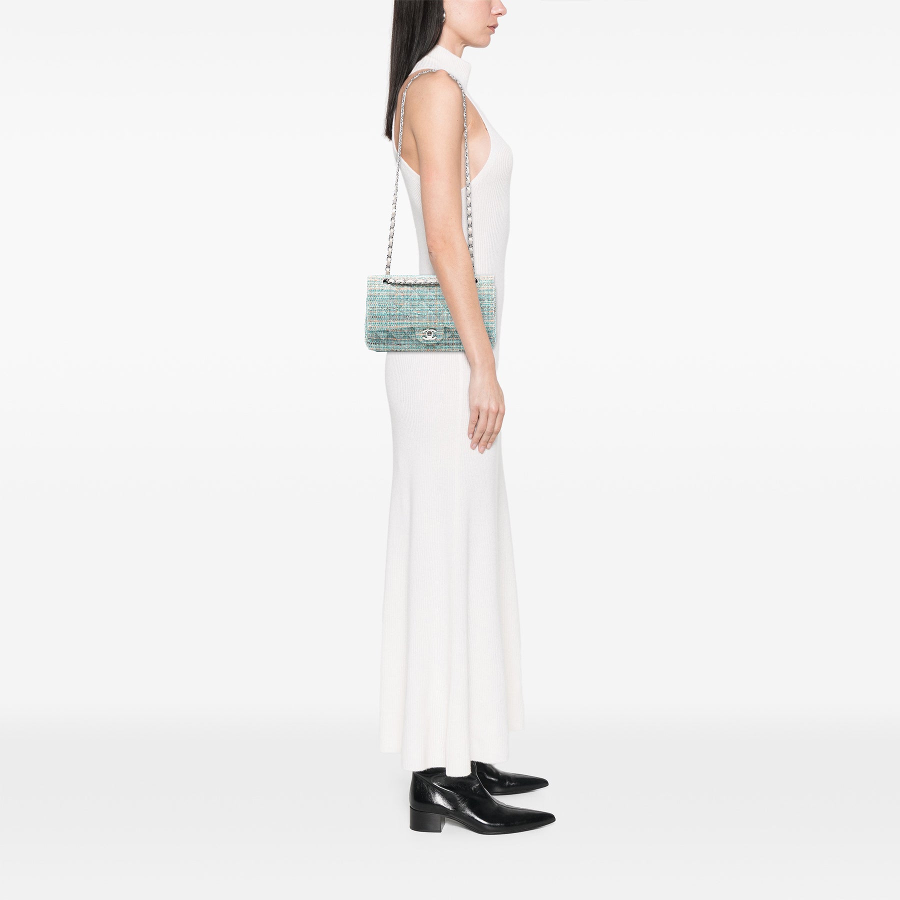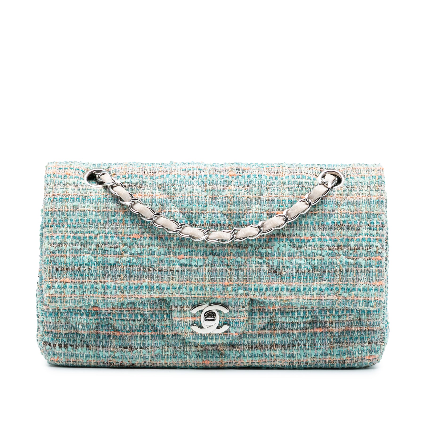Ce sac bandoulière est confectionné en tweed matelassé et possède une bandoulière en chaîne tressée de cuir, un rabat orné du double C et d'une fermeture à tourniquet, une poche plaquée extérieure au dos, ainsi que des poches intérieures zippées et plaquées. Il est en excellent état.