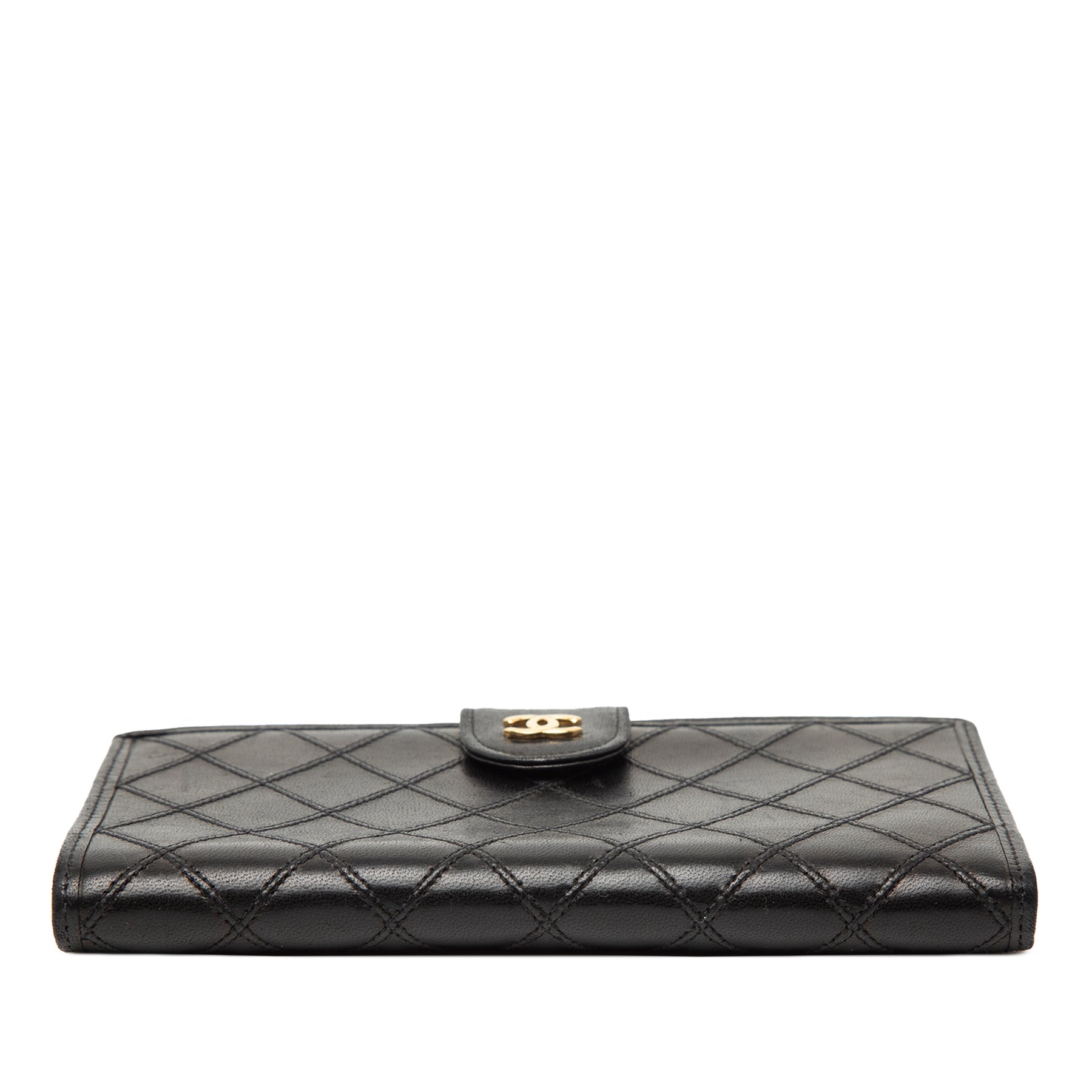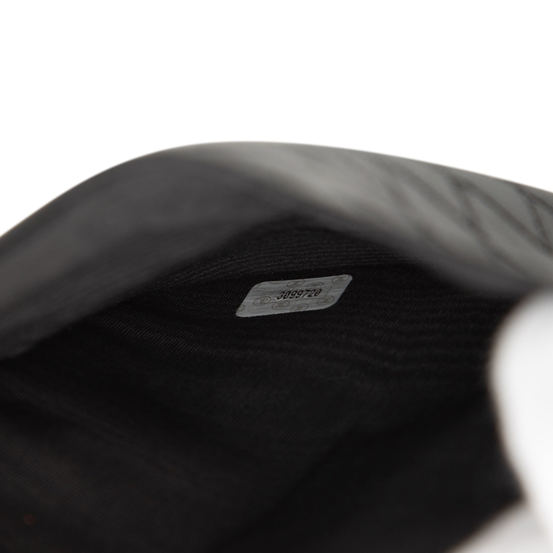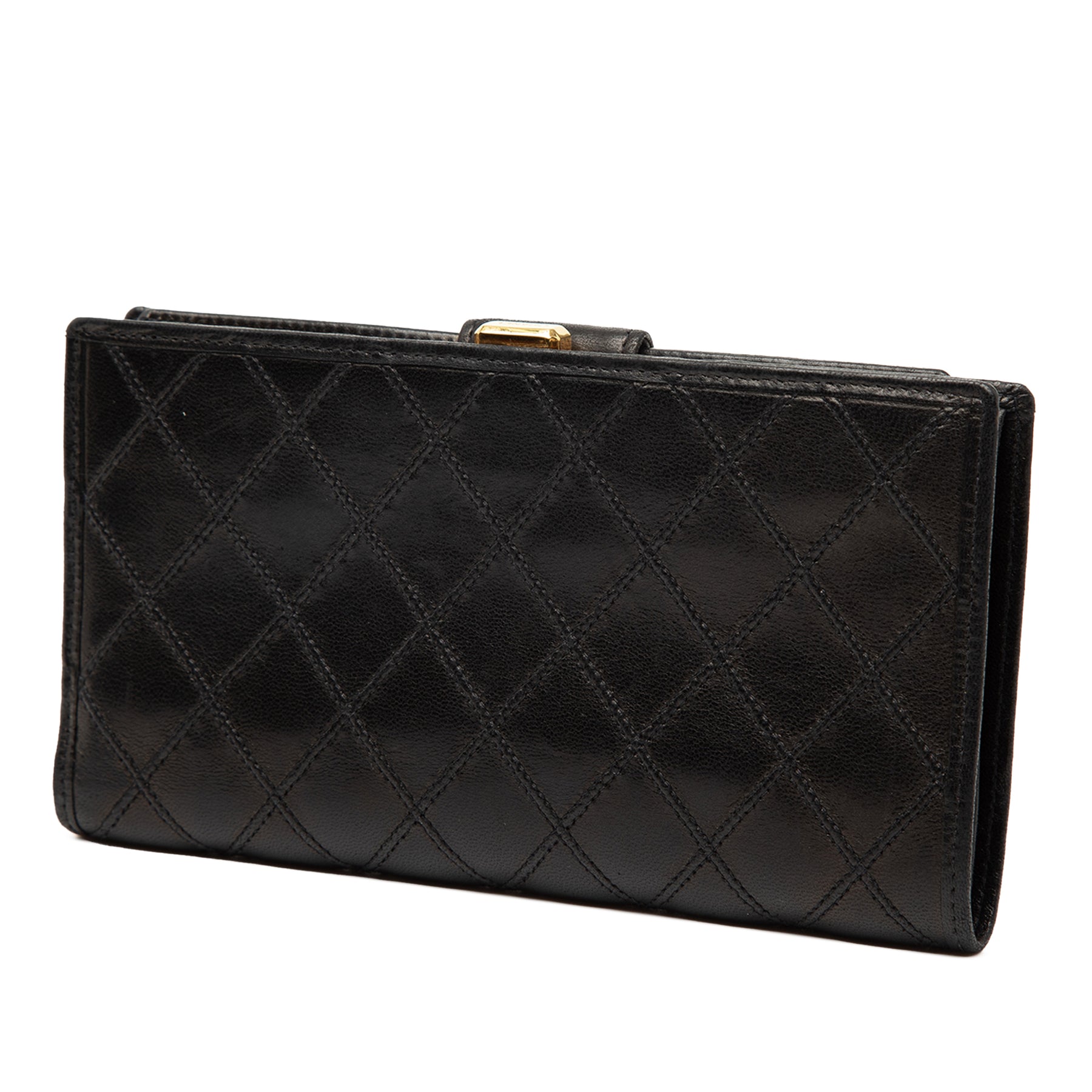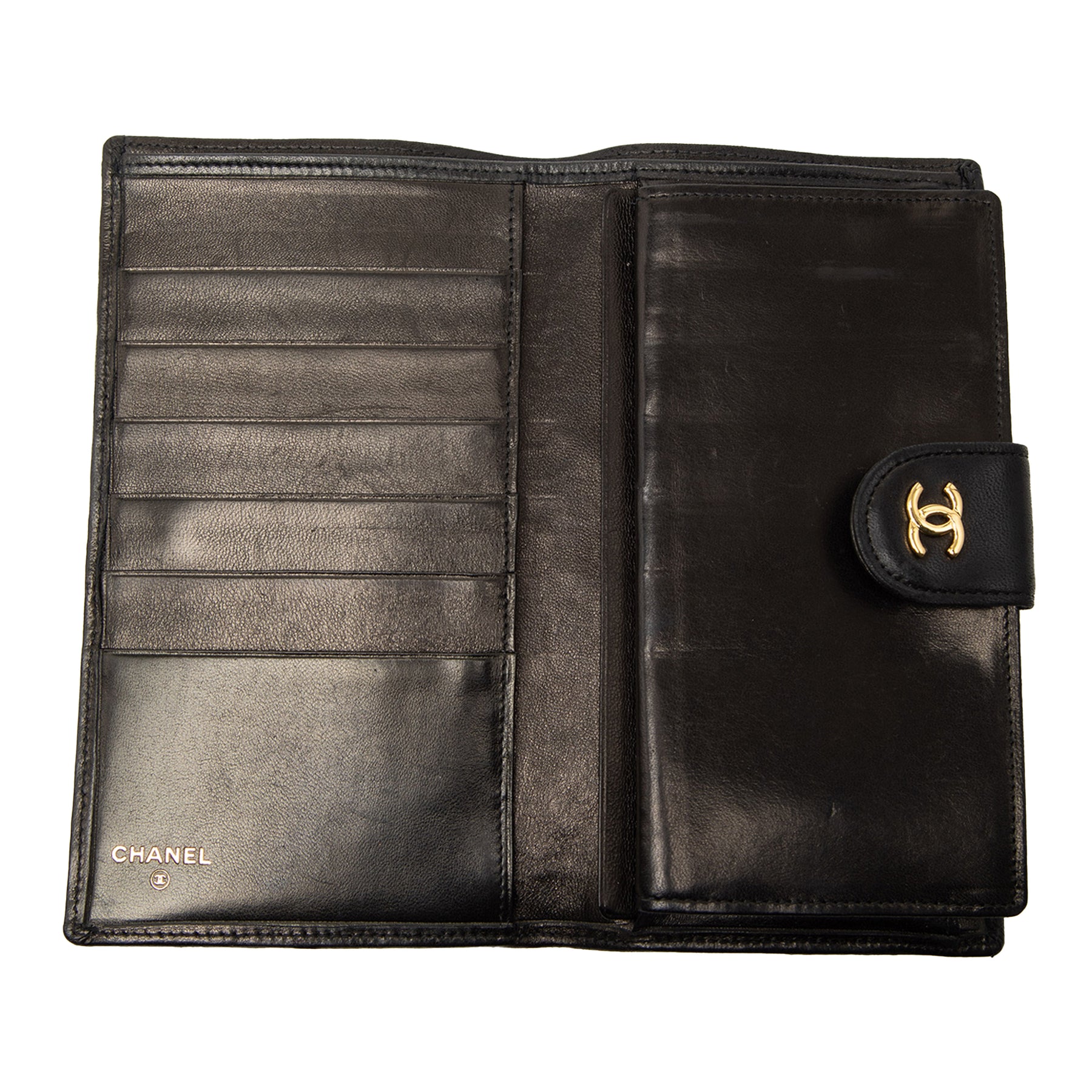 Ce portefeuille long est en cuir d'agneau et possède un rabat à fermeture pression, un compartiment à fermoir baiser, ainsi qu'une poche intérieure plaquée et des fentes pour cartes. Il est en excellent état.