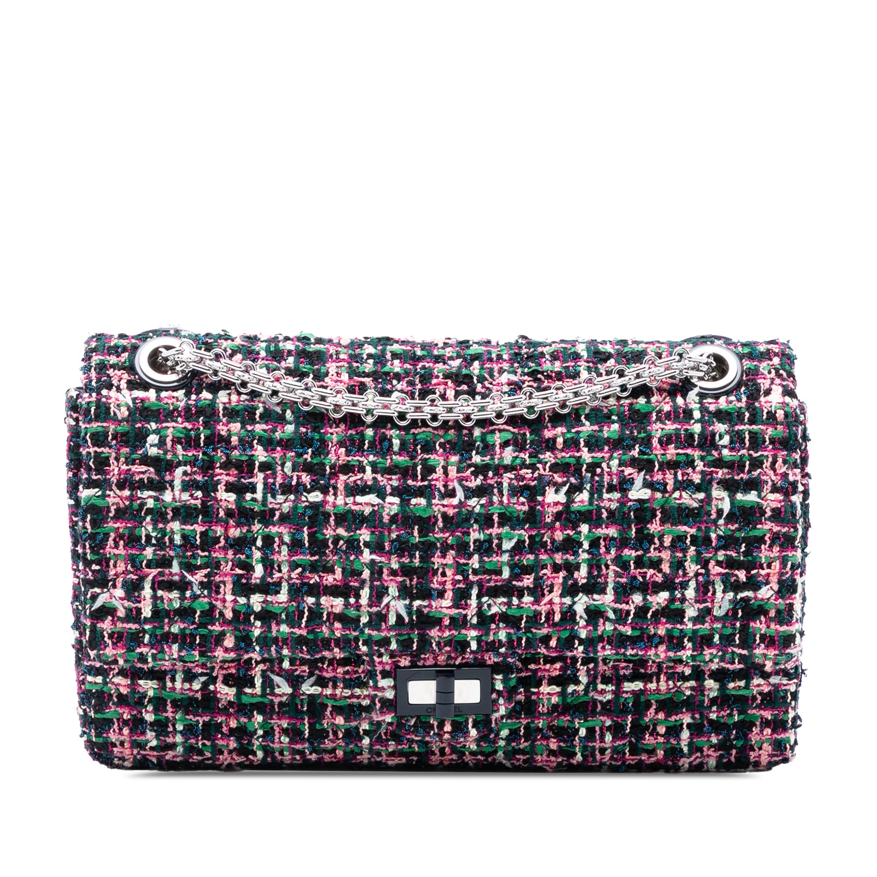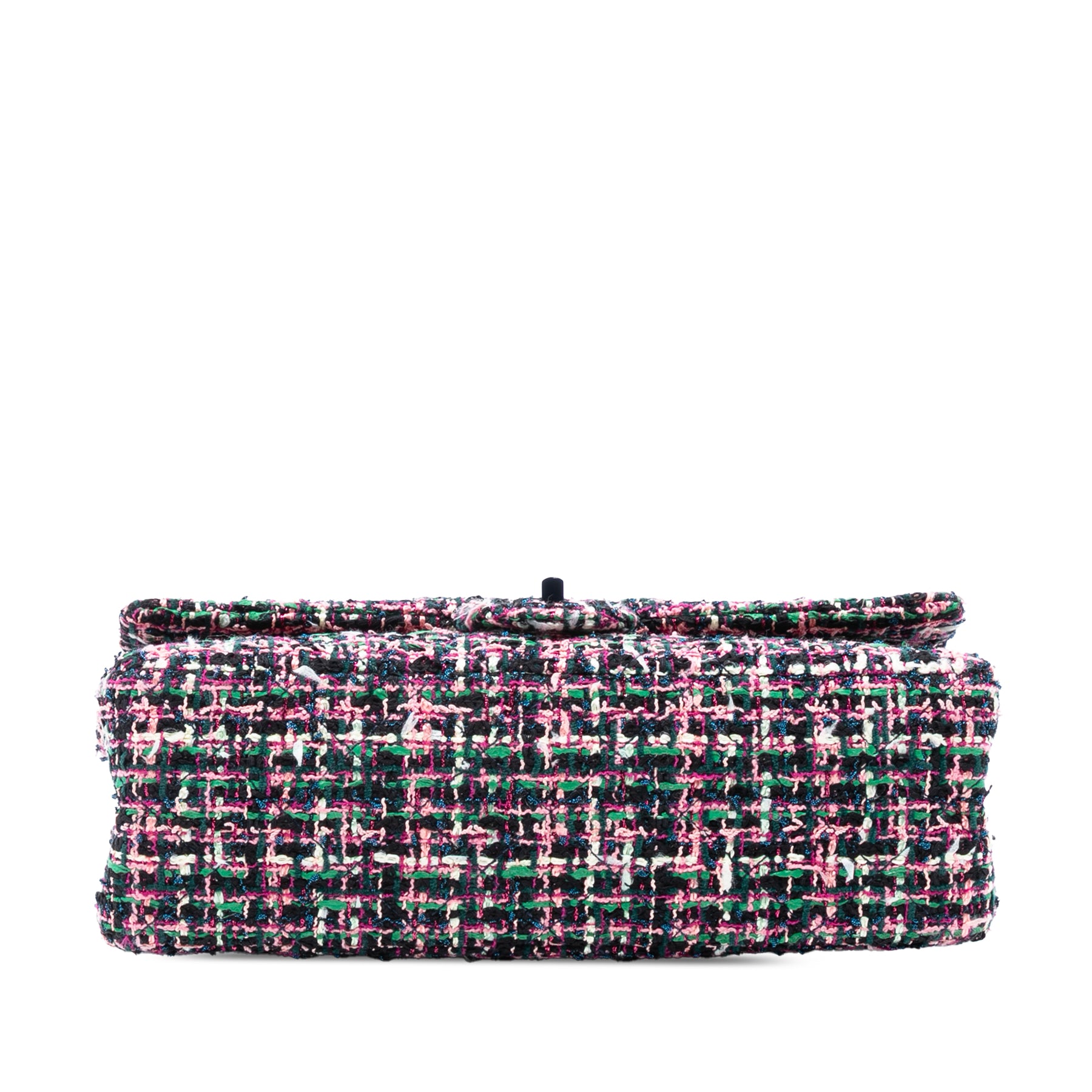 Ce sac bandoulière est confectionné en tweed matelassé et possède une bandoulière chaîne, un double rabat avant avec fermeture à tourniquet, une poche plaquée extérieure au dos, ainsi que des poches intérieures zippées et plaquées. Il est en excellent état.