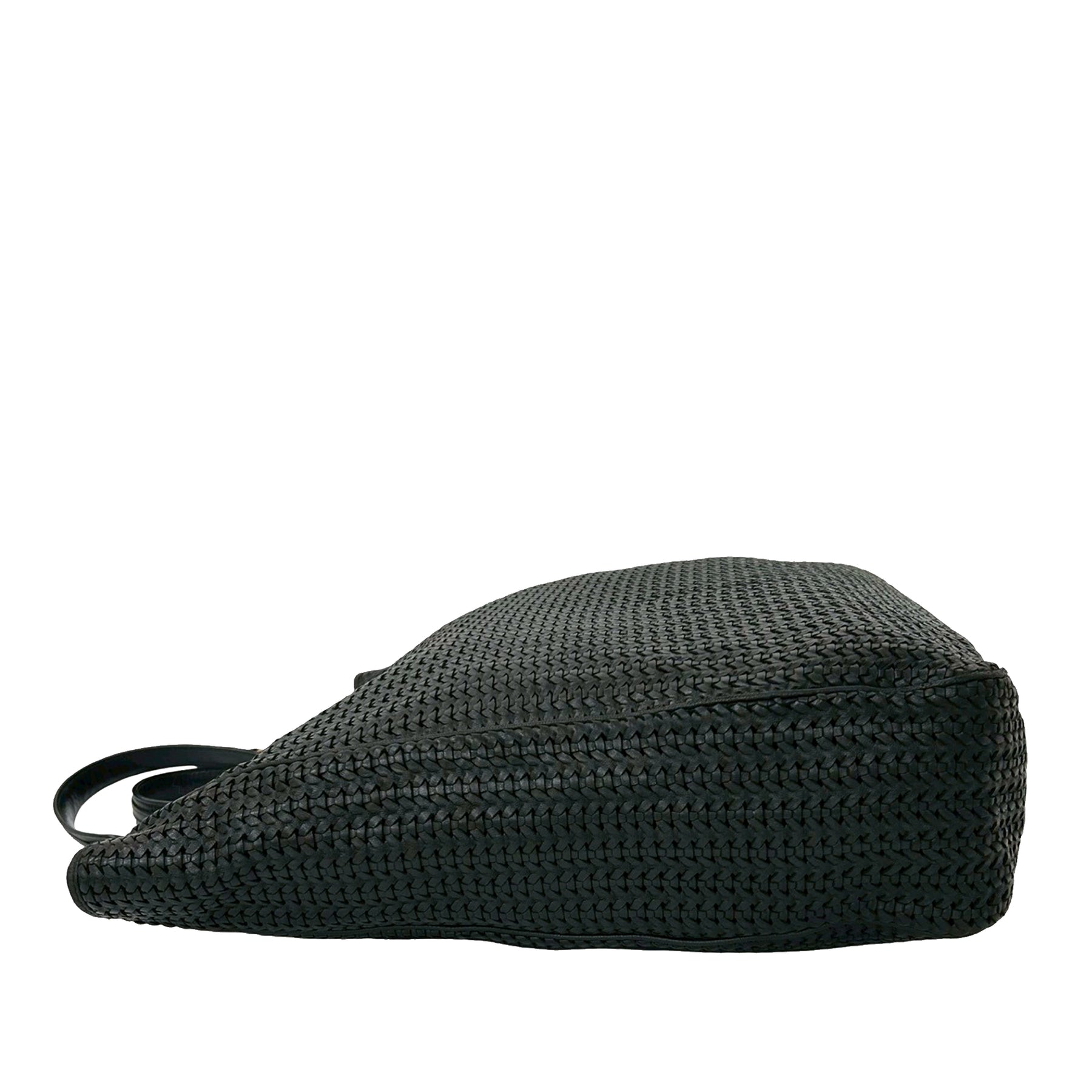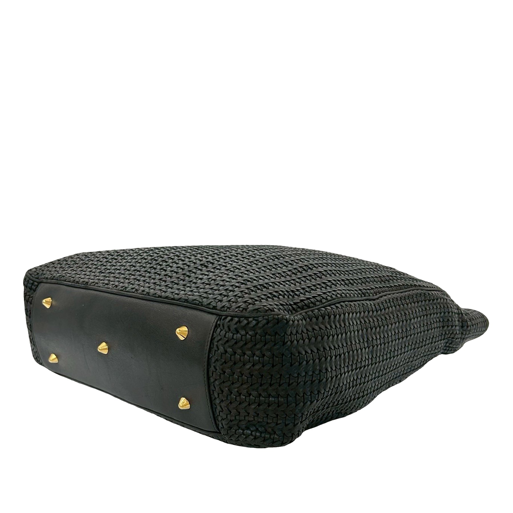 Ce sac cabas est en cuir tressé, possède des anses plates en cuir, une ouverture sur le dessus avec fermeture magnétique, ainsi que des poches intérieures zippées et plaquées. Il est en bon état.