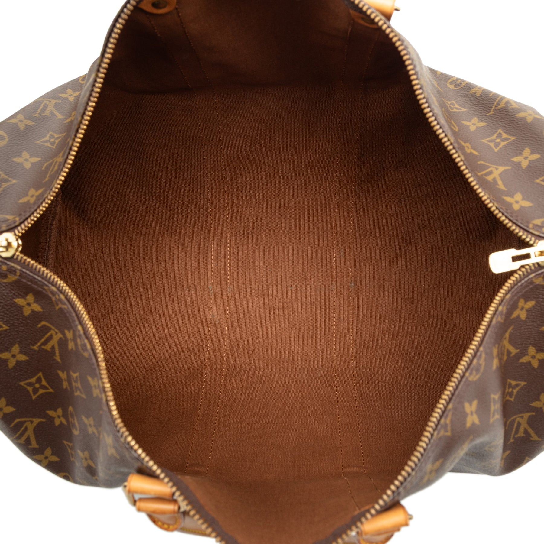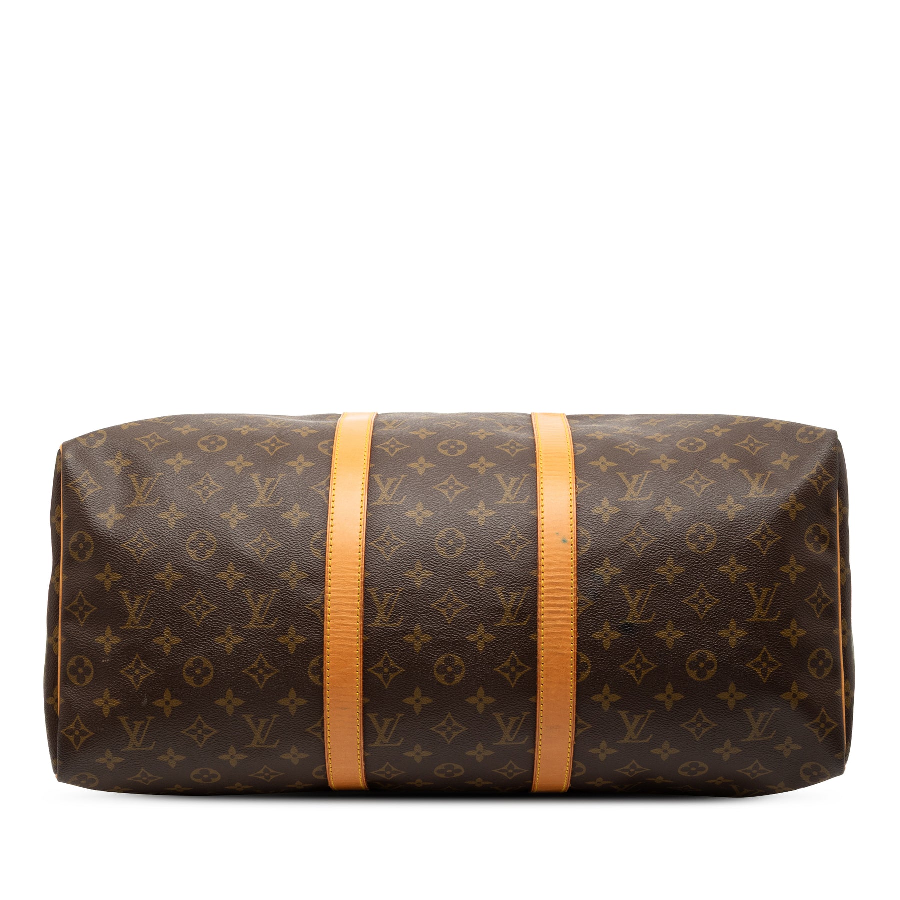 Le sac Keepall 50 est confectionné en toile monogrammée avec des finitions en cuir vachetta, des poignées roulées en cuir vachetta et une fermeture zippée sur le dessus. Il est en bon état.