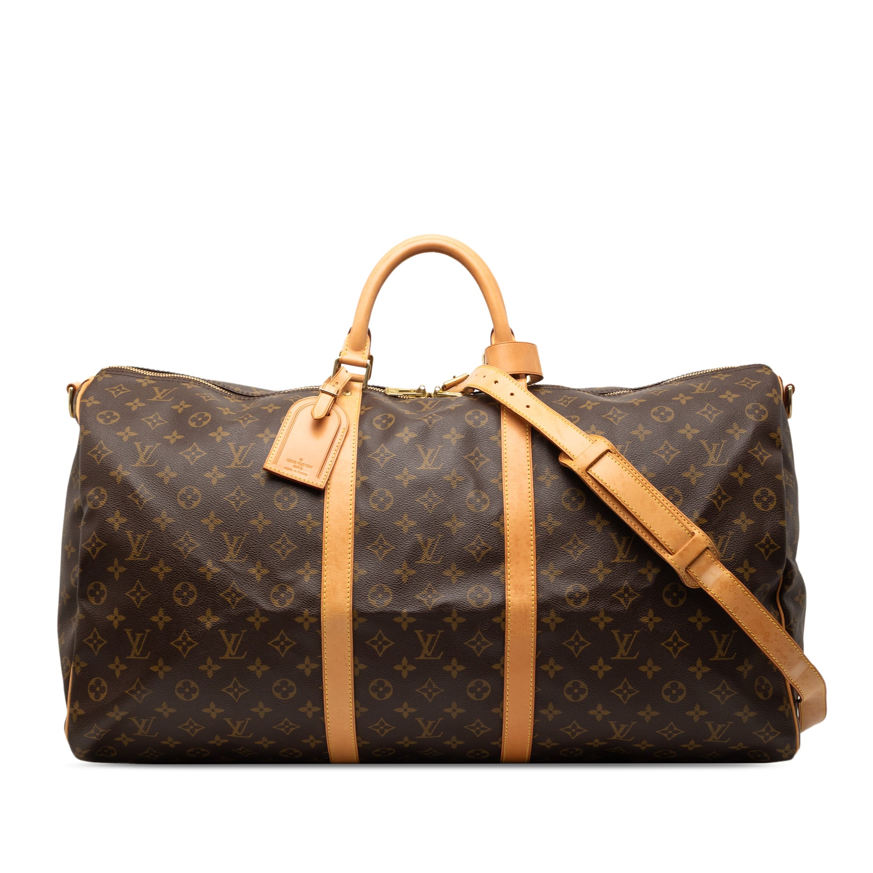 Le sac Keepall Bandoulière 60 est confectionné en toile monogrammée avec des finitions en cuir vachetta, des poignées roulées en cuir vachetta, une bandoulière plate amovible en cuir et une fermeture zippée sur le dessus. Il est en bon état.