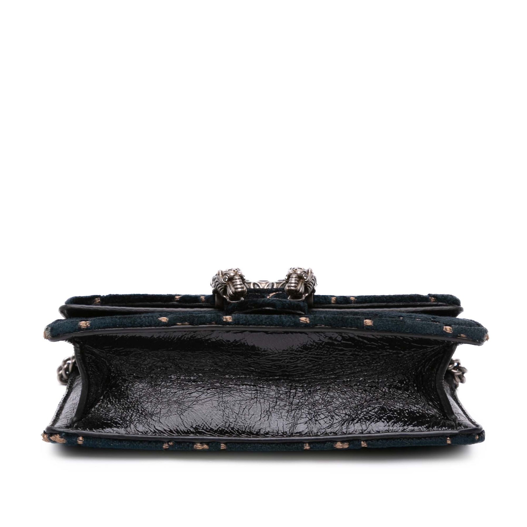 Le sac Dionysus est en velours avec des finitions en cuir, une bandoulière en chaîne argentée et un rabat à pression. Il est en bon état.