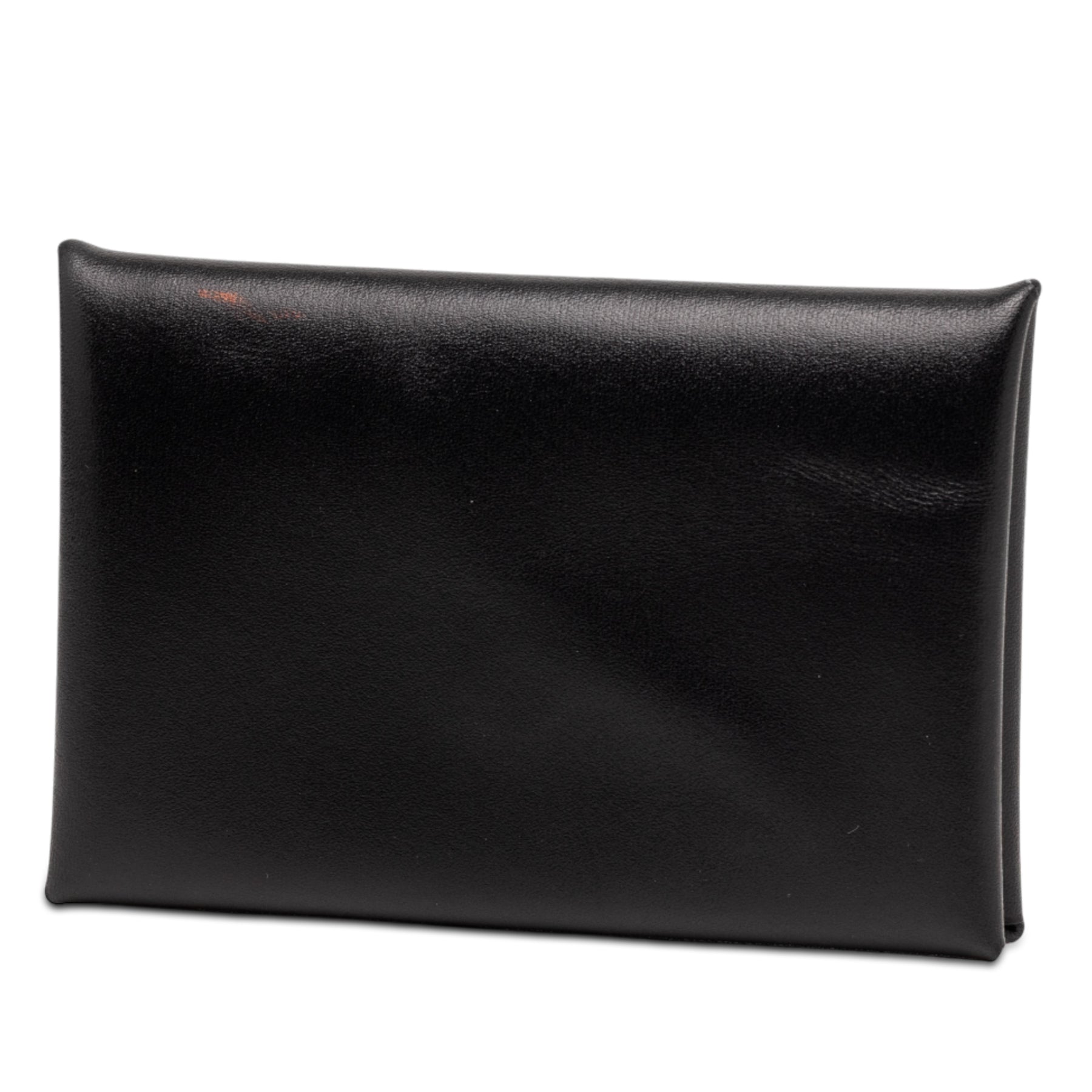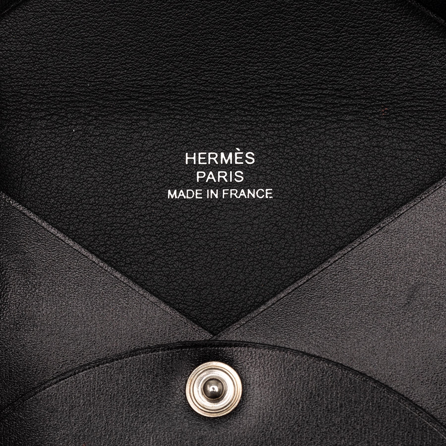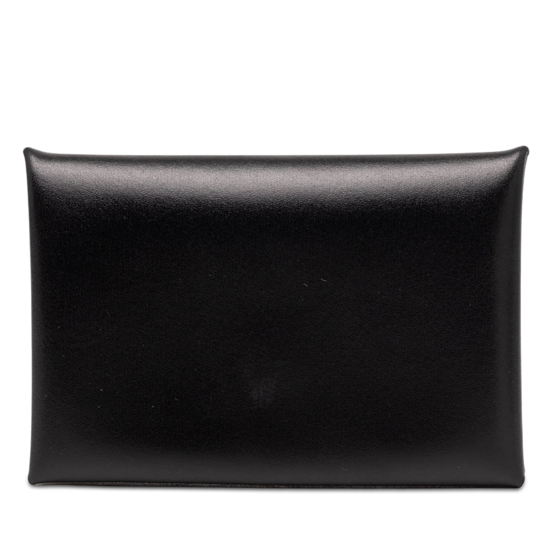 Ce porte-cartes est confectionné en cuir de veau box noir, avec une fermeture à bouton-pression et des poches intérieures plaquées. Il est en bon état.