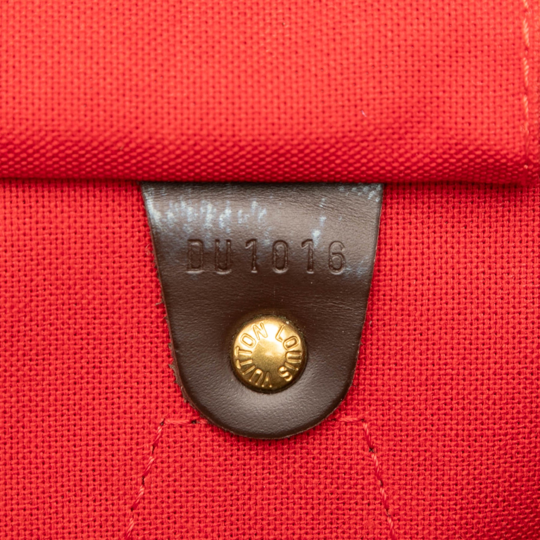 Le Speedy 30 est confectionné en toile Damier Ébène avec des finitions en cuir, des anses roulées en cuir, une fermeture zippée sur le dessus et une poche intérieure plaquée. Il est en excellent état.