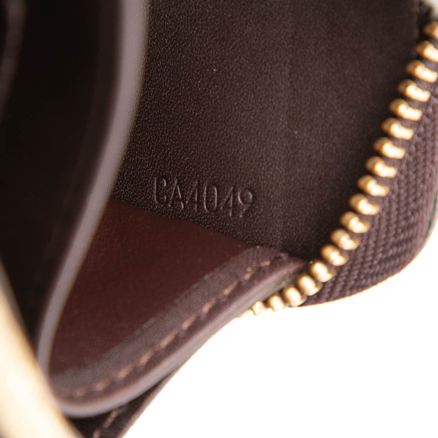Ce portefeuille long est confectionné en cuir verni monogrammé et possède une fermeture zippée, ainsi que des poches intérieures zippées et plaquées. Il est en bon état.