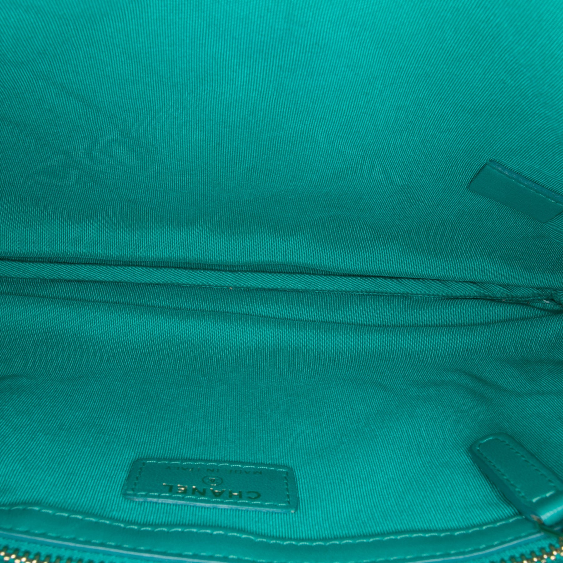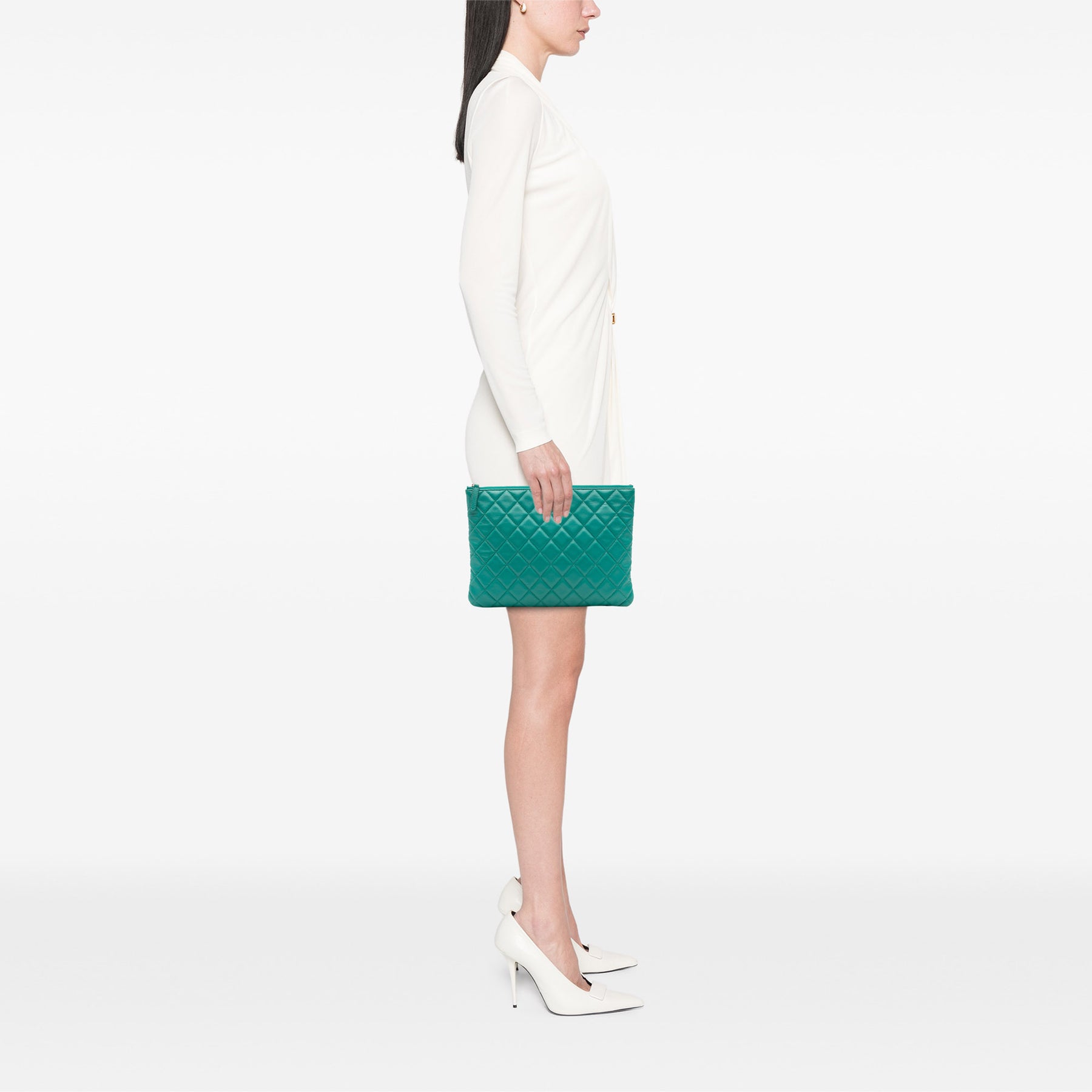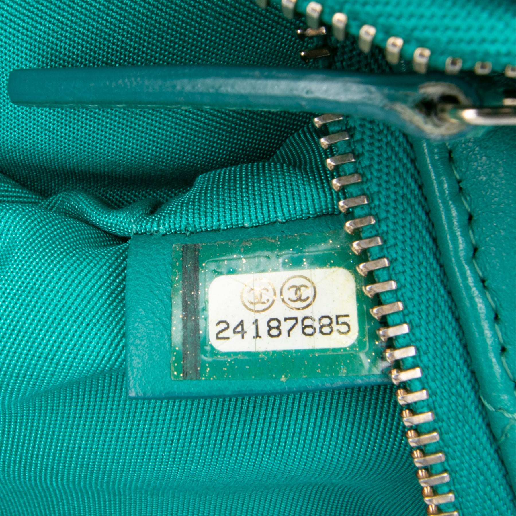 Cette pochette est en cuir d'agneau matelassé et se ferme par une fermeture éclair sur le dessus. Elle est en bon état.