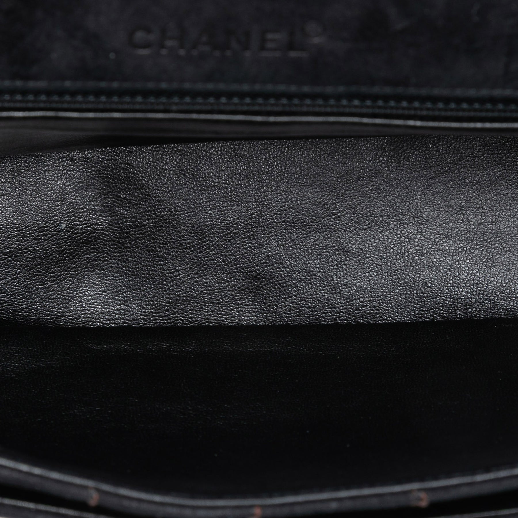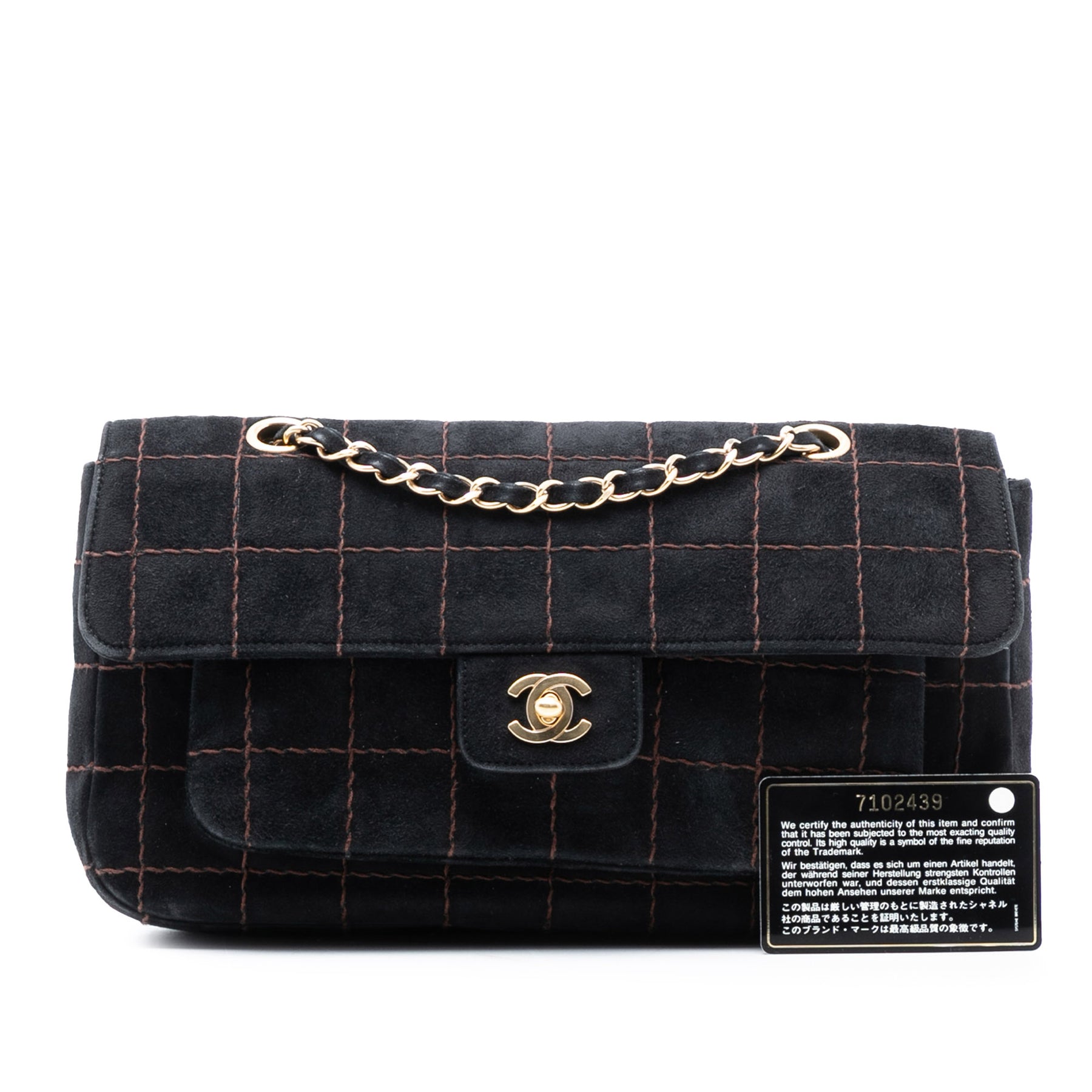 Ce sac bandoulière est confectionné en cuir suédé matelassé et possède des bandoulières en chaîne tressée de cuir, un rabat avant avec fermeture à tourniquet, une poche plaquée extérieure au dos, ainsi que des poches intérieures zippées et plaquées. Il est en bon état.