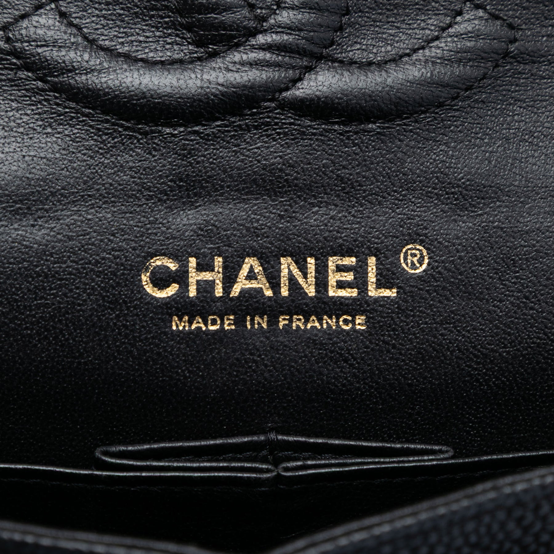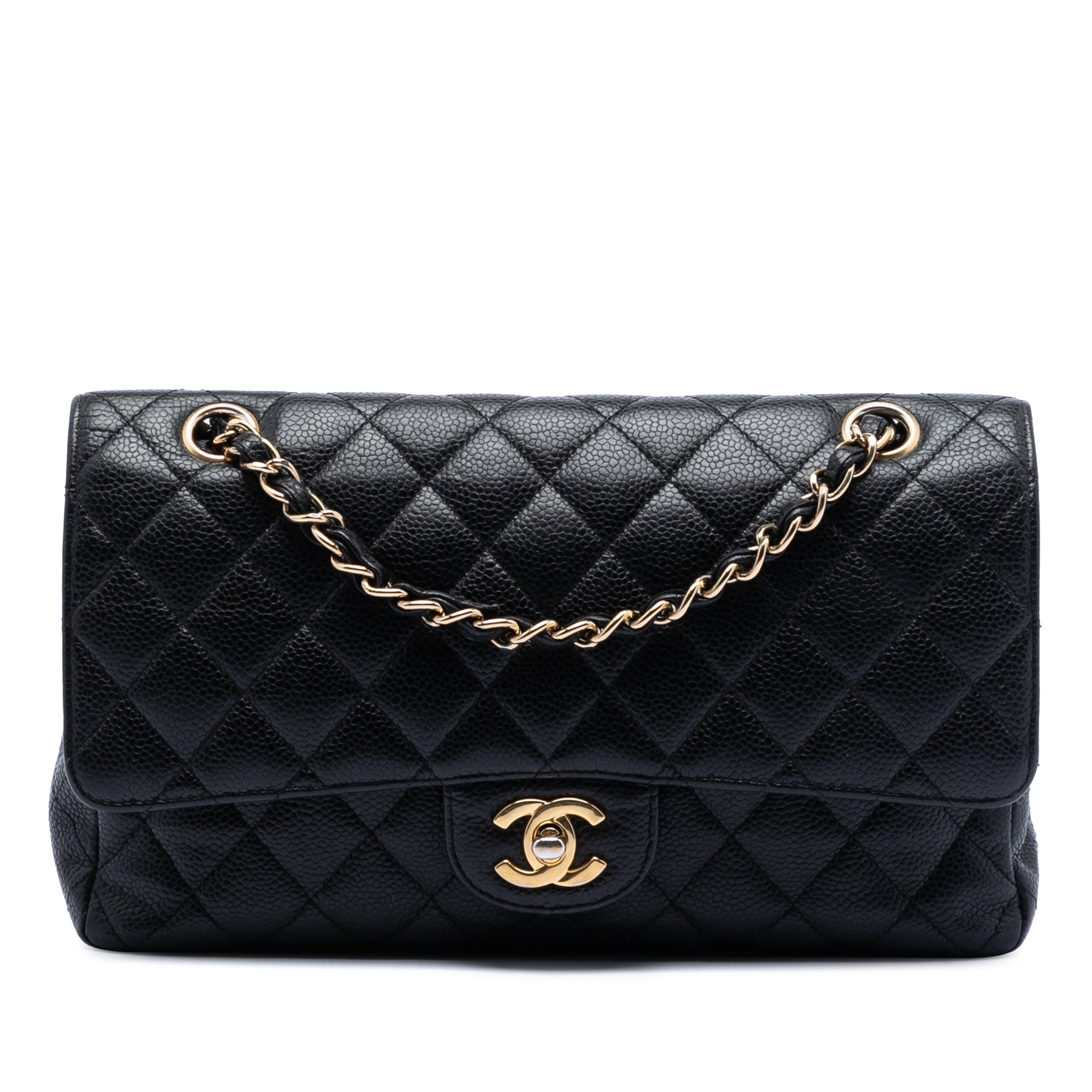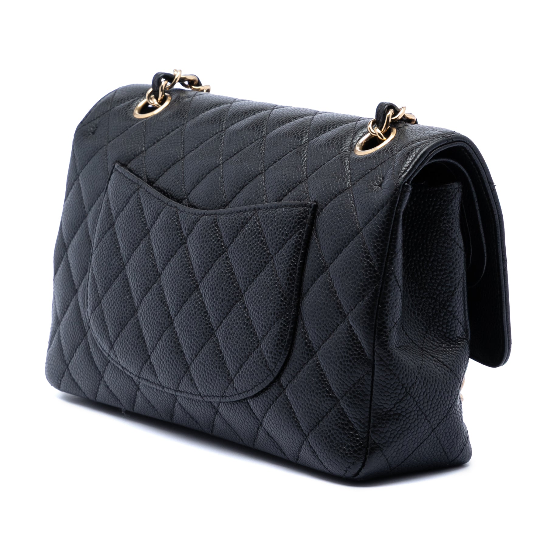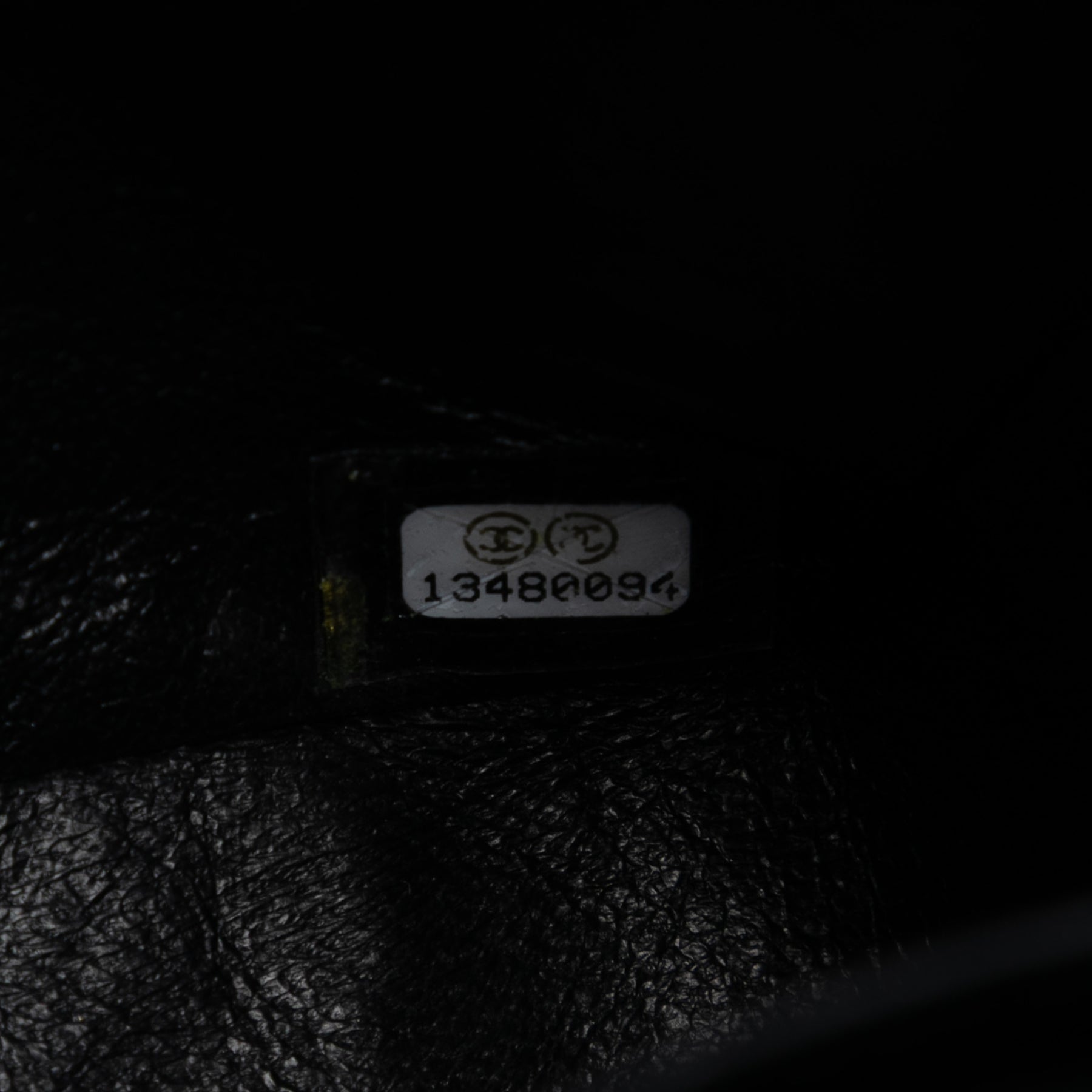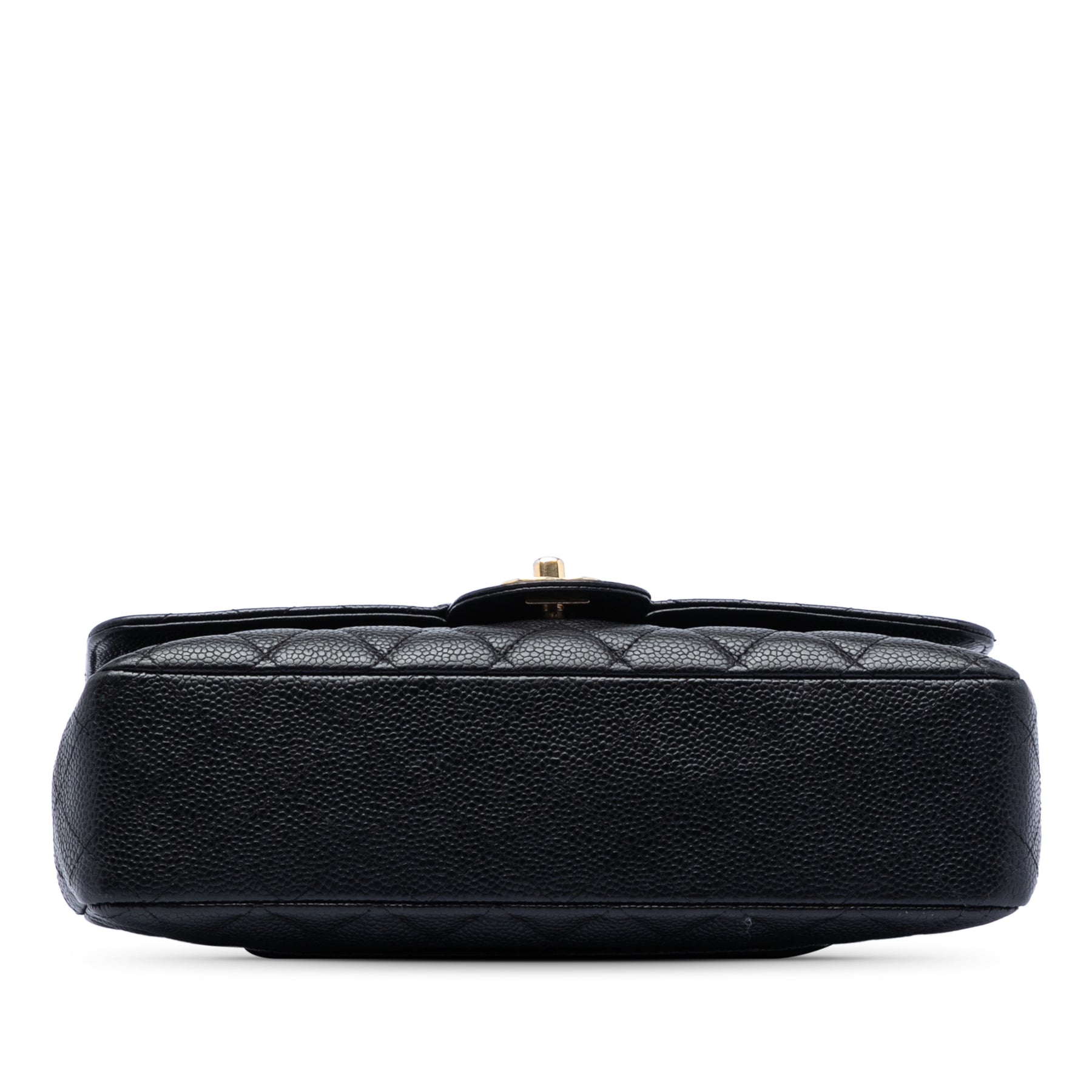 Ce sac bandoulière est confectionné en cuir caviar matelassé et présente une bandoulière en chaîne tressée de cuir, un double rabat avant avec fermoir CC, une poche plaquée extérieure au dos et des poches plaquées intérieures. Il est en excellent état.