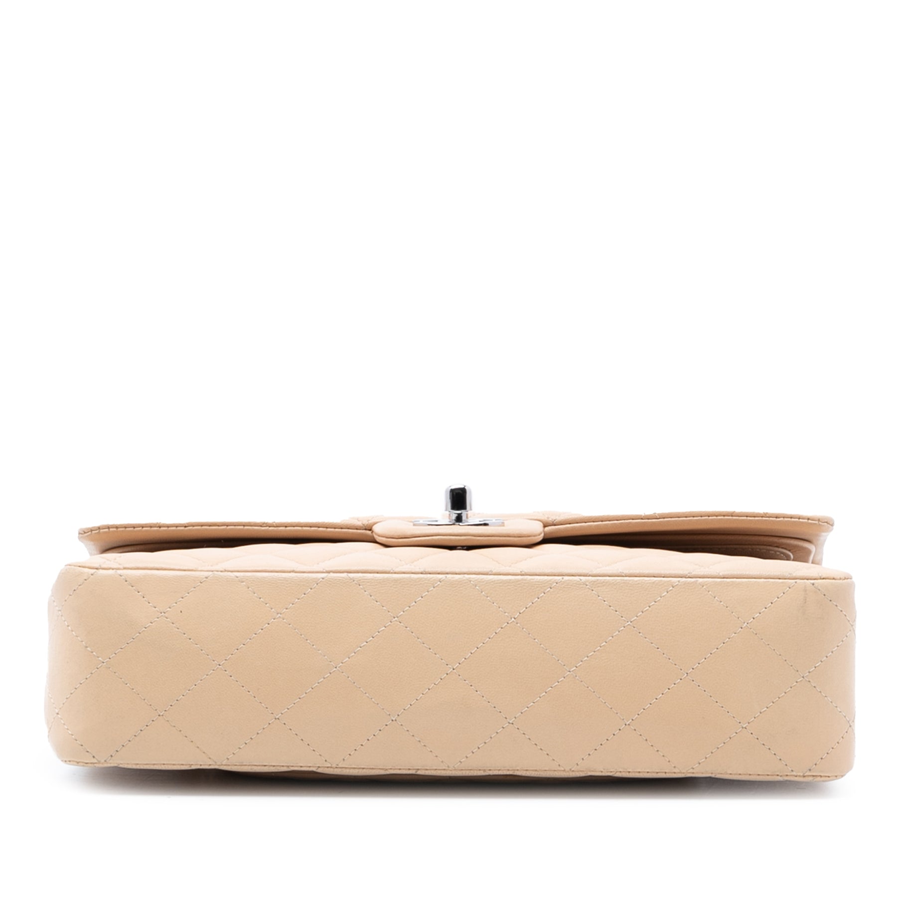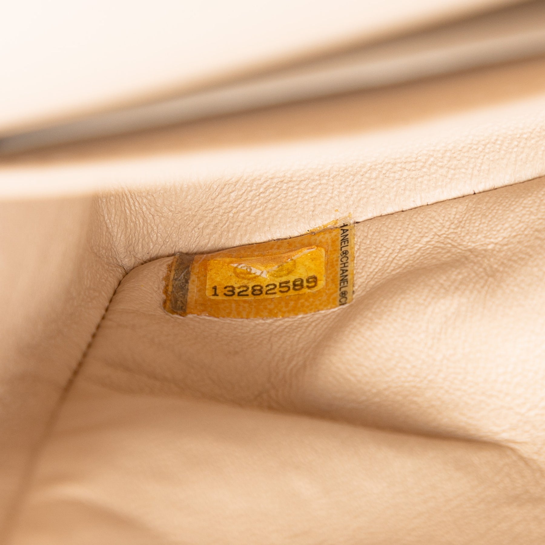 Ce sac bandoulière est confectionné en cuir d'agneau matelassé et présente des bandoulières en chaîne tressée de cuir, un double rabat avant orné du double C entrelacé et d'une fermeture à tourniquet, une poche plaquée extérieure au dos, ainsi que des poches intérieures zippées et plaquées. Les coins ont été repeints. Il est en bon état.