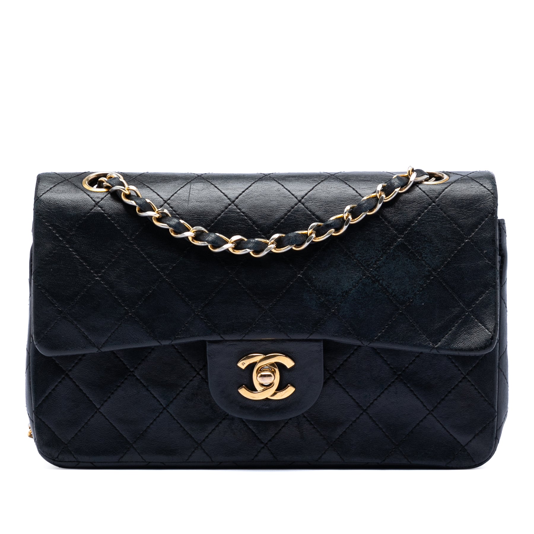 Ce sac bandoulière est confectionné en cuir d'agneau matelassé et possède une bandoulière en chaîne tressée de cuir, un double rabat avant orné du double C entrelacé et d'une fermeture à tourniquet, une poche plaquée extérieure au dos, ainsi que des poches intérieures zippées et plaquées. Il est en bon état.