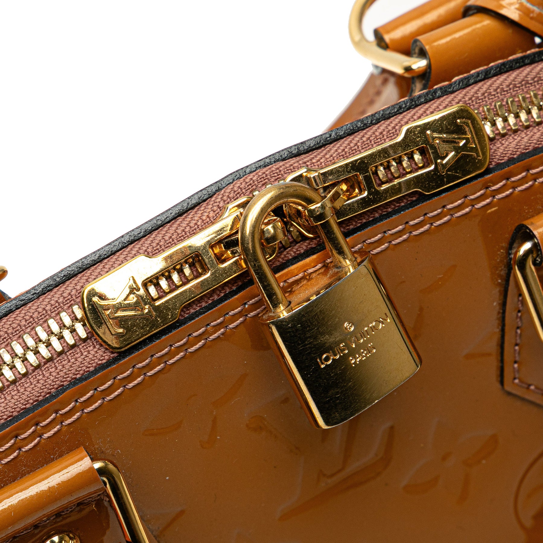 Le sac Alma BB est confectionné en cuir verni monogrammé et possède des anses roulées en cuir, une bandoulière plate amovible, une fermeture zippée sur le dessus, une clochette et une poche intérieure plaquée. Il est en bon état.
