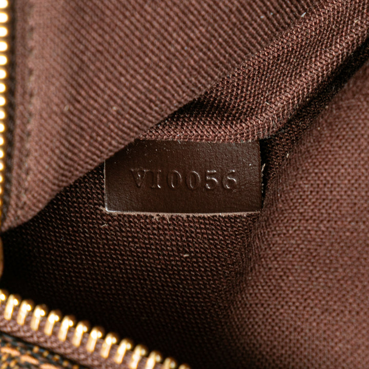 Le Melville est doté d'un corps en toile Damier Ébène, d'une bandoulière plate réglable en toile, d'une fermeture zippée sur le dessus et de poches extérieures zippées à l'avant et à l'arrière. Il est en bon état.