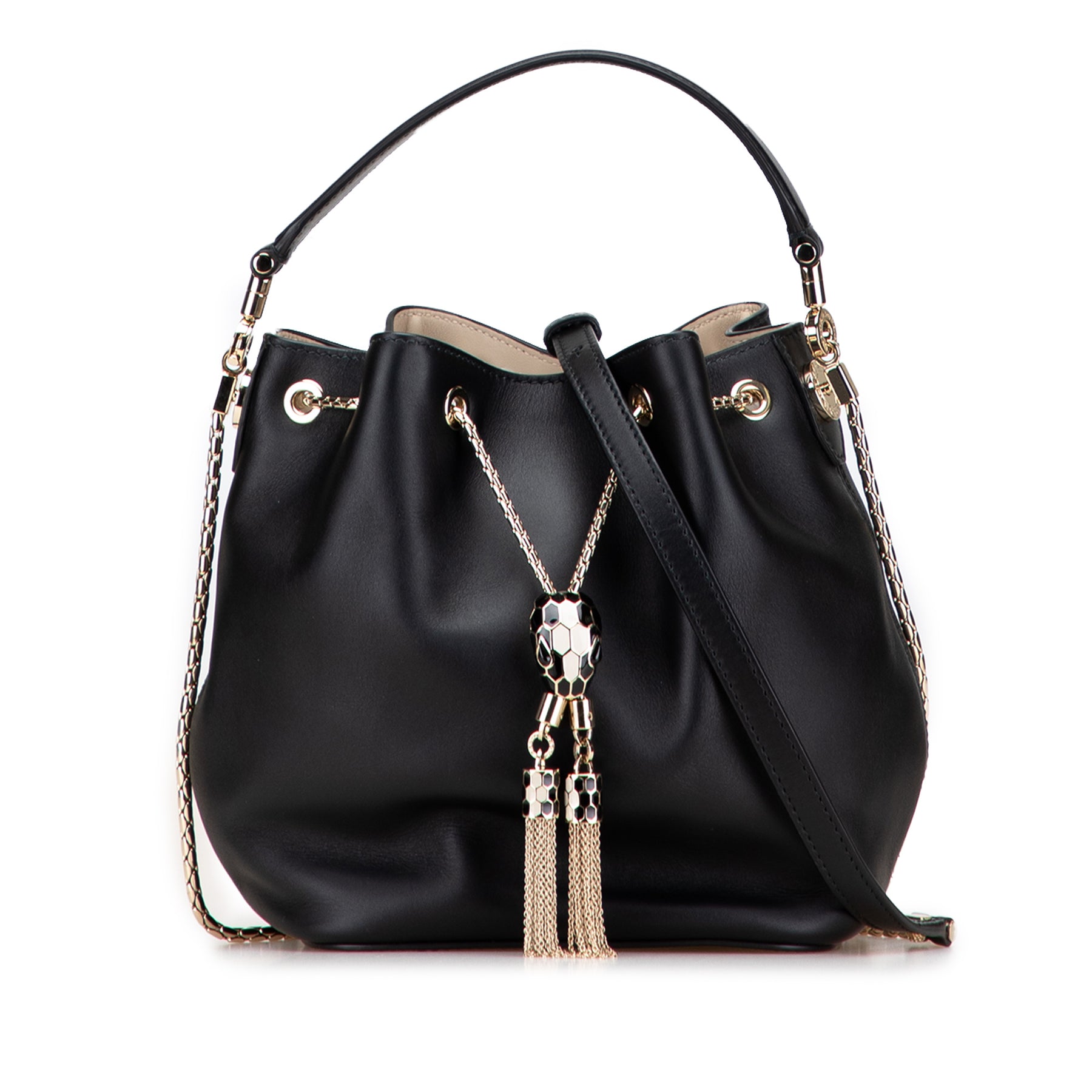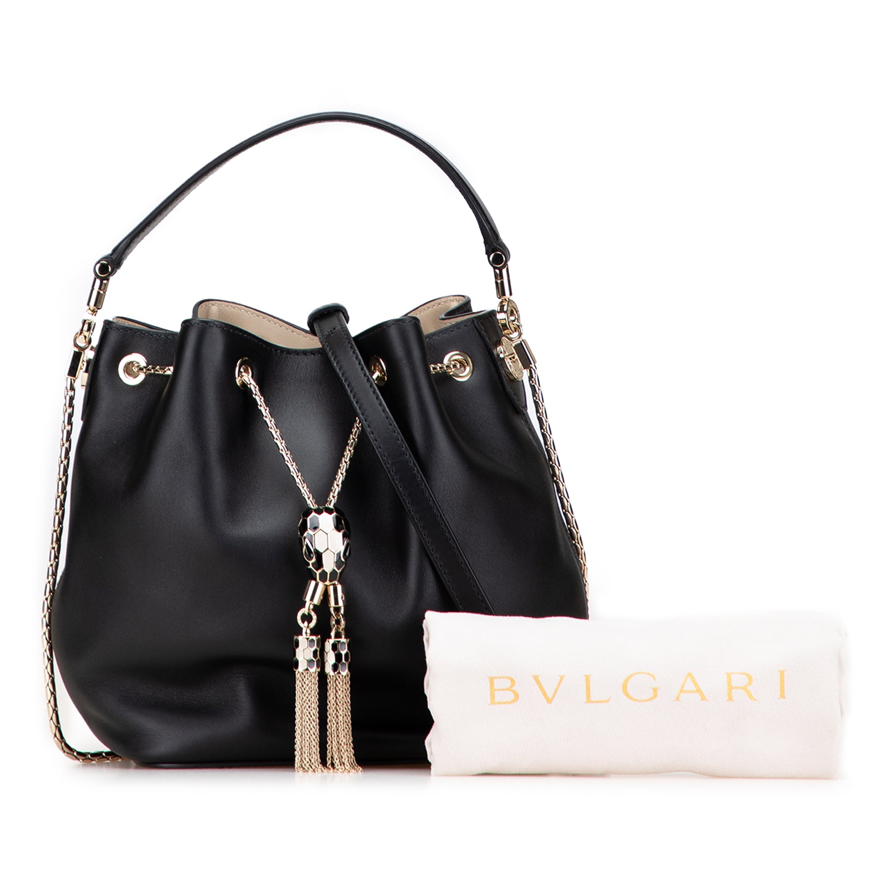 Ce sac seau est doté d'un corps en cuir, d'une poignée plate en cuir, d'une bandoulière réglable en cuir et chaîne, d'un dessus ouvert avec fermeture par cordon de serrage en forme de tête de serpent émaillée et d'une poche intérieure. Il est en excellent état.
