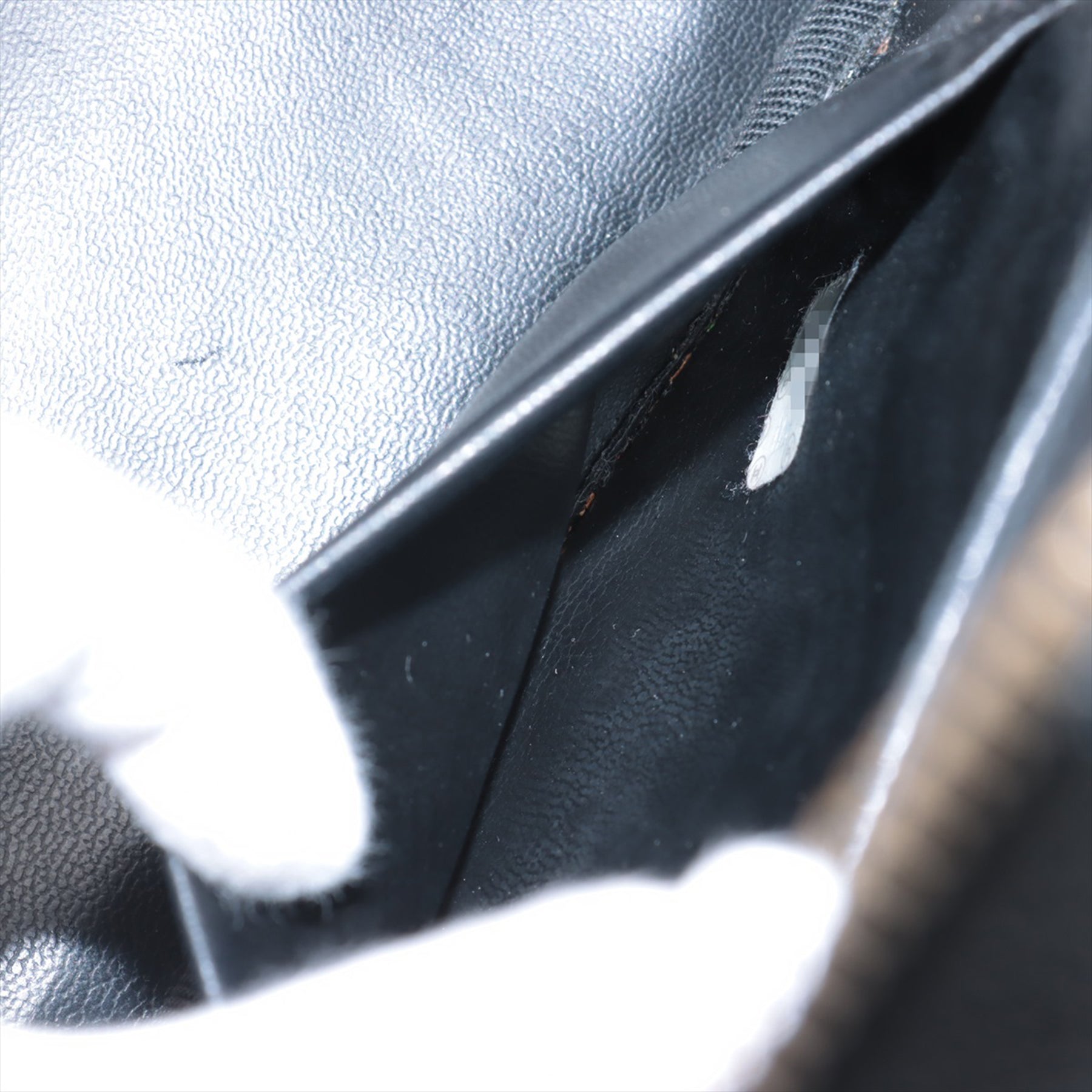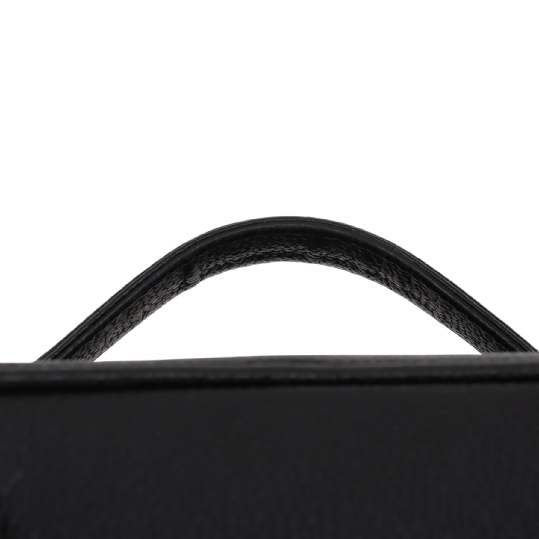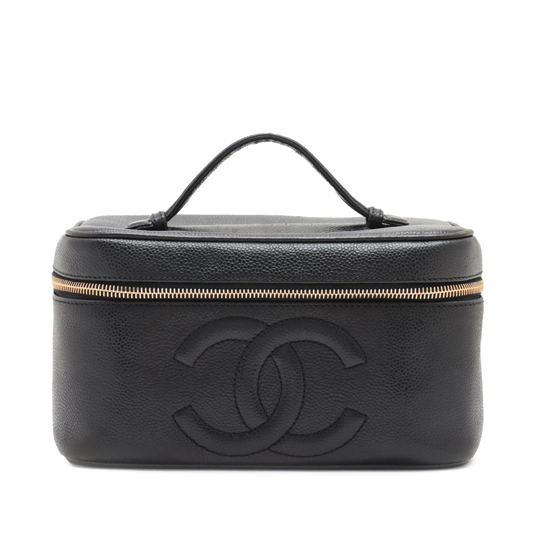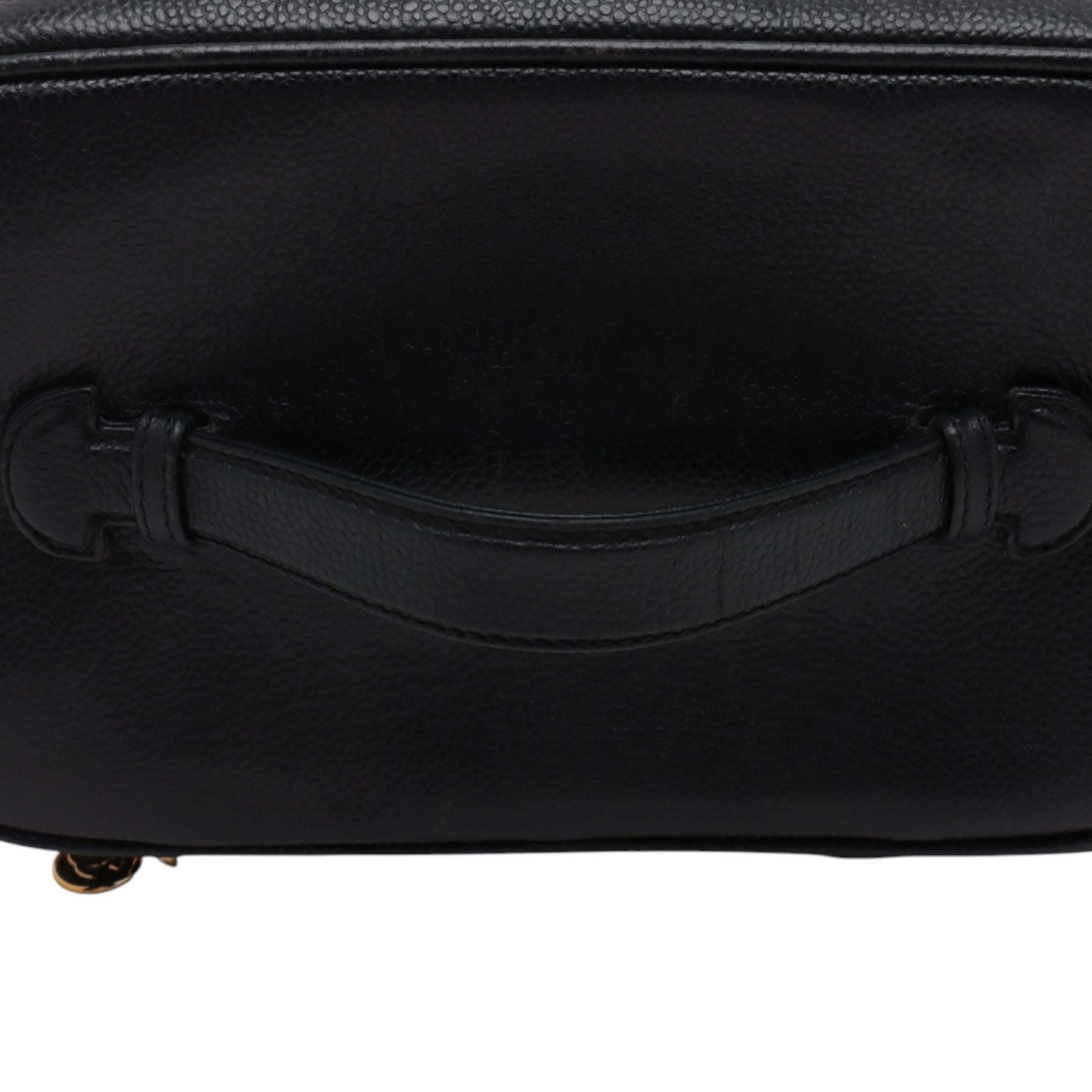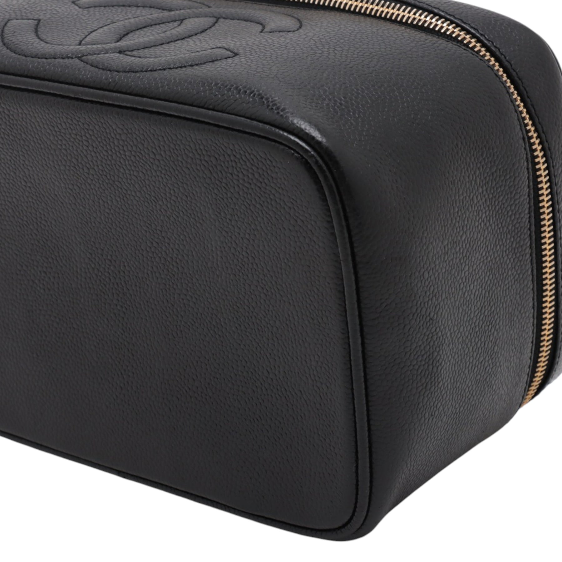 Cette trousse de toilette est en cuir caviar et possède une poignée plate, une fermeture zippée et une poche intérieure plaquée. Elle est en bon état.